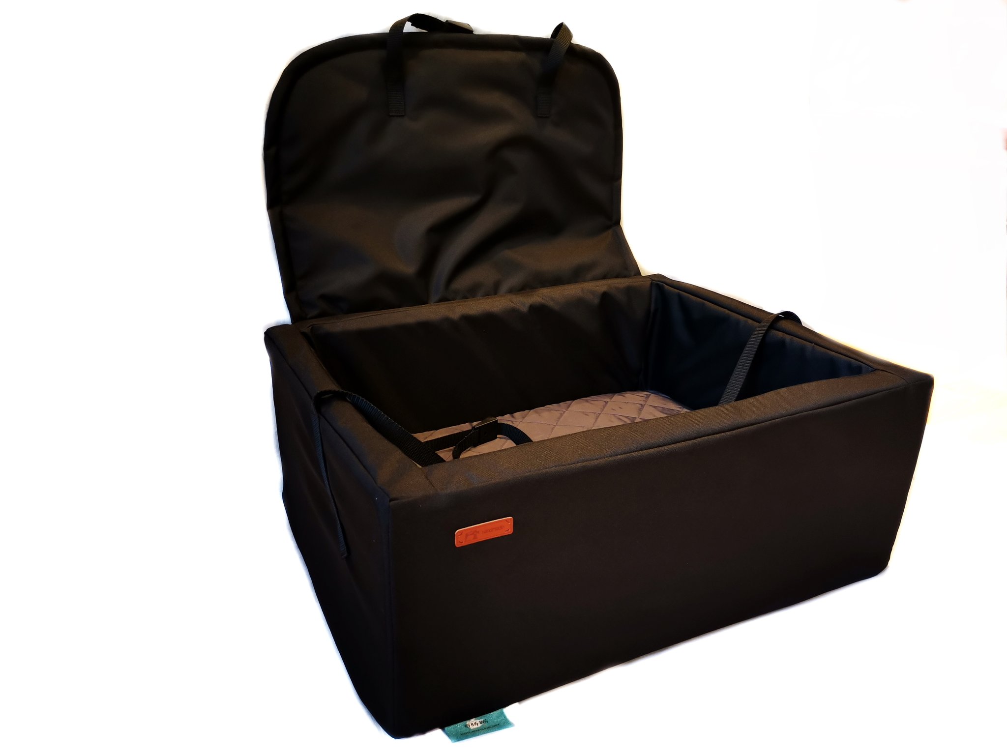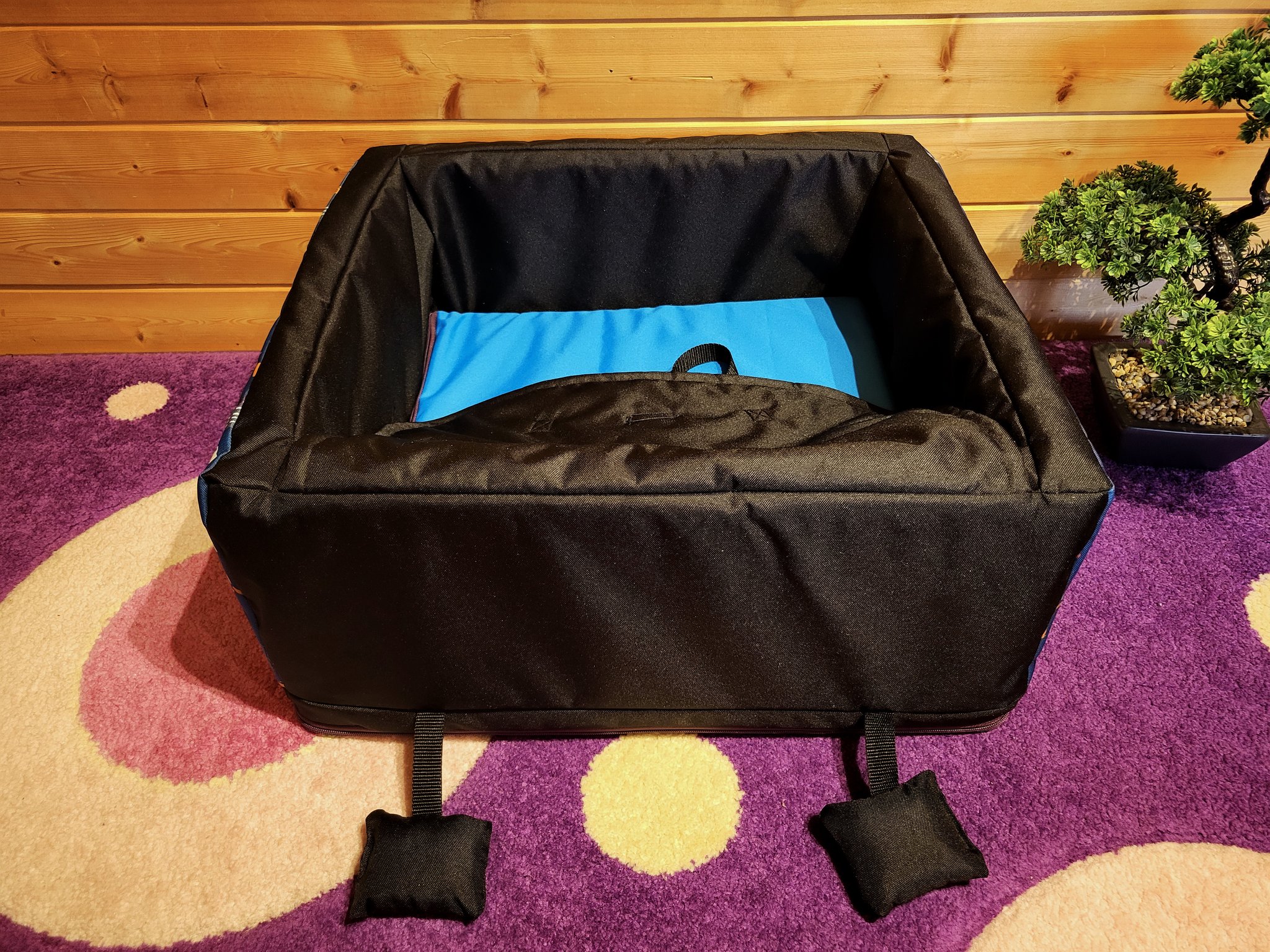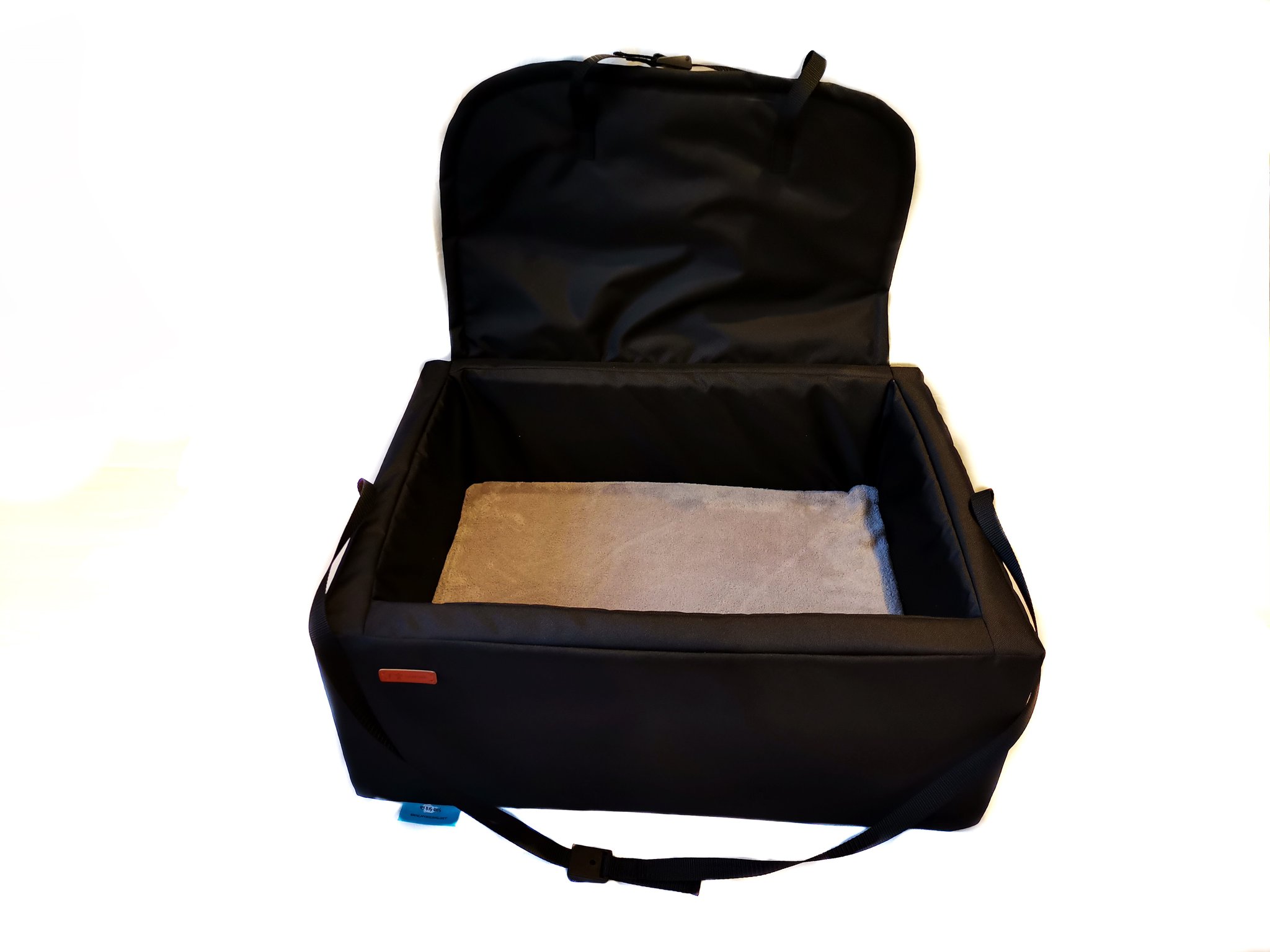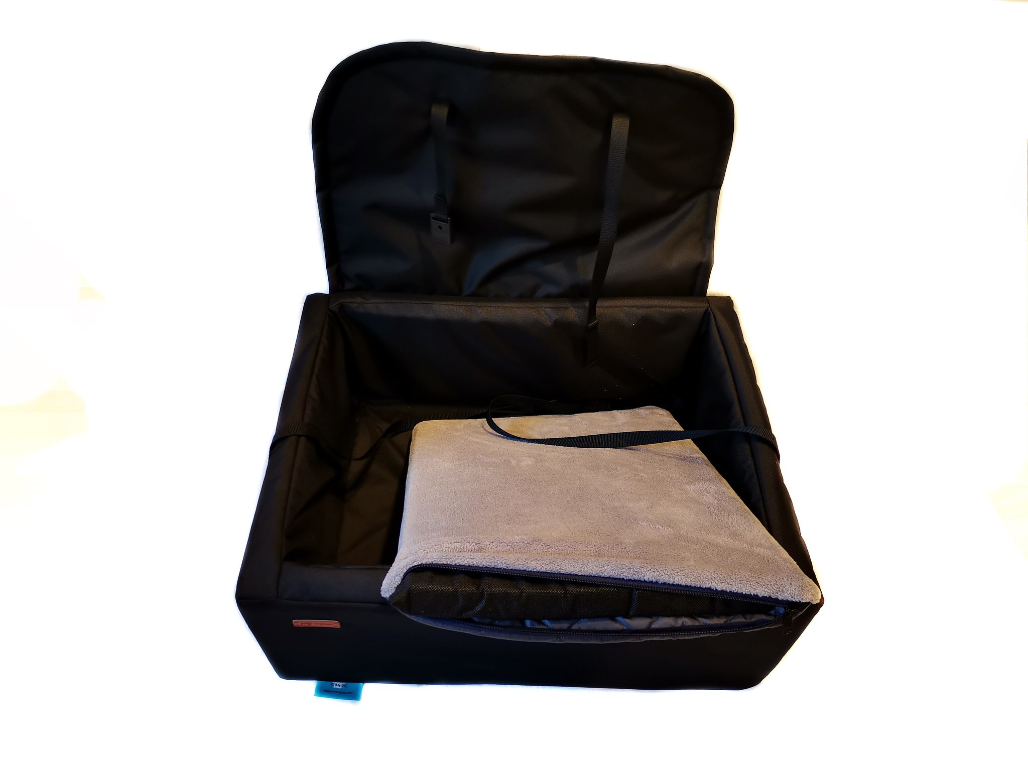 - Hátulján 2 kispárna található, amik az ülések közé szorítva, fixen tartják az utazó dobozt