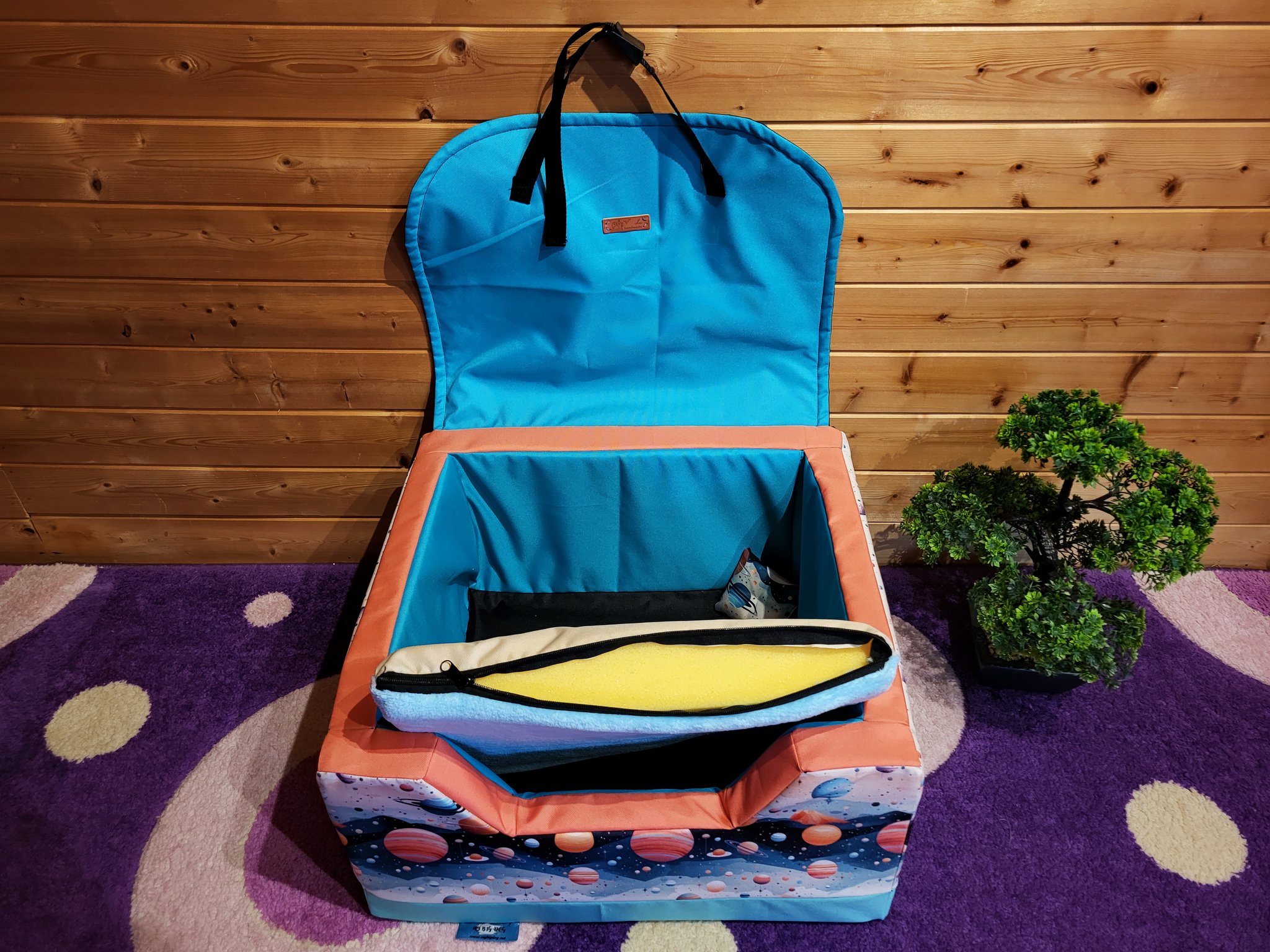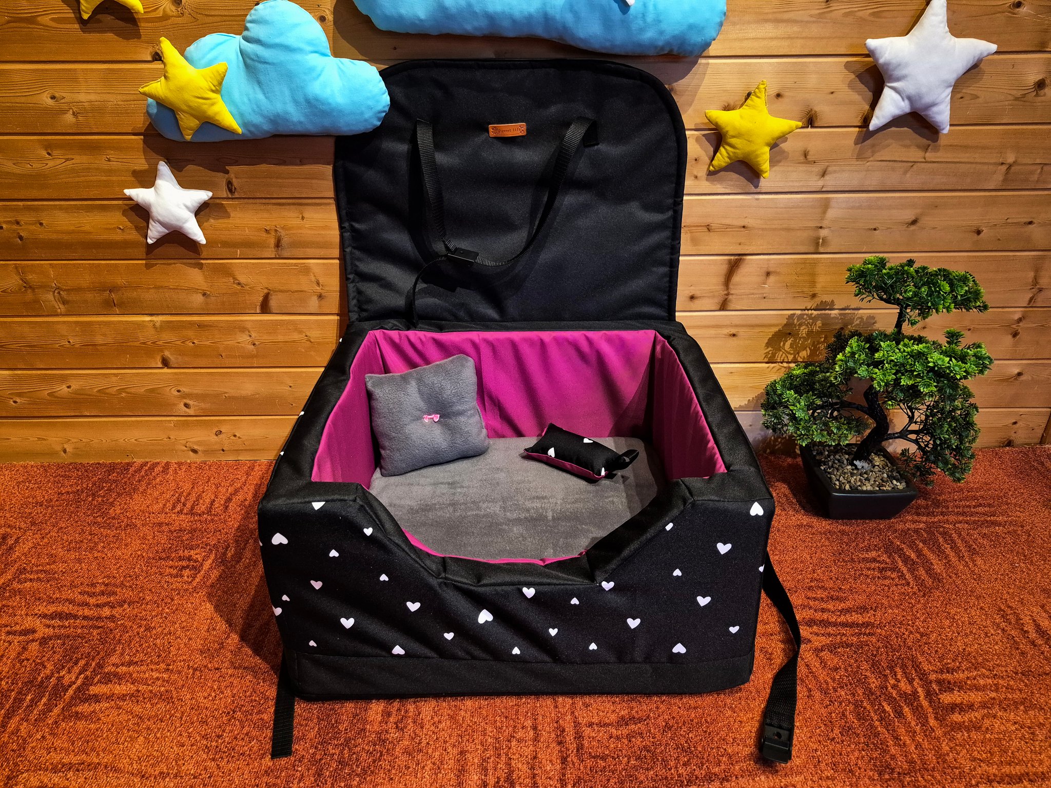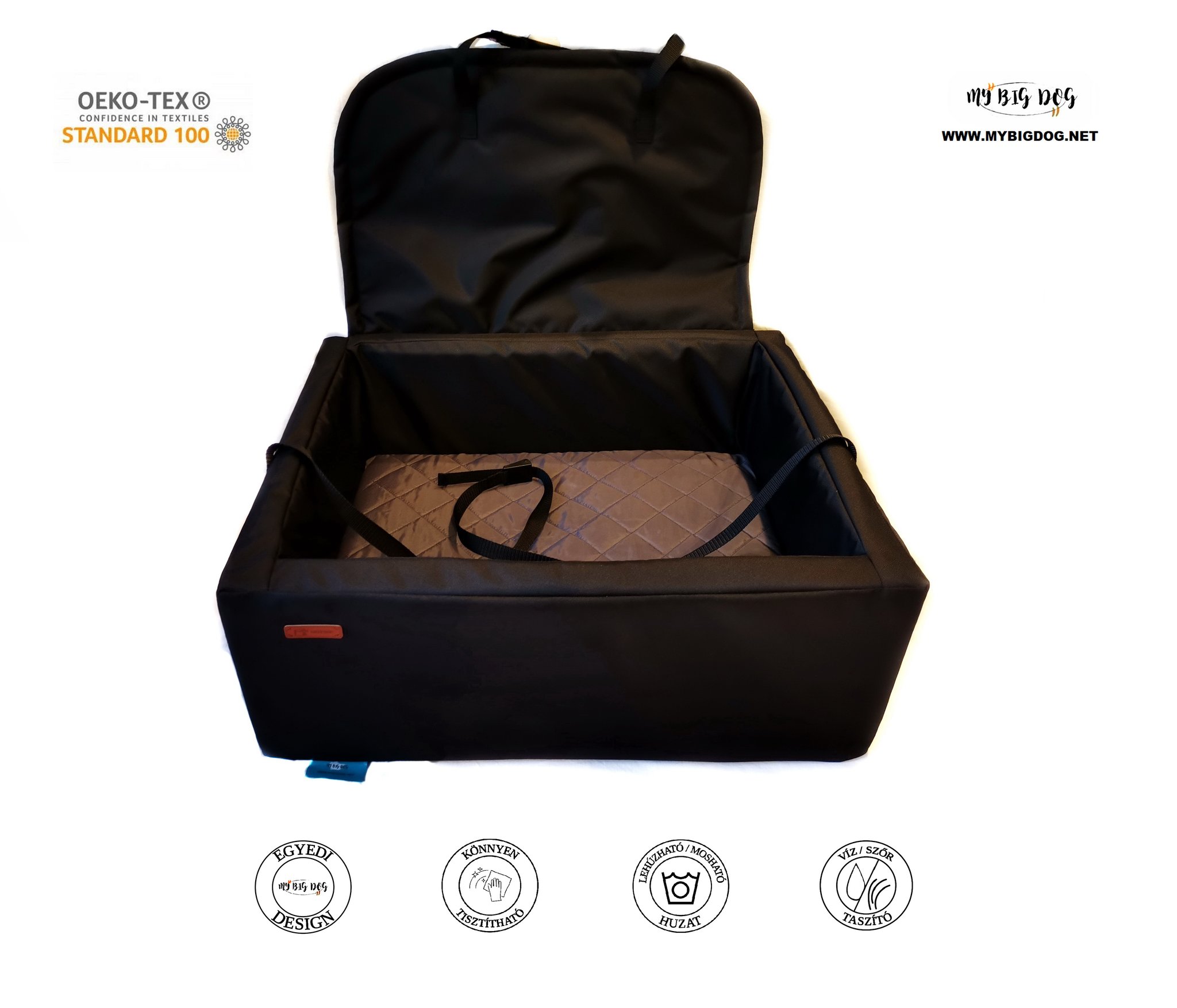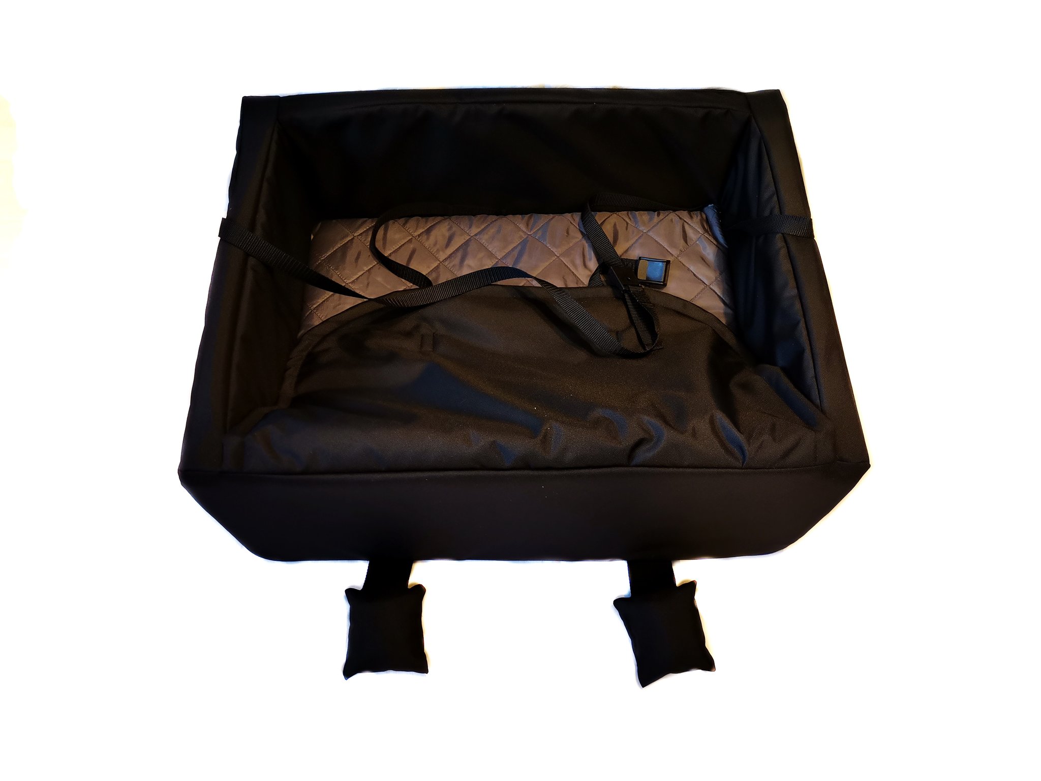 - Hátulján 2 kispárna található, amik az ülések közé szorítva, fixen tartják az utazó dobozt