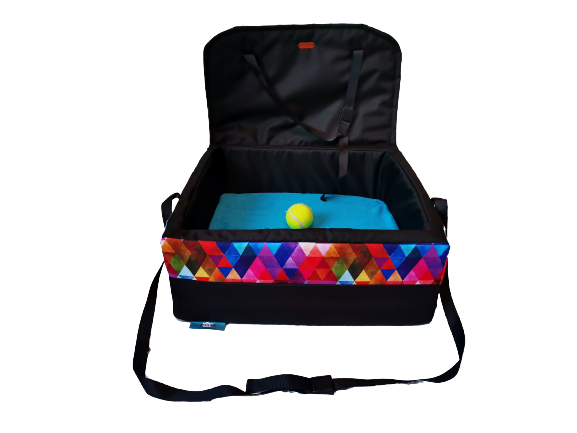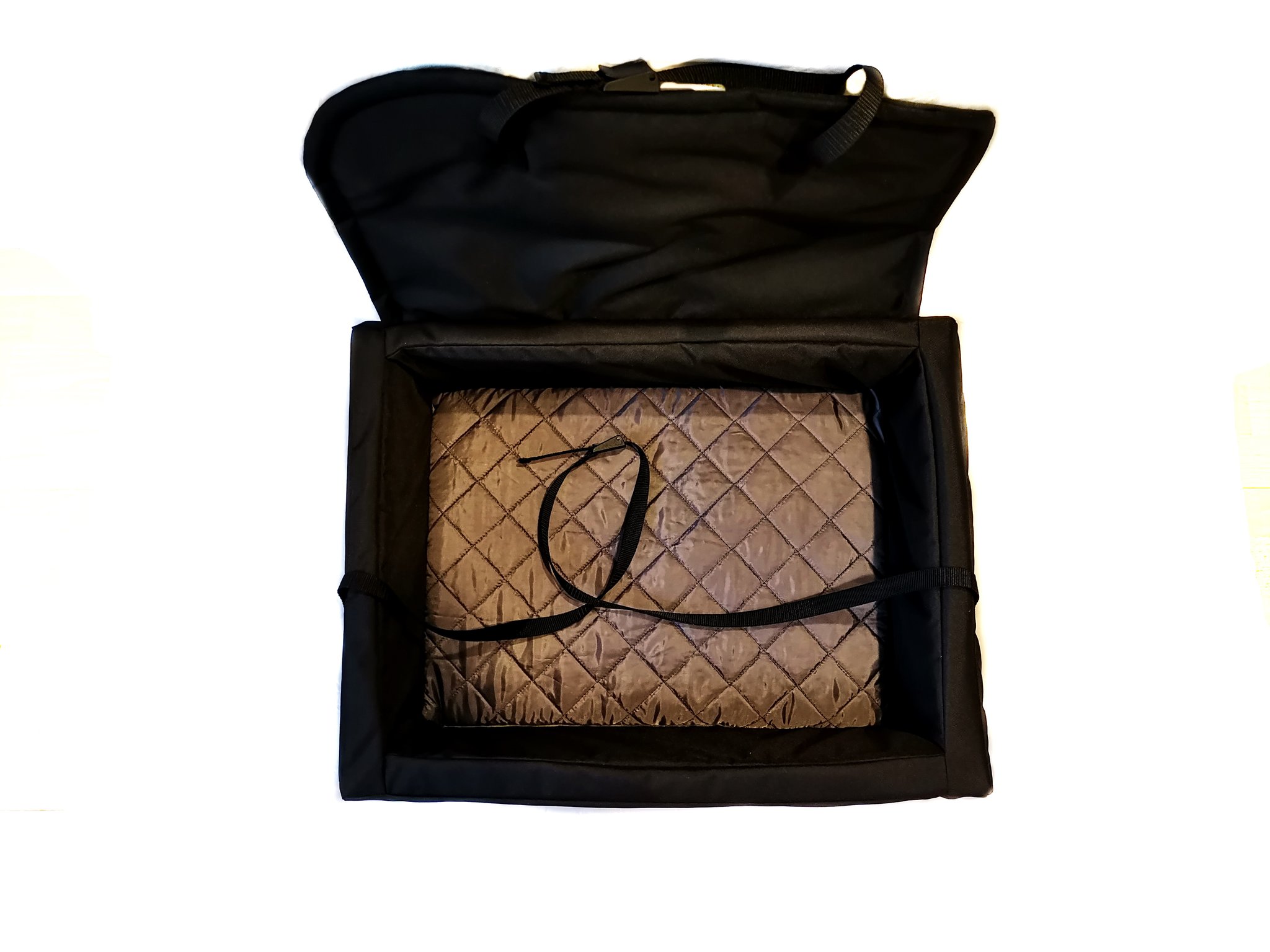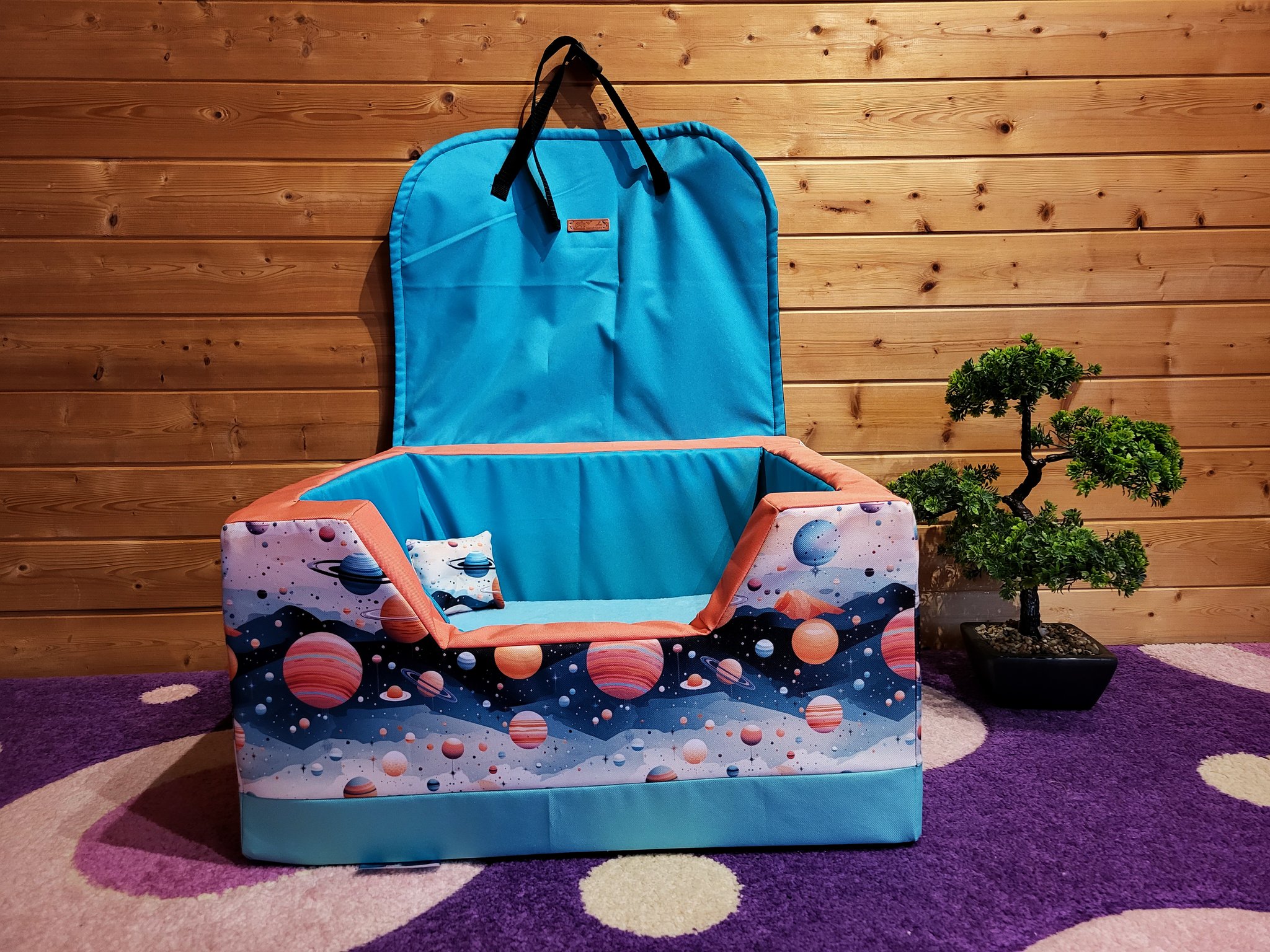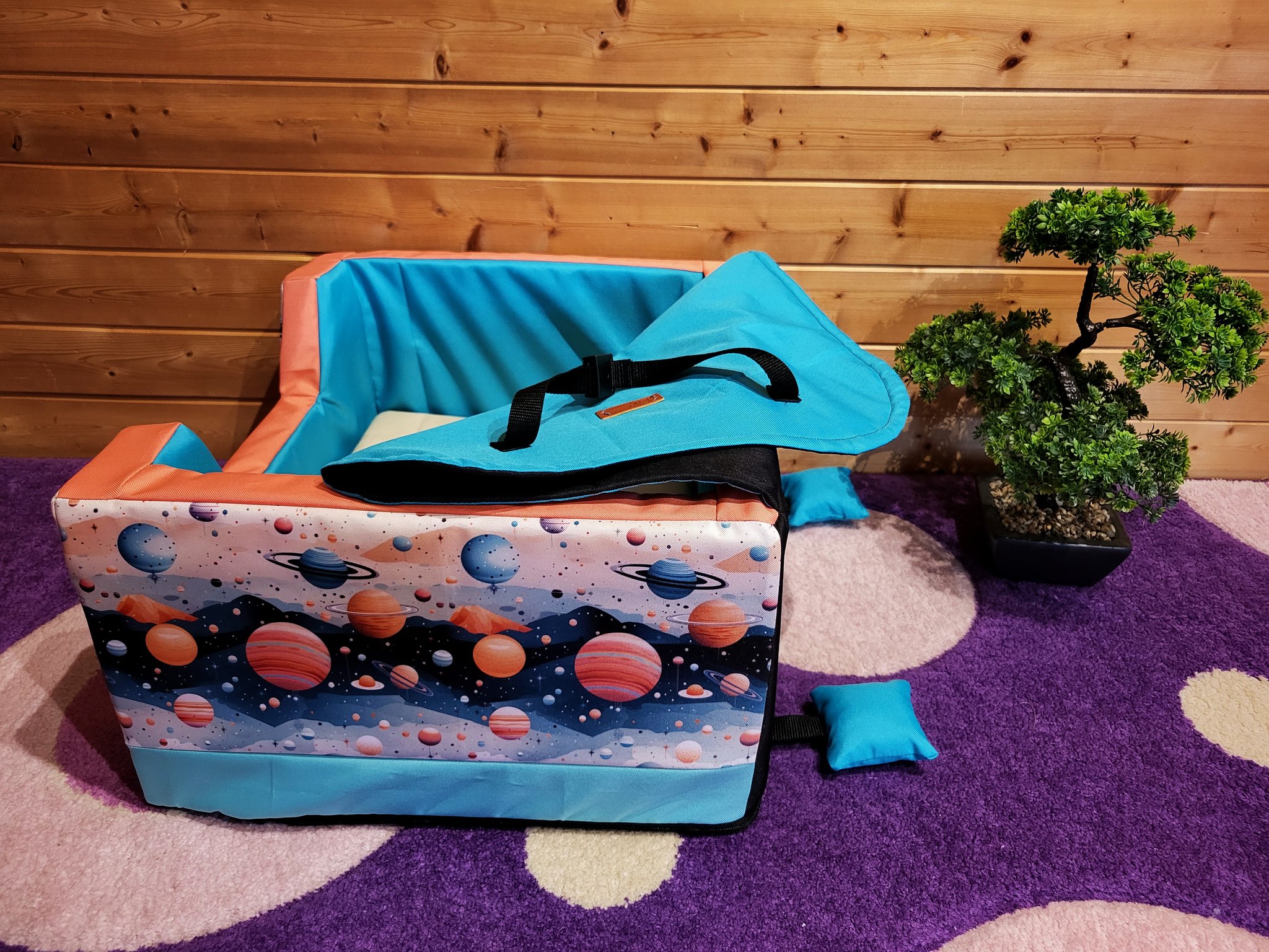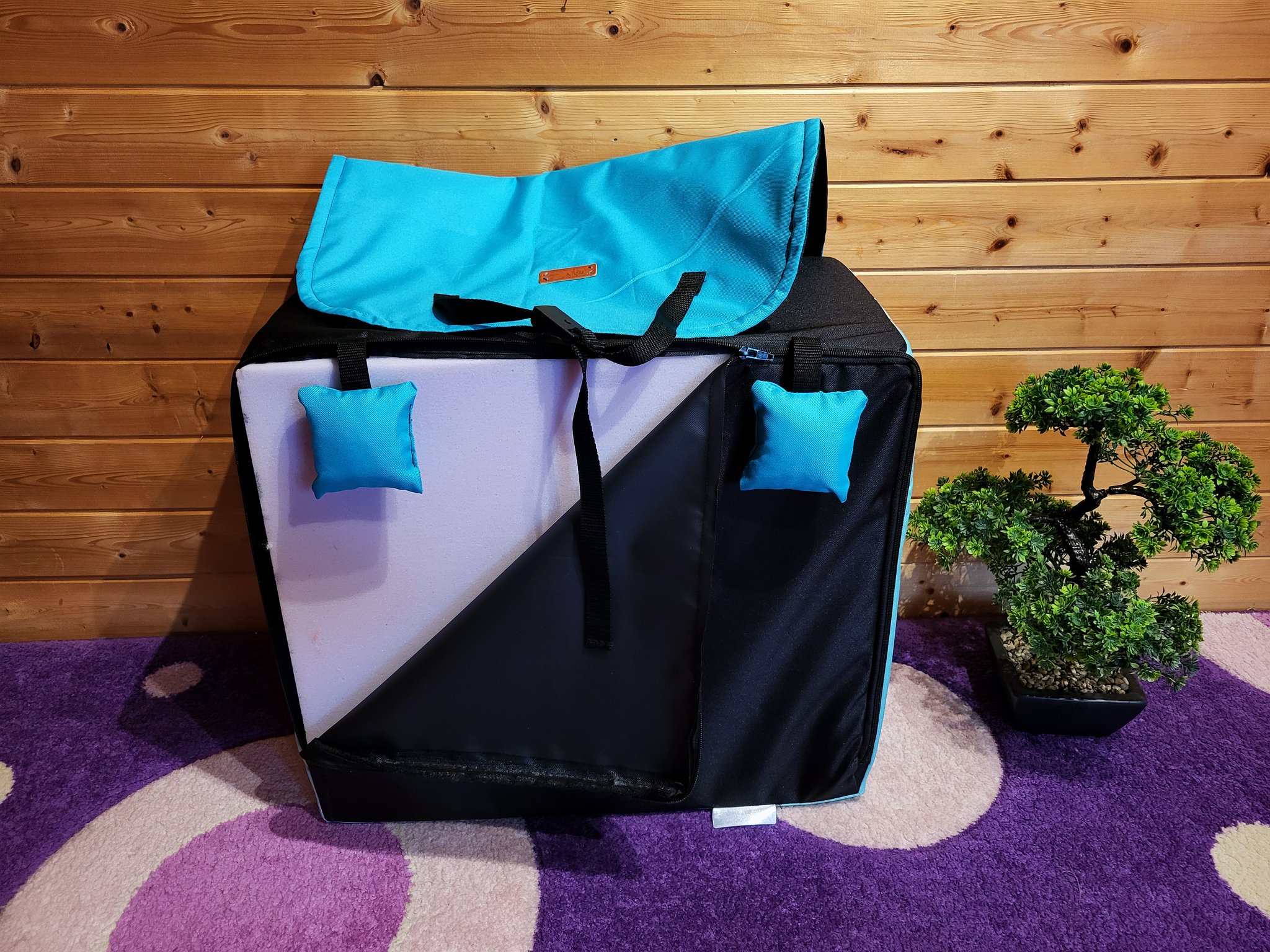 - Hátulján 2 kispárna található, amik az ülések közé szorítva, fixen tartják az utazó dobozt