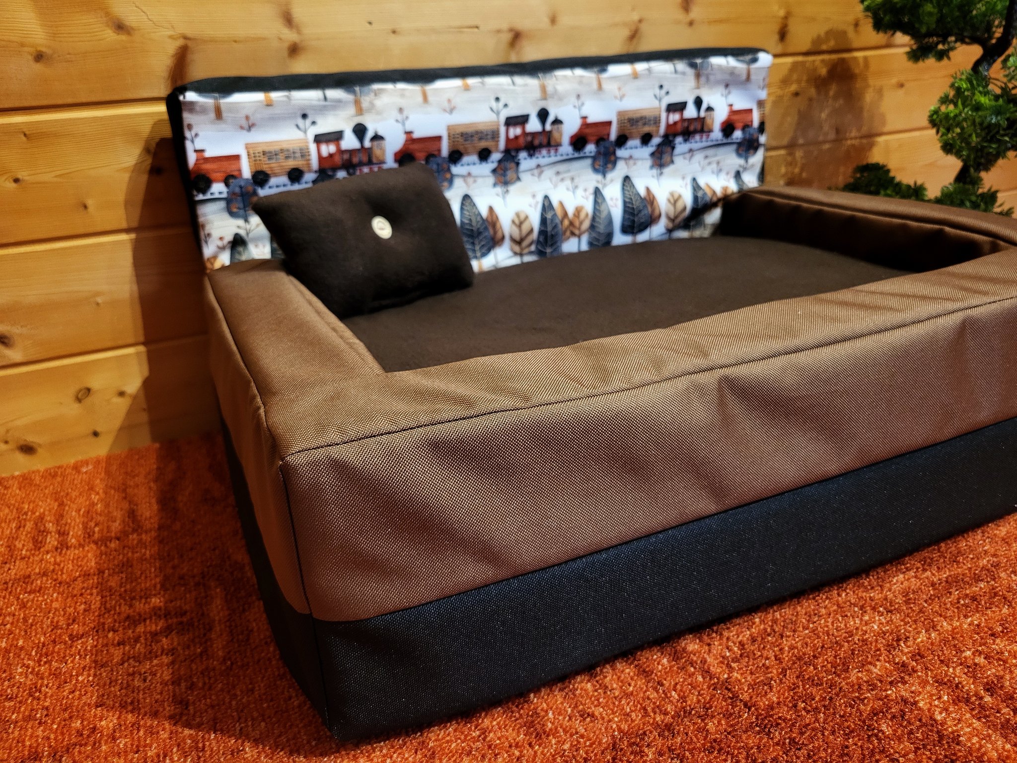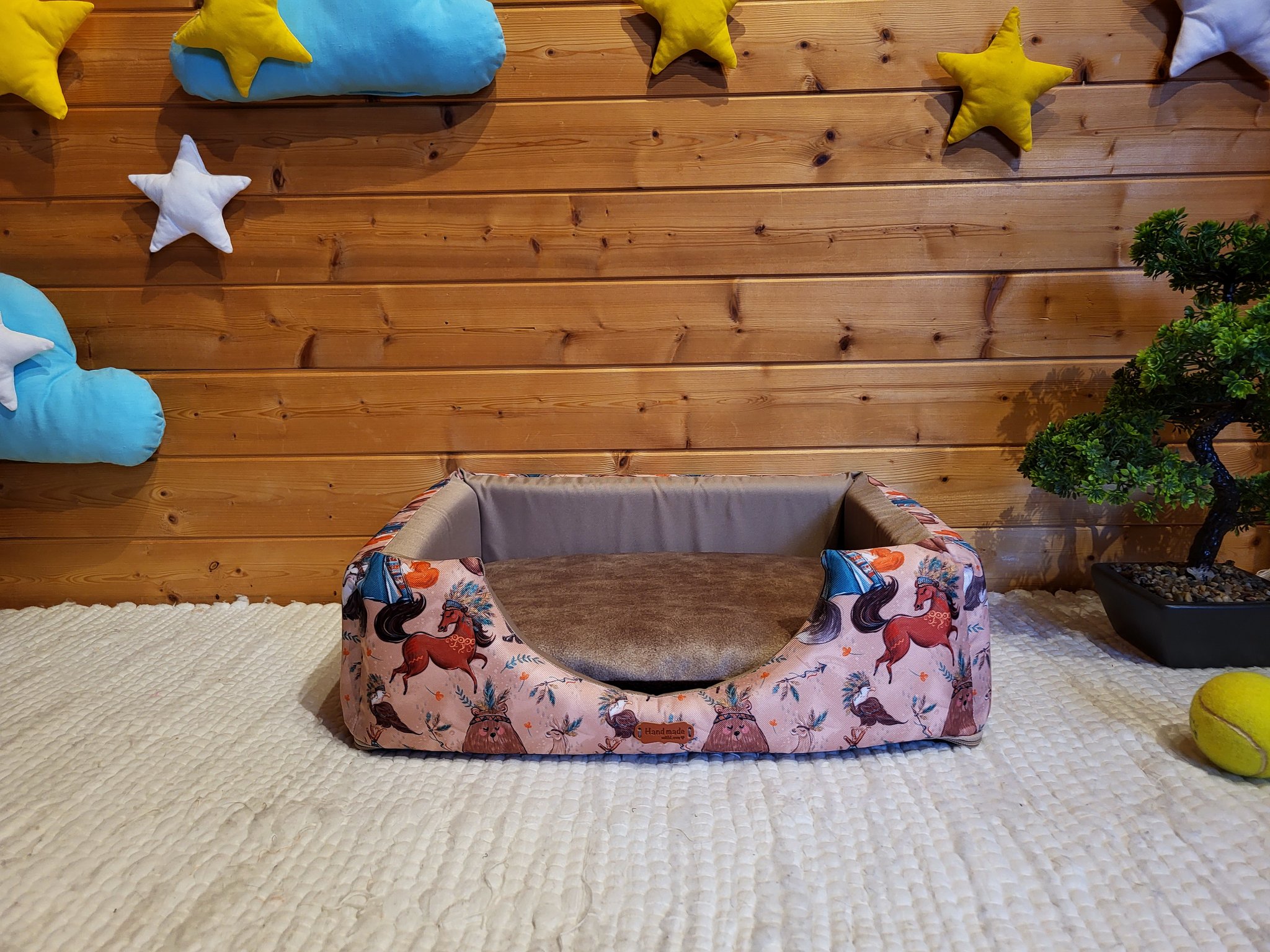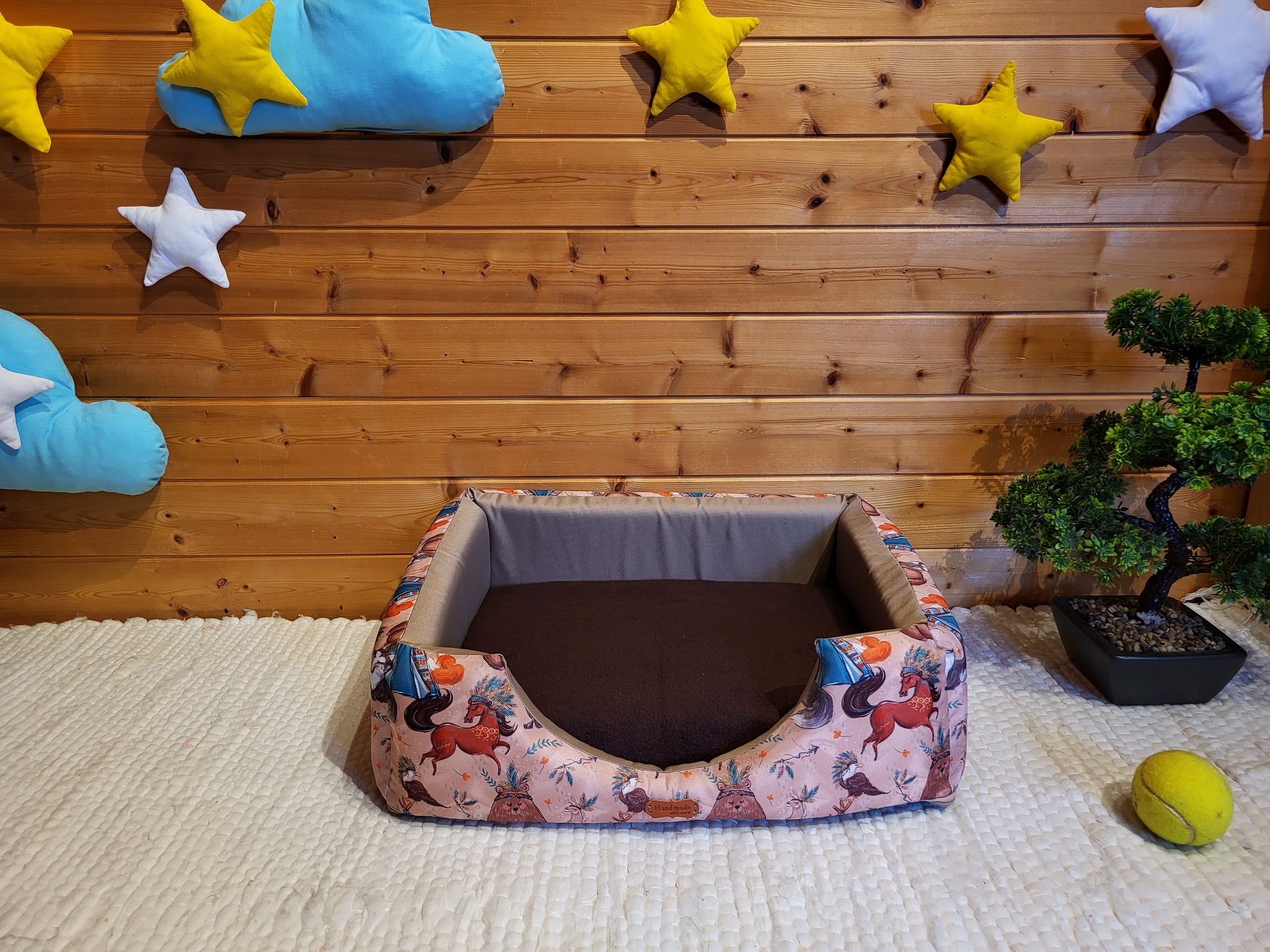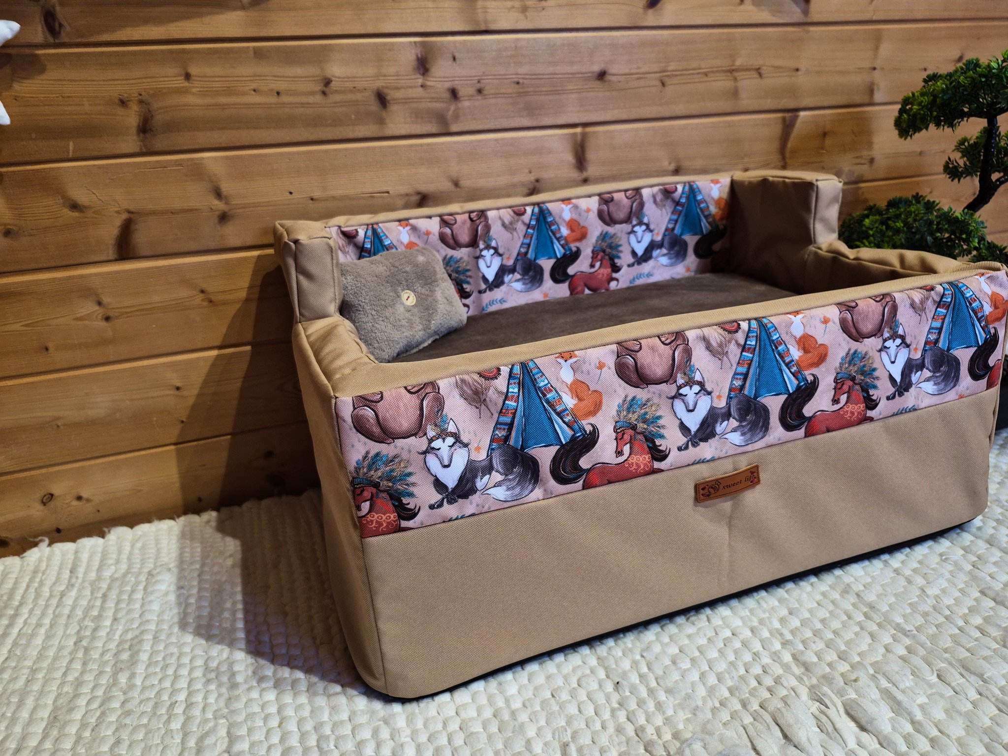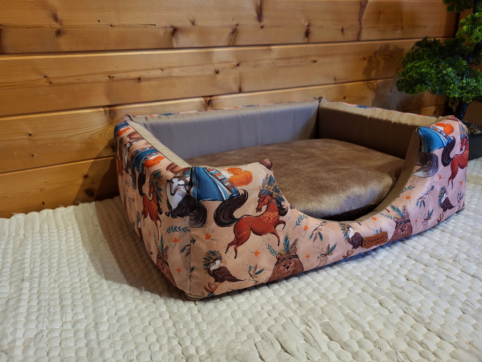 Gyönyörű mintázatú háttámlás fekhely, kényelmes peremmel és puha belső matraccal.