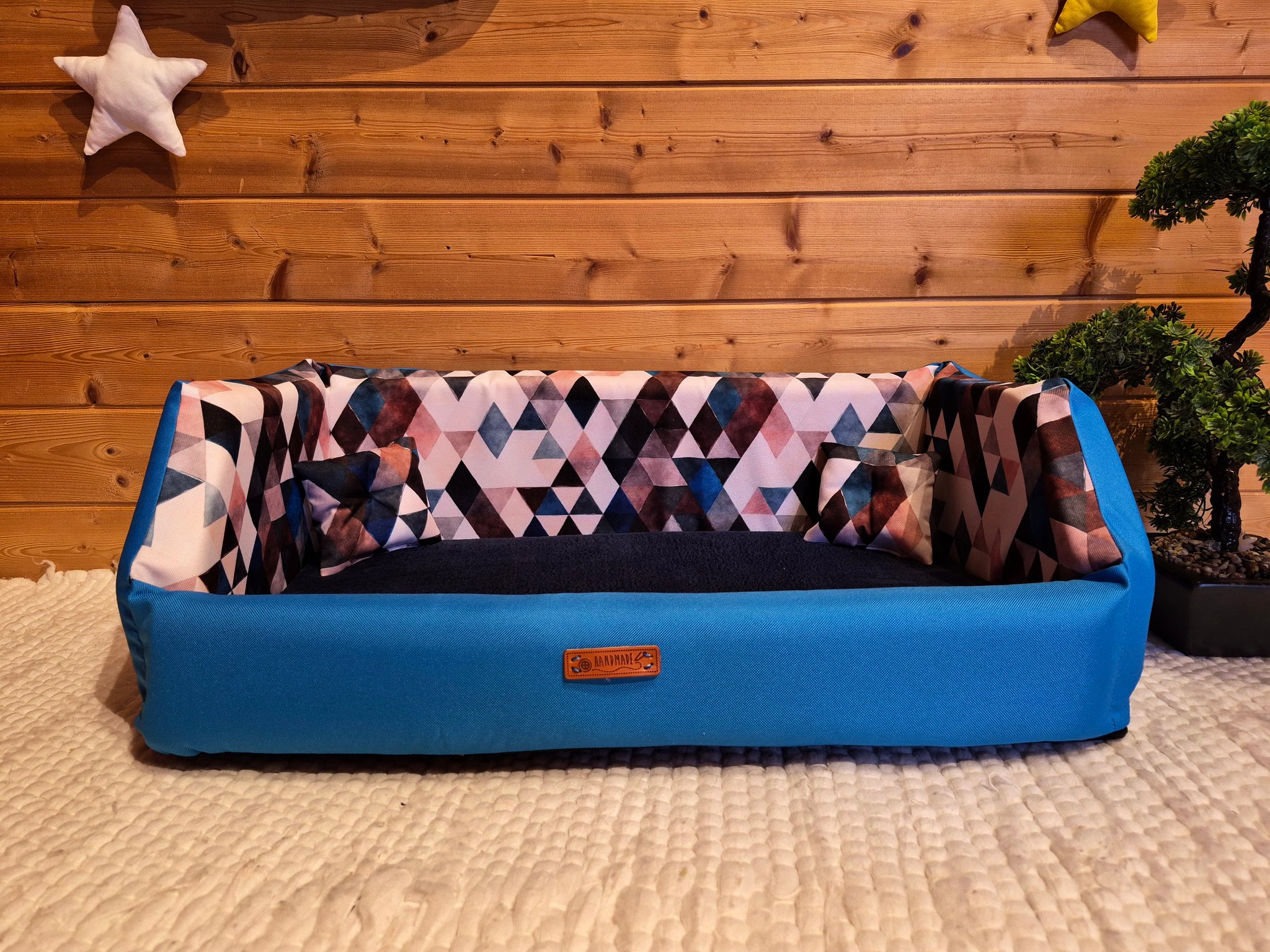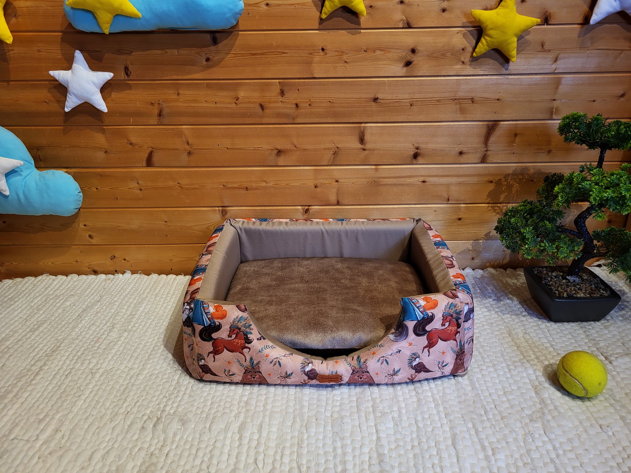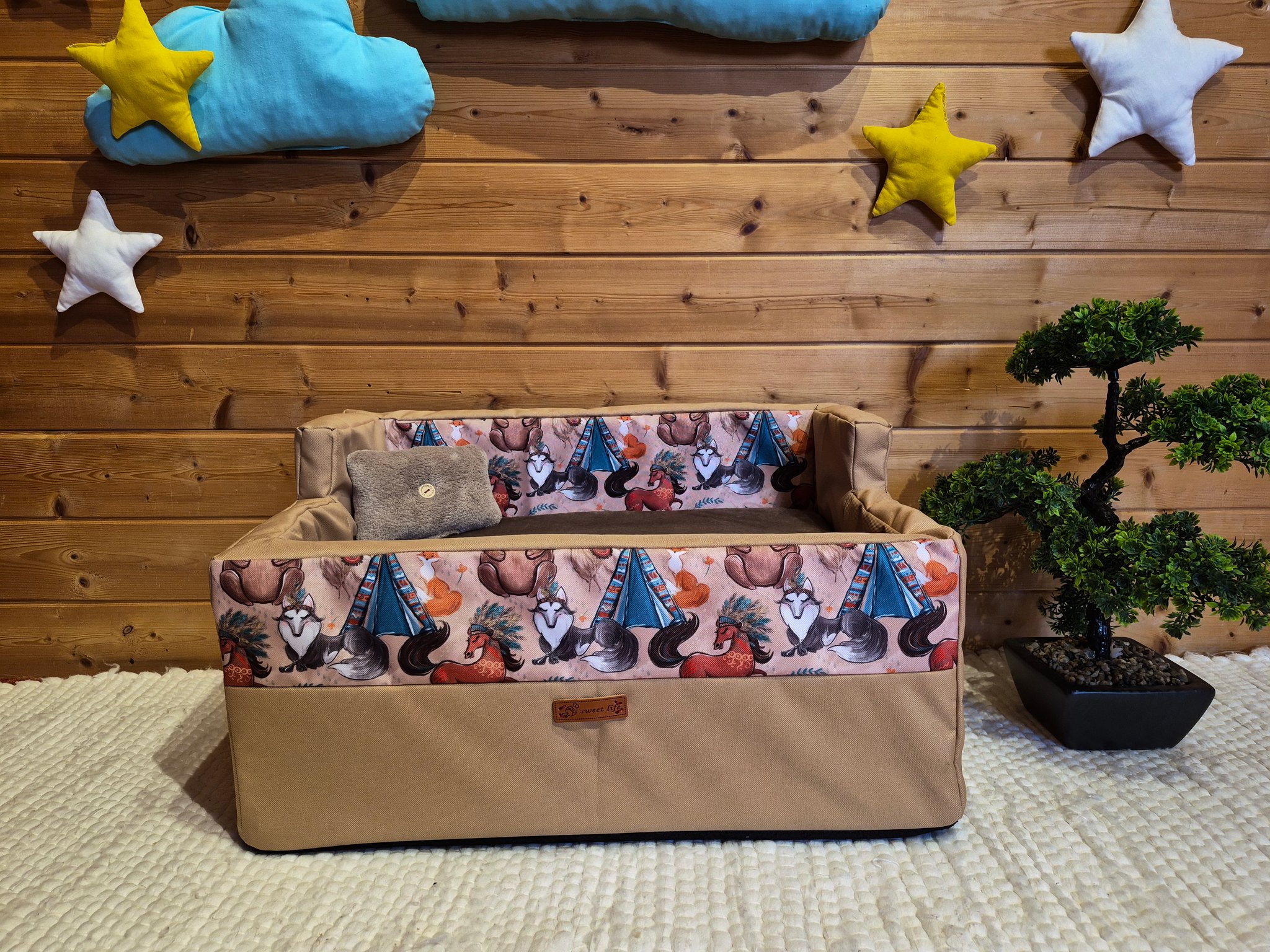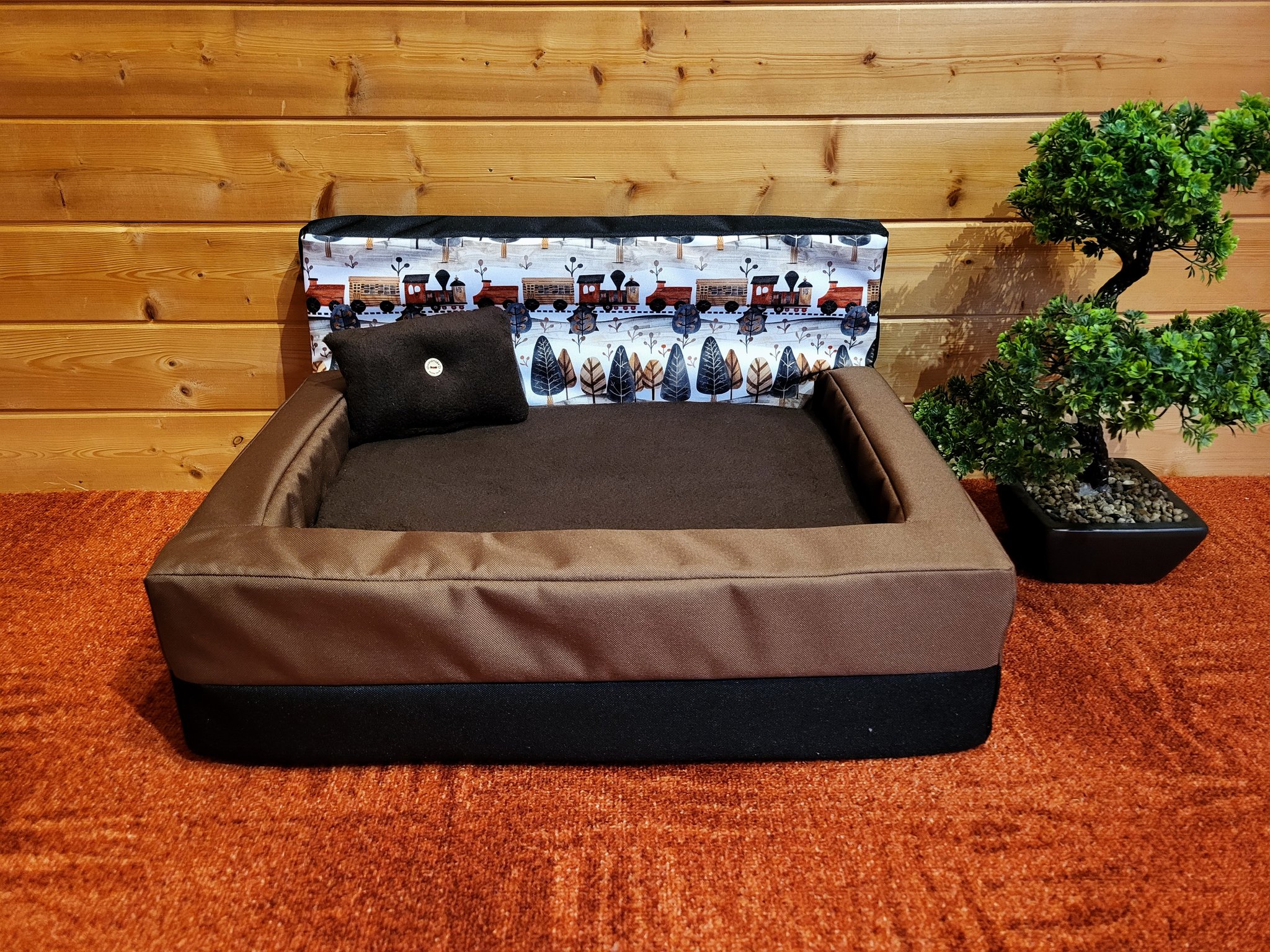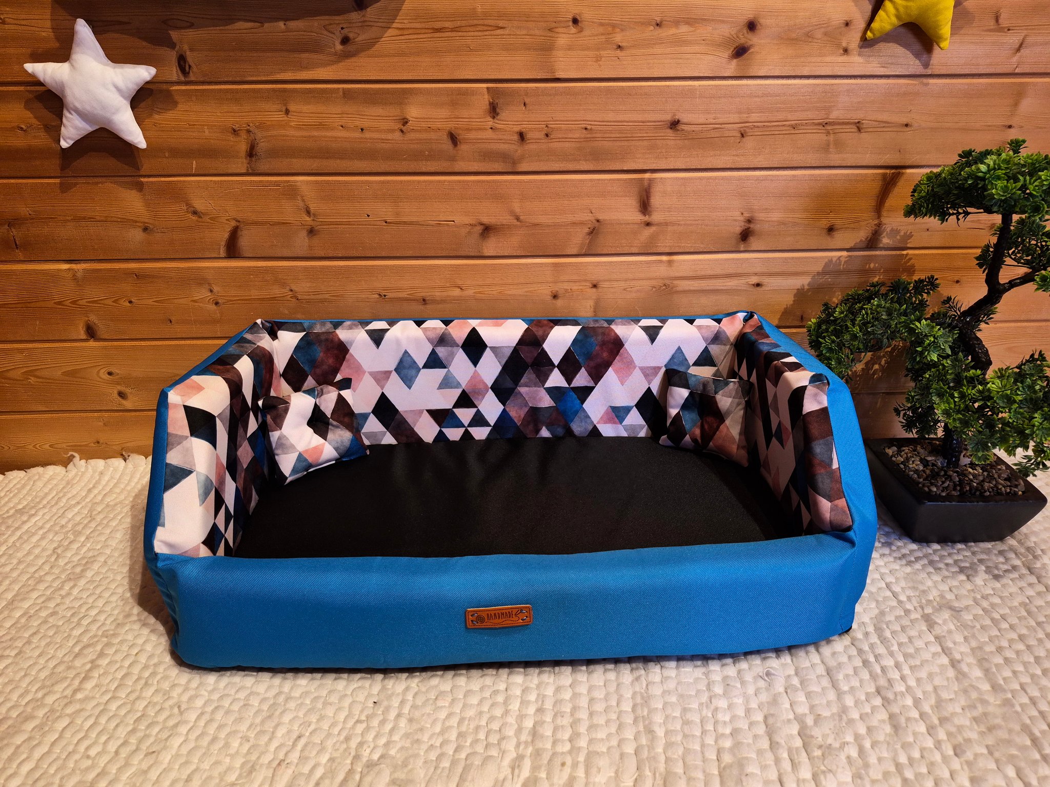 Gyönyörű mintázatú háttámlás fekhely, kényelmes peremmel és puha belső matraccal.