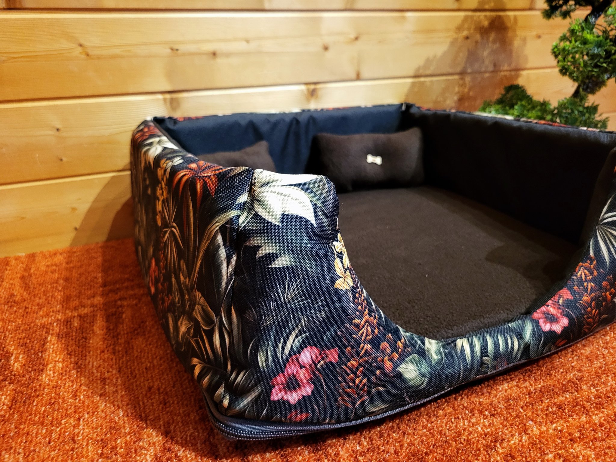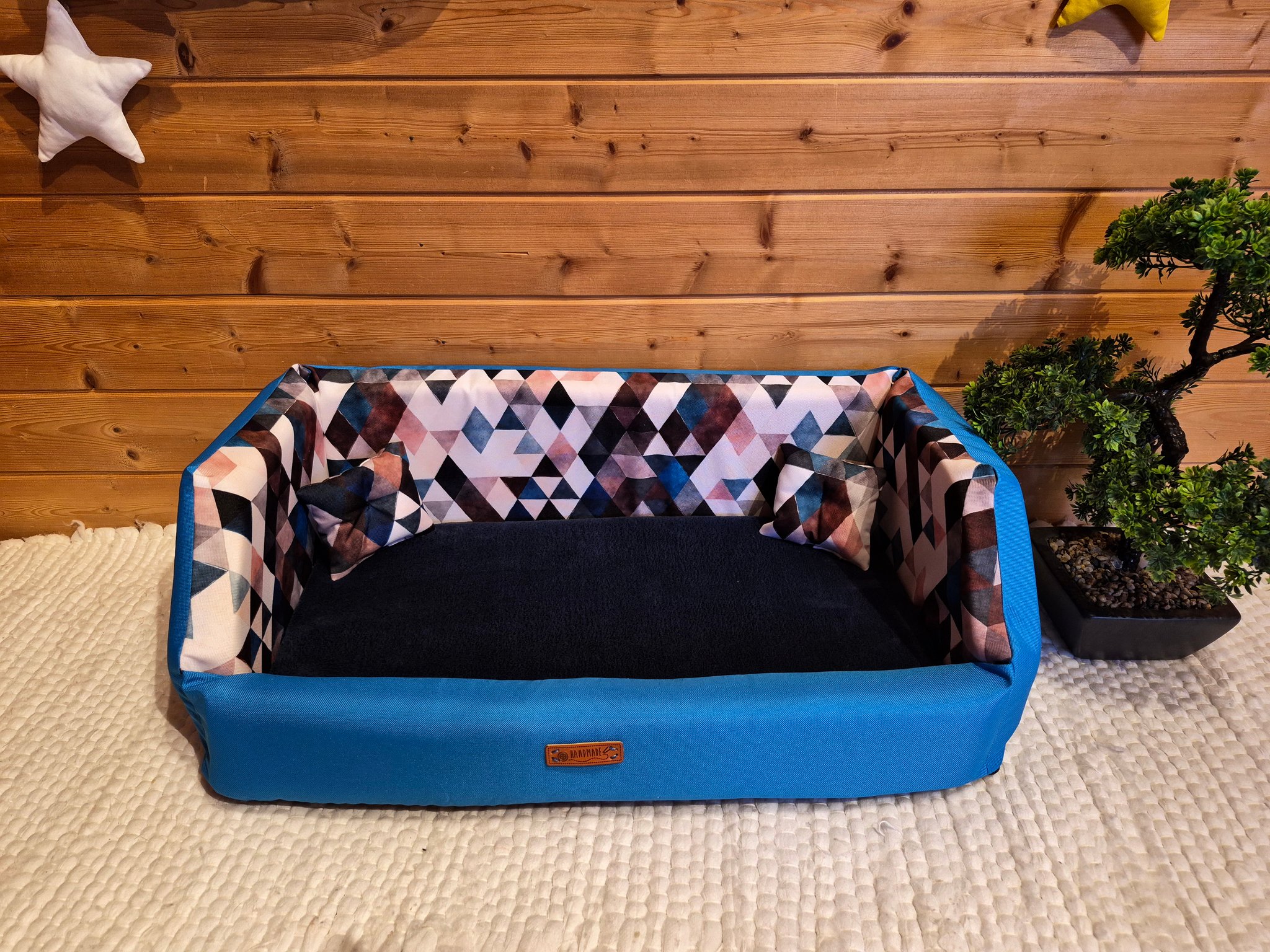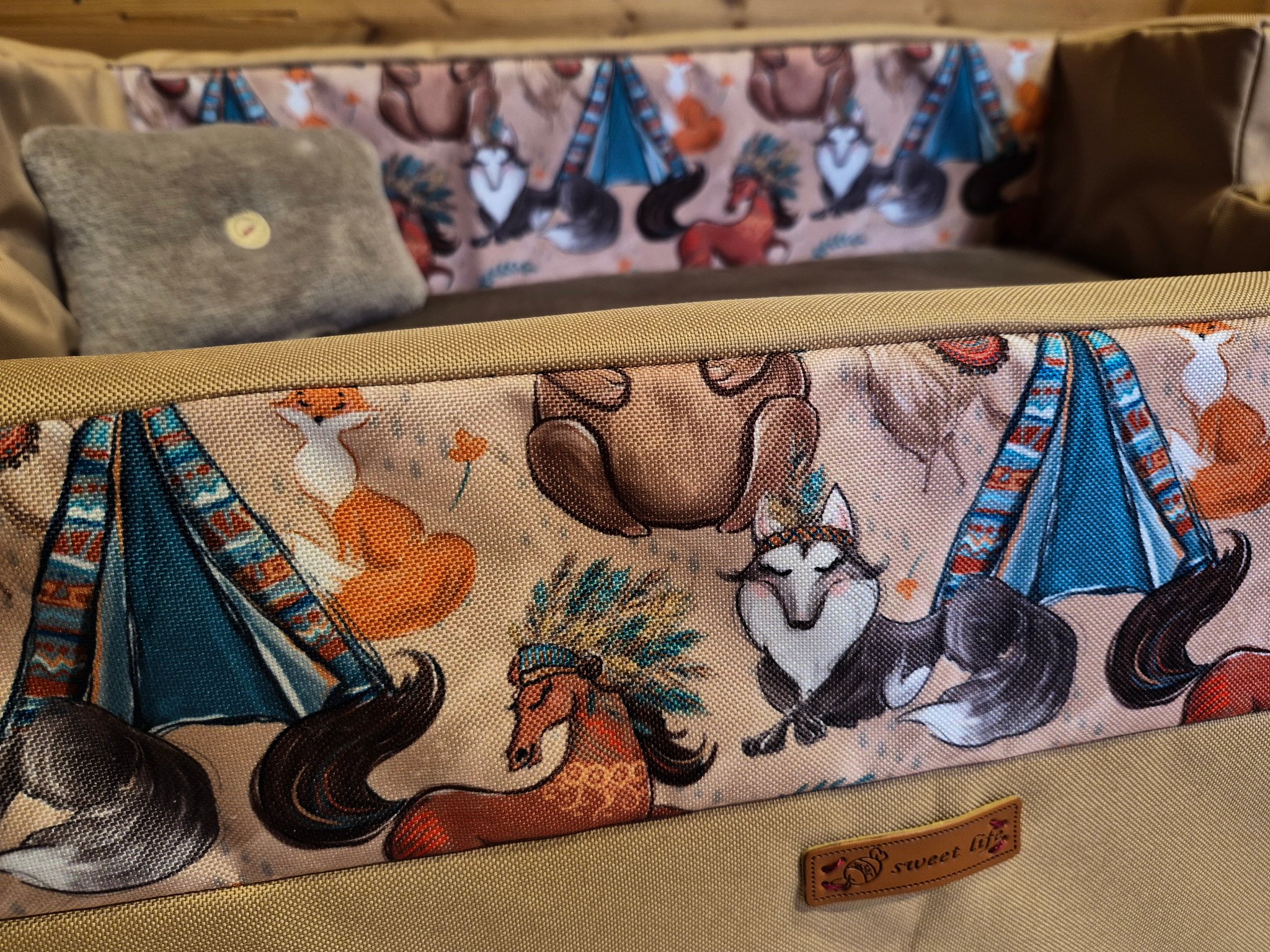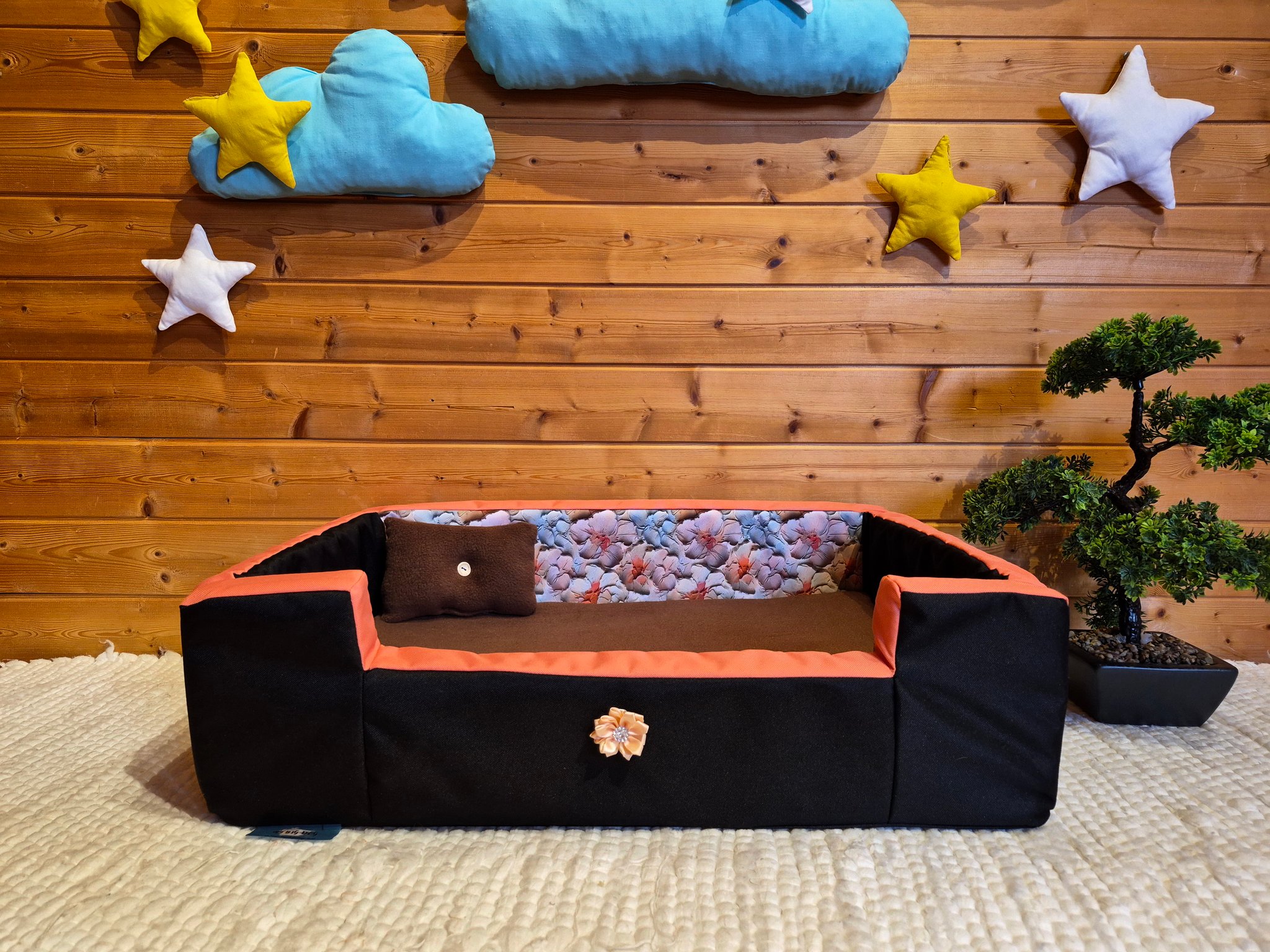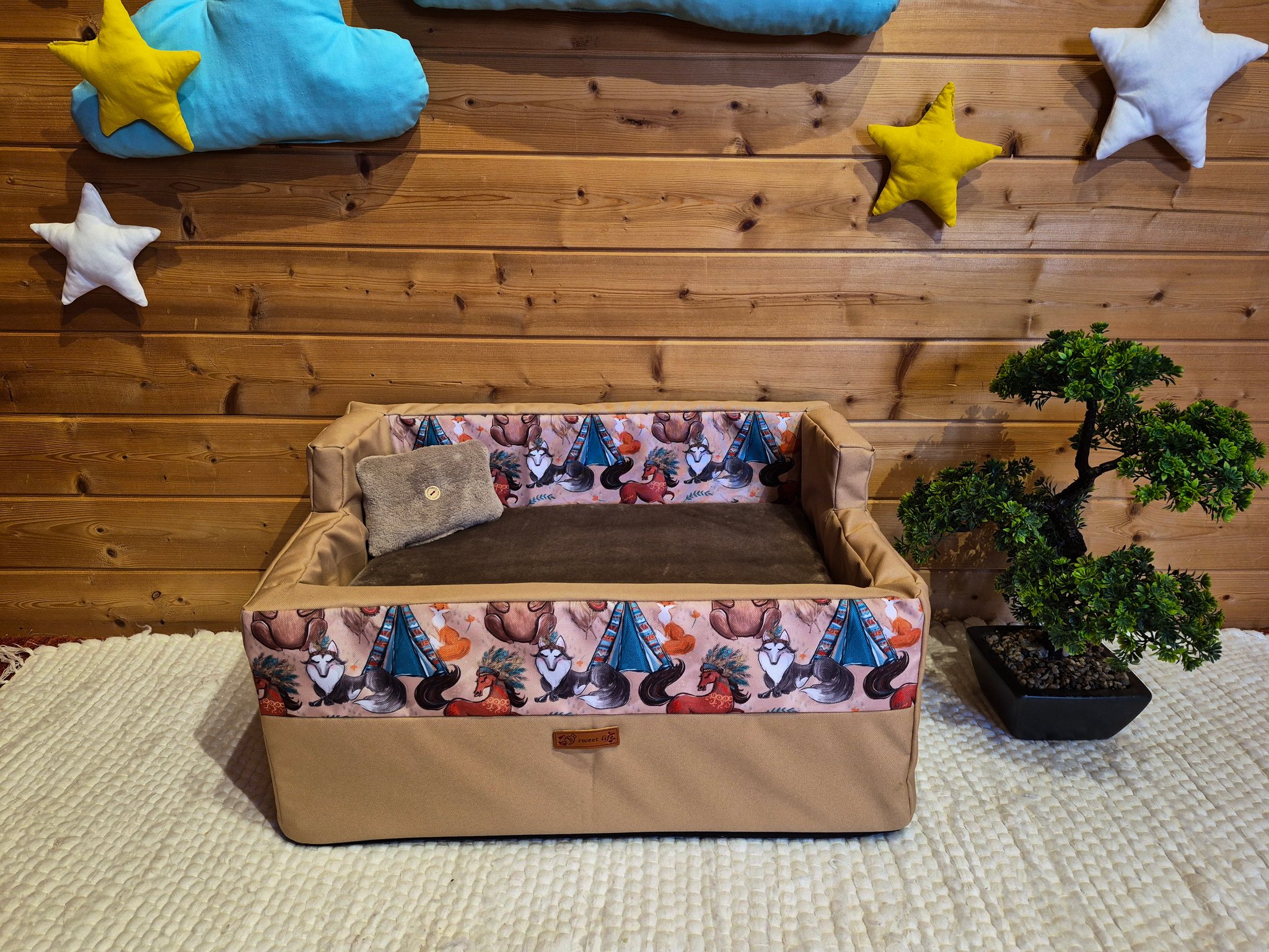 Gyönyörű mintázatú háttámlás fekhely, kényelmes peremmel és puha belső matraccal.