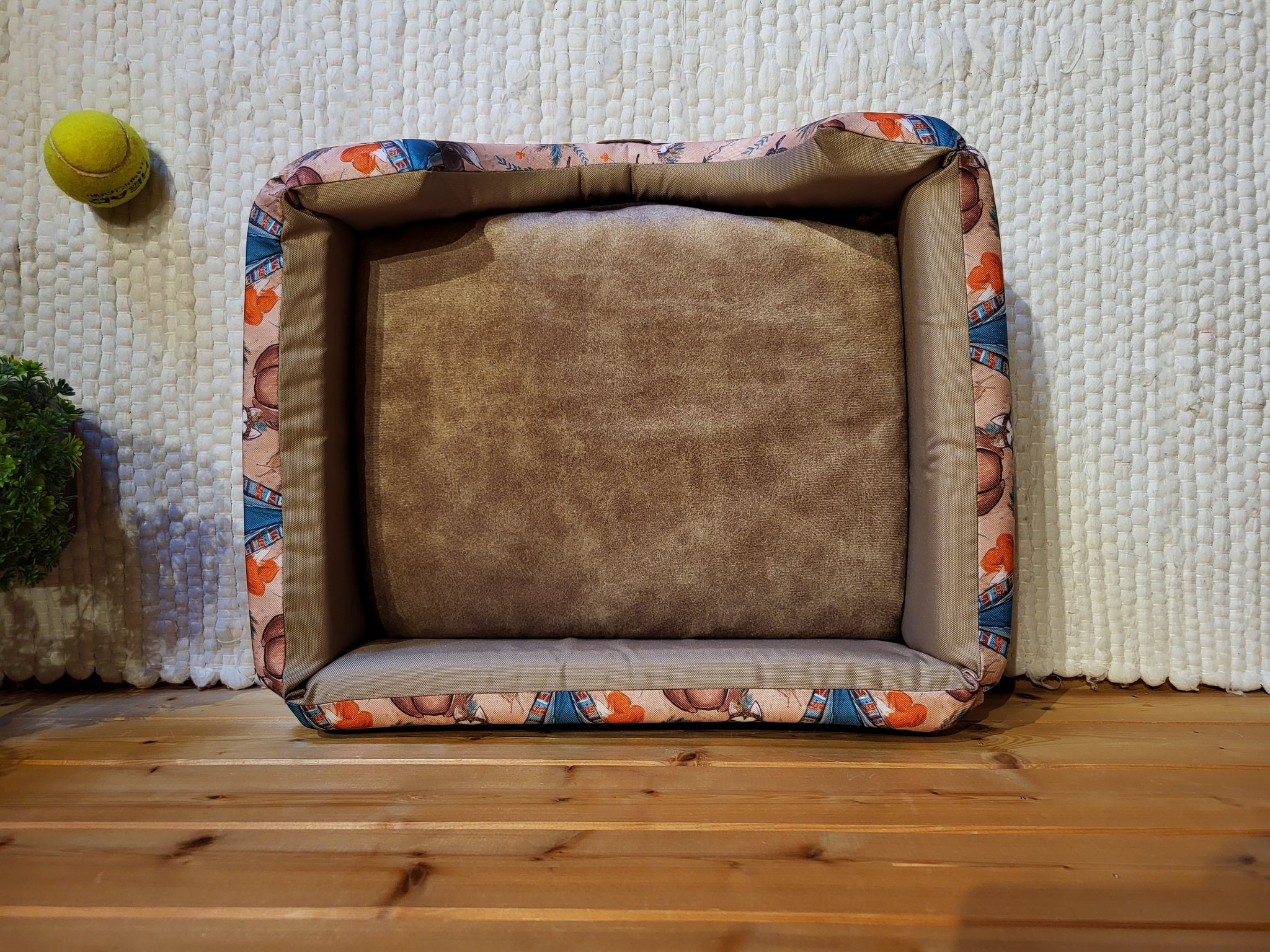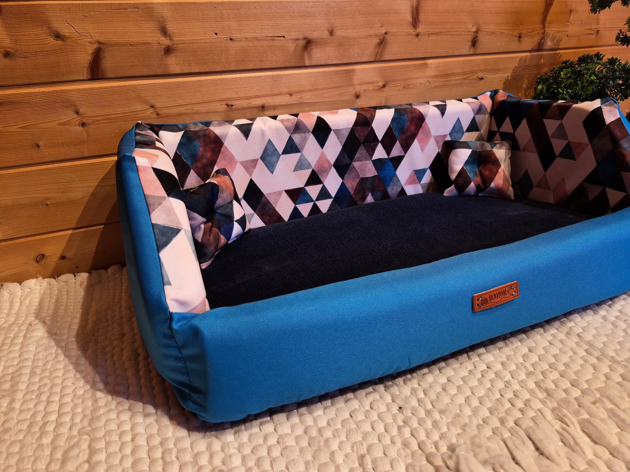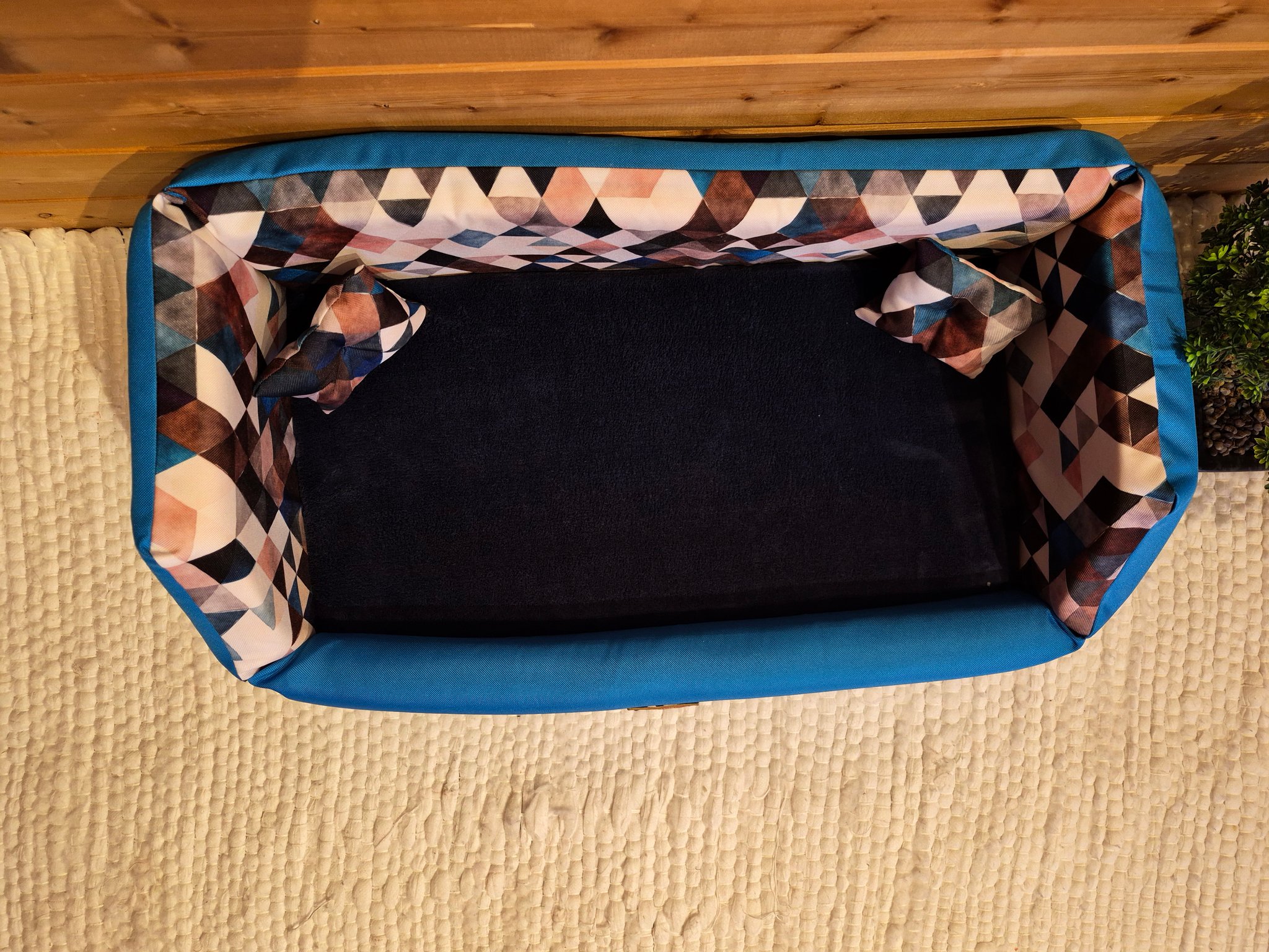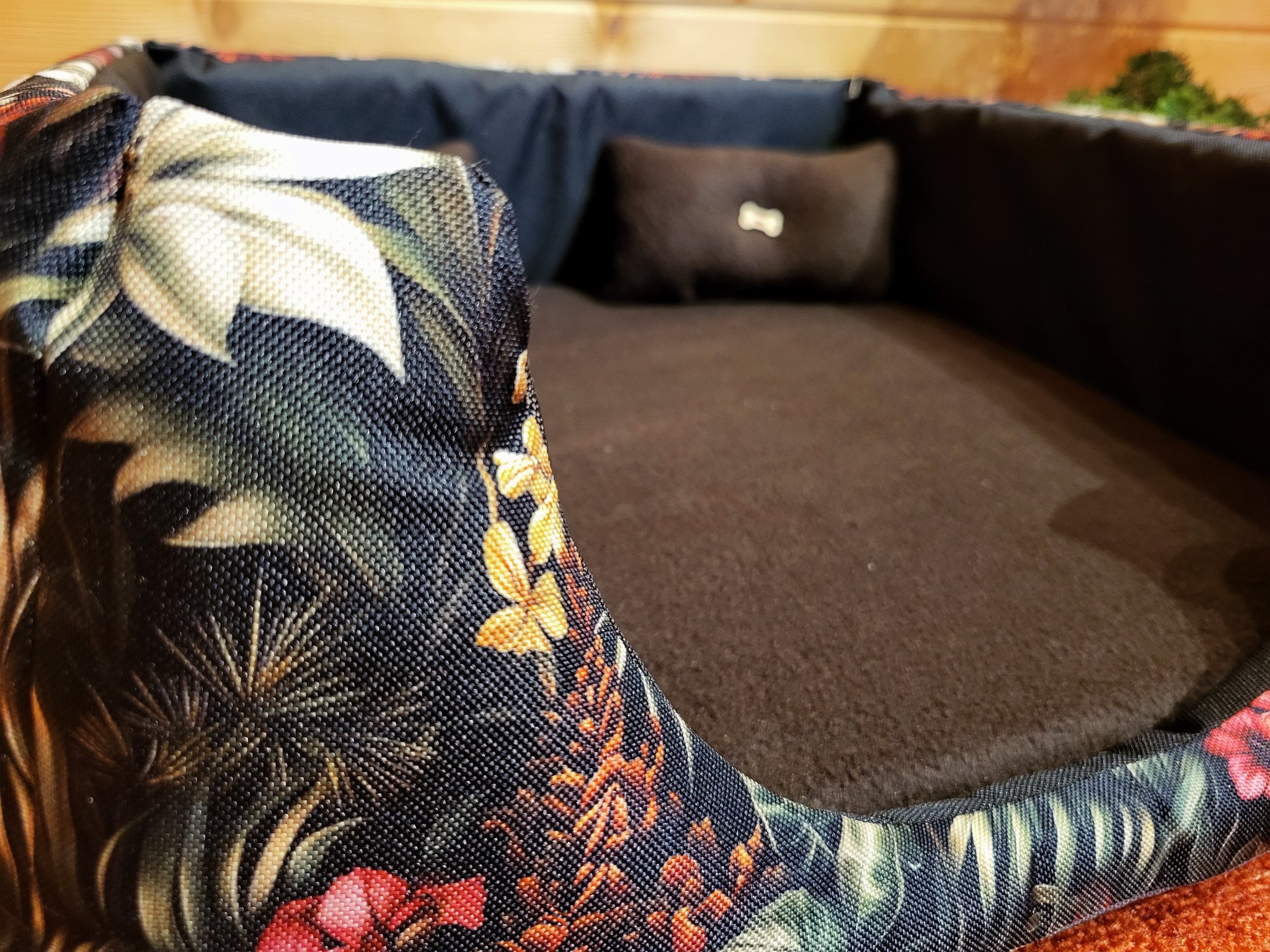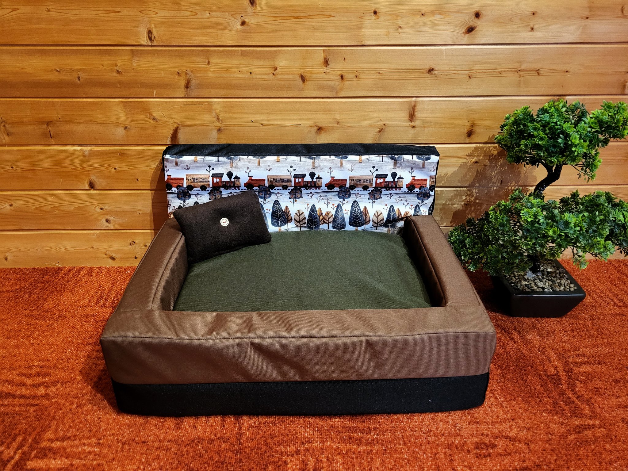 Gyönyörű mintázatú háttámlás fekhely, kényelmes peremmel és puha belső matraccal.