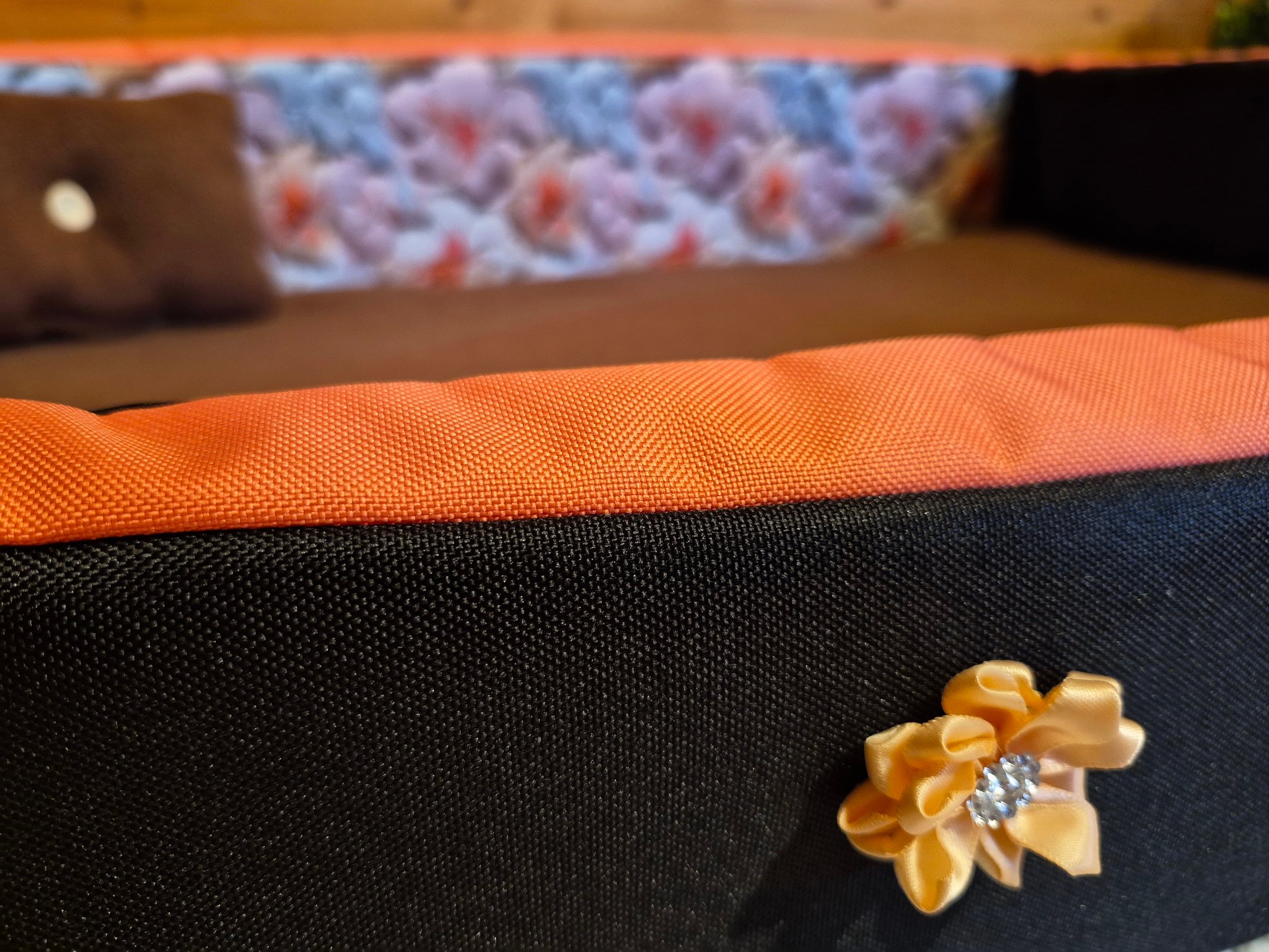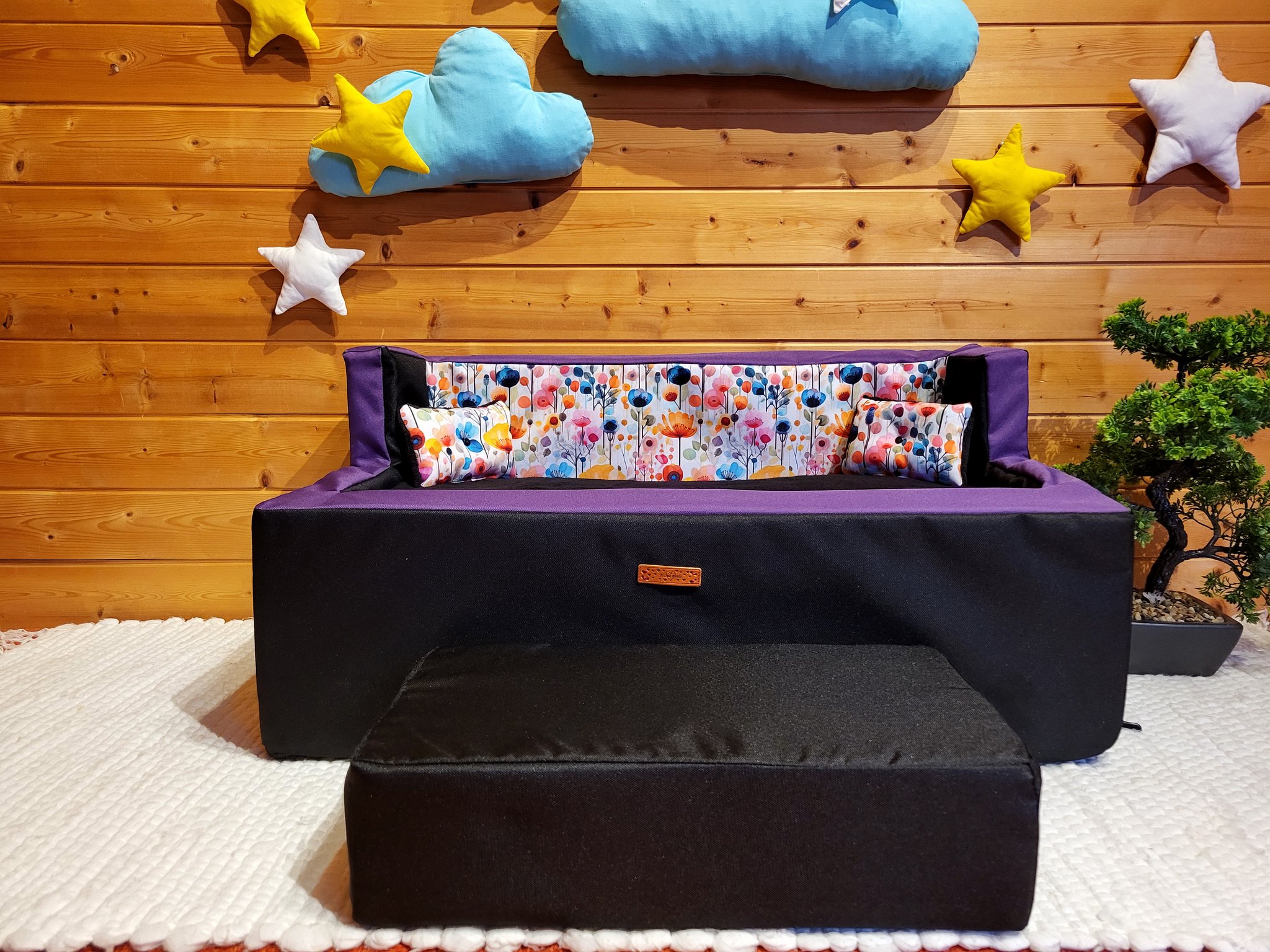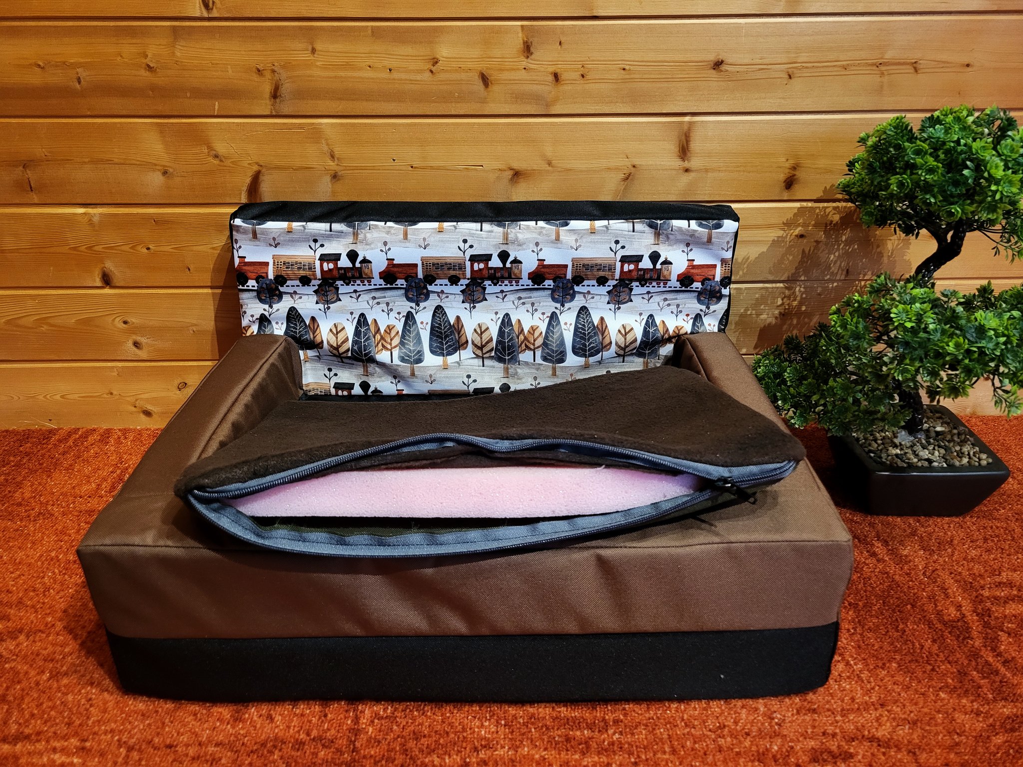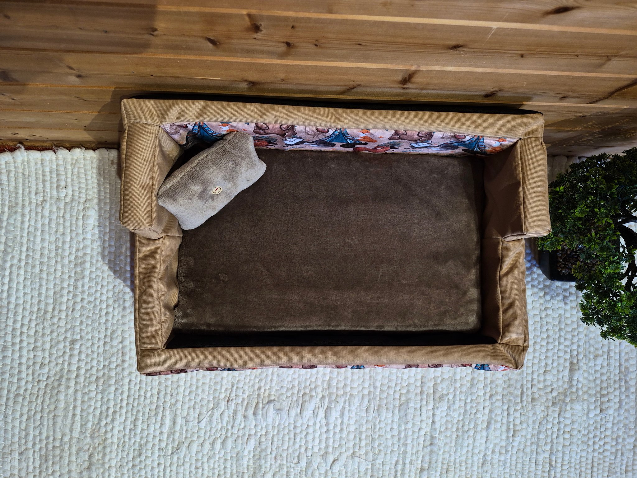 Gyönyörű mintázatú háttámlás fekhely, kényelmes peremmel és puha belső matraccal.