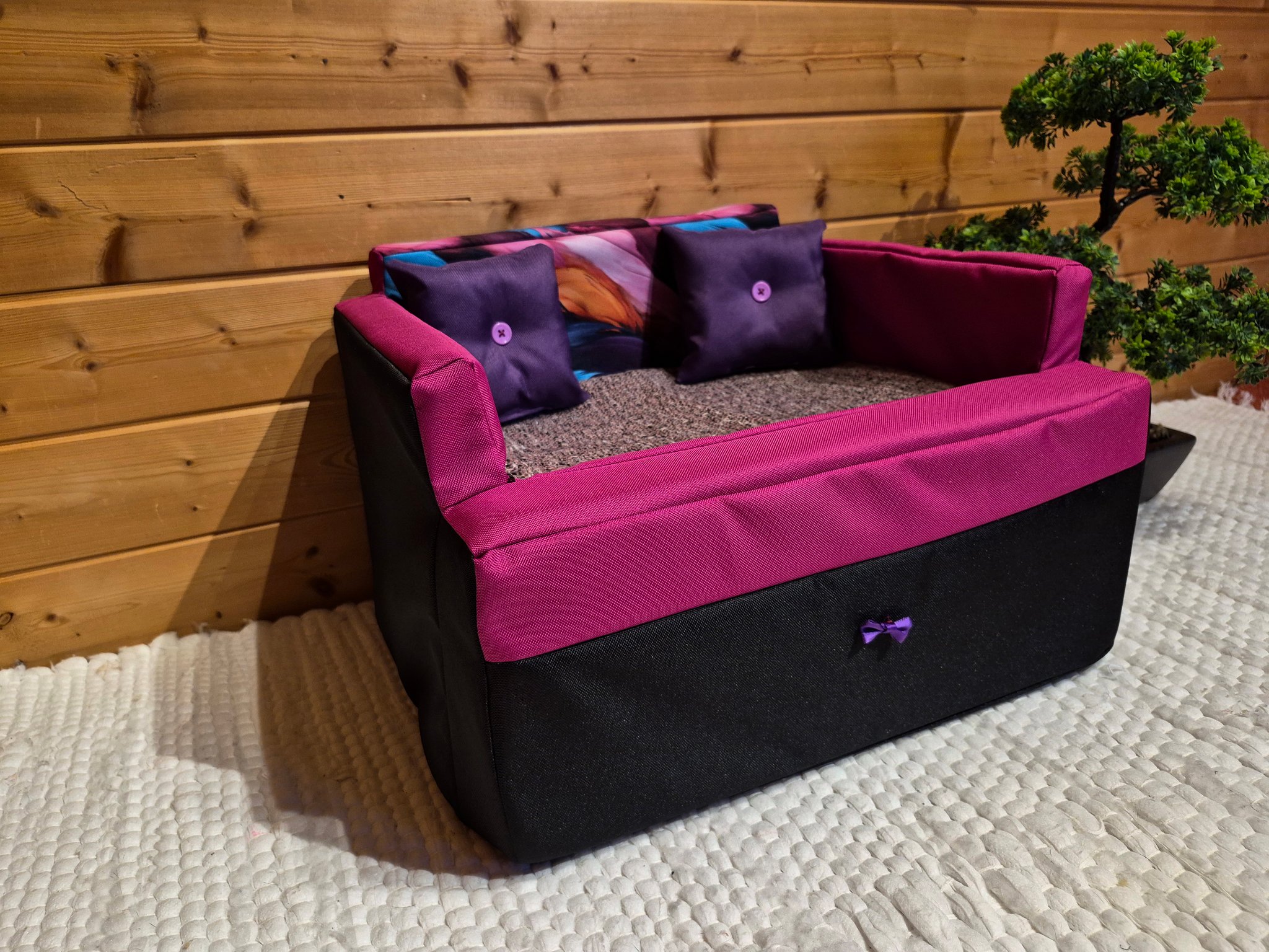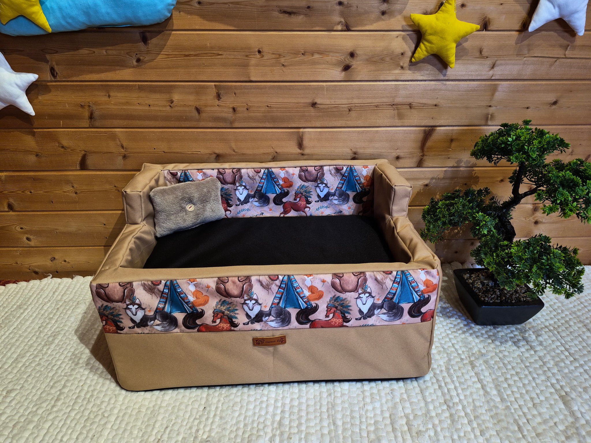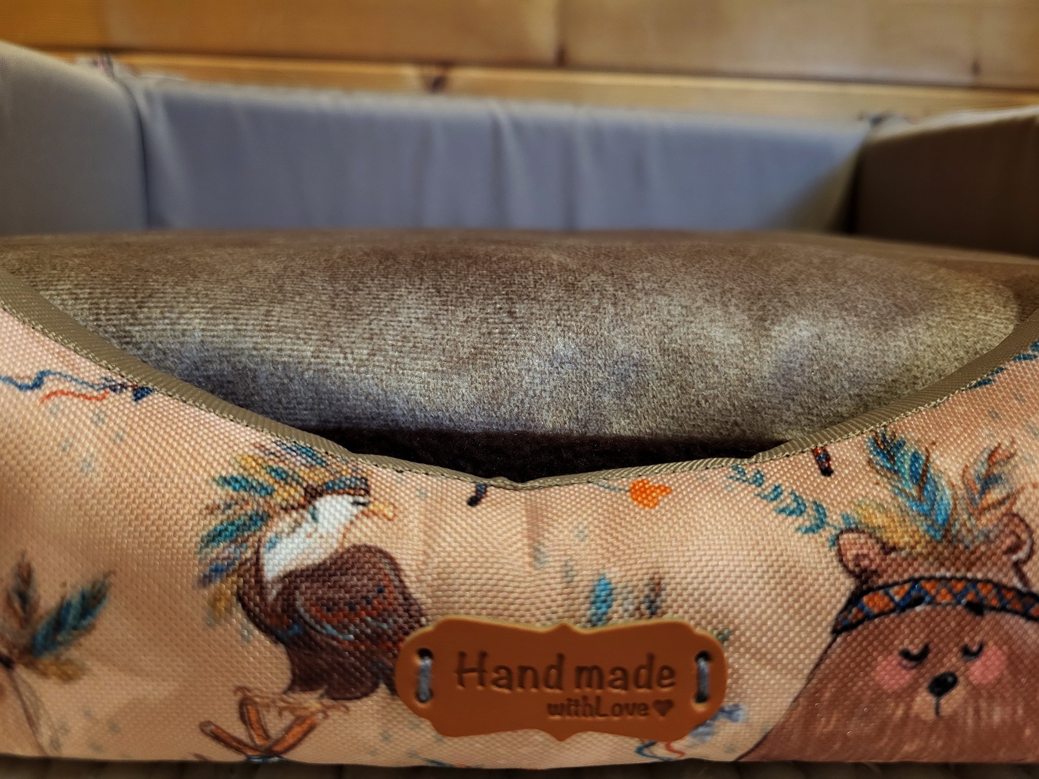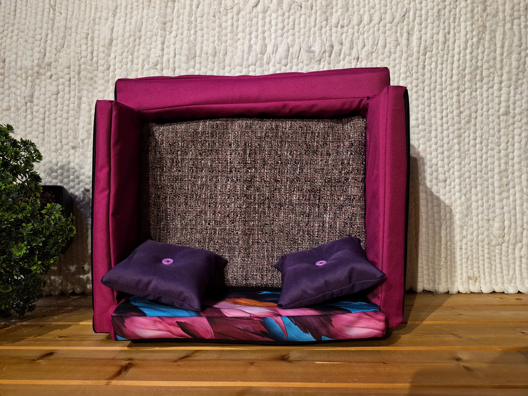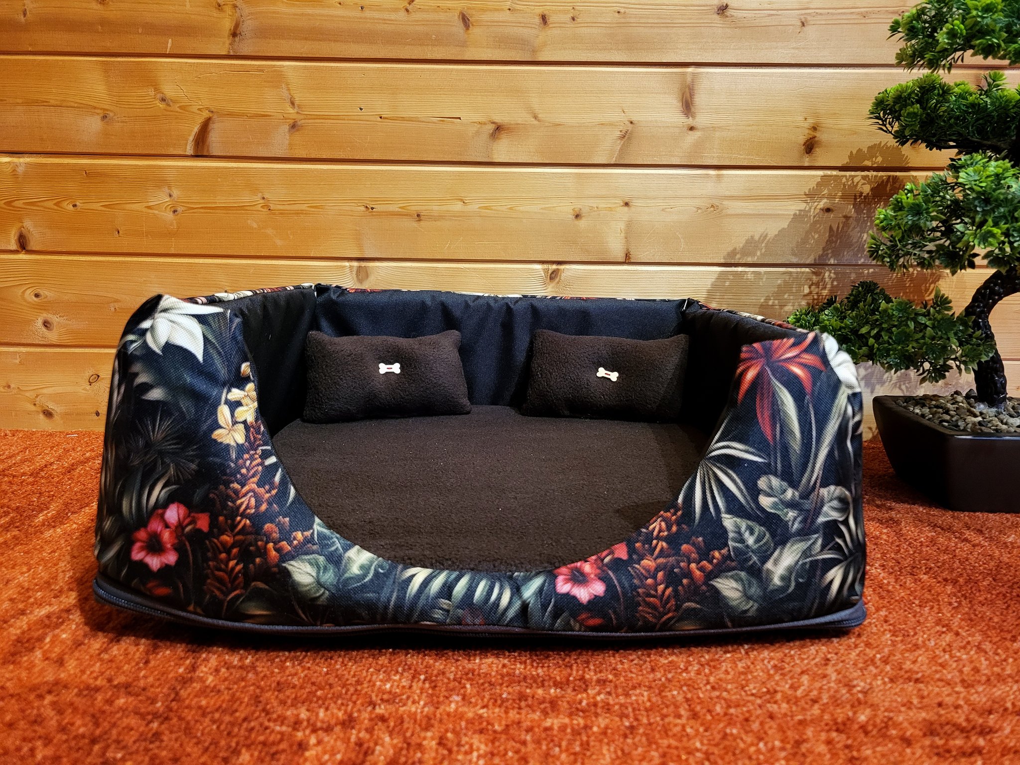 Gyönyörű mintázatú háttámlás fekhely, kényelmes peremmel és puha belső matraccal.