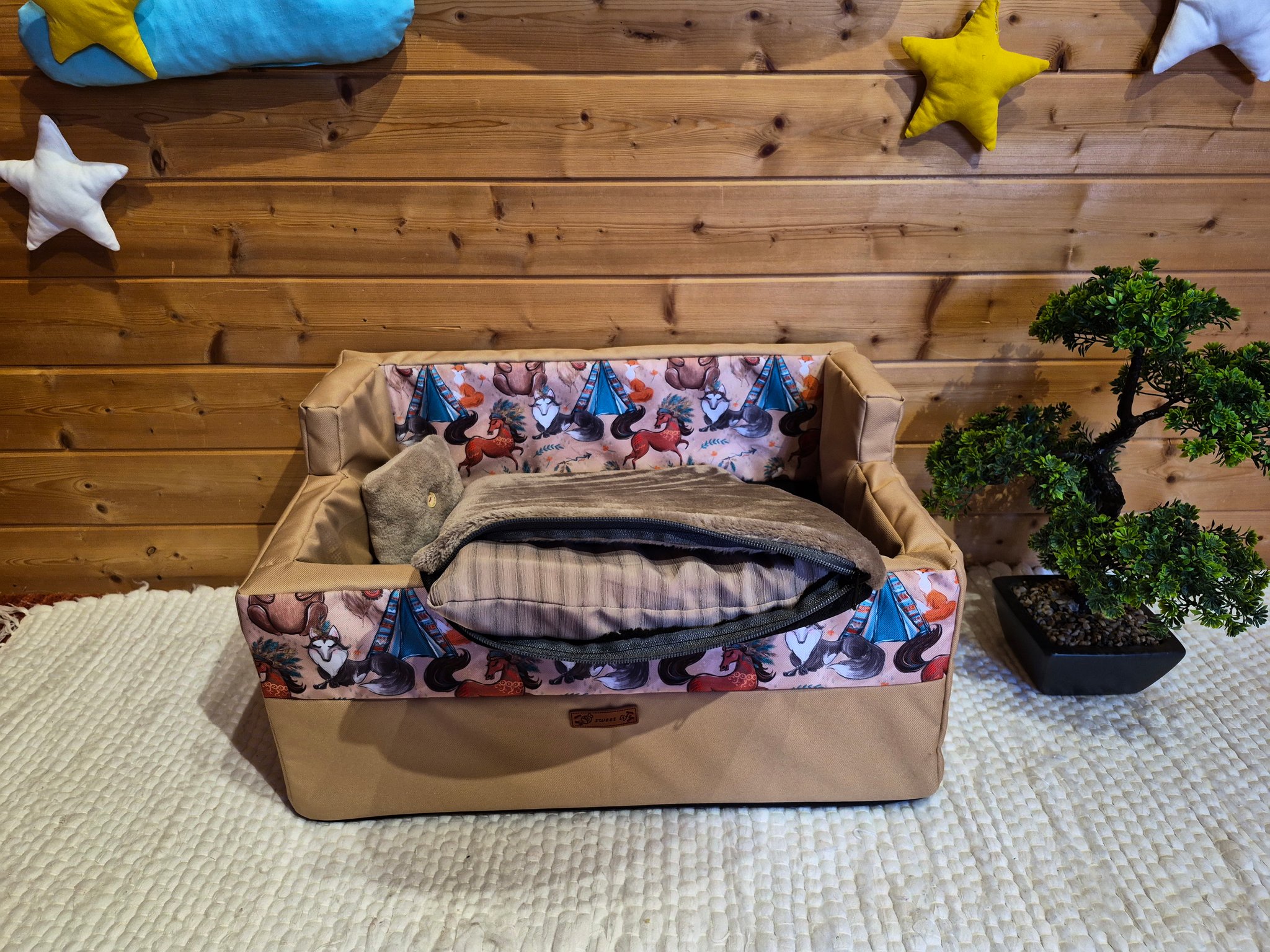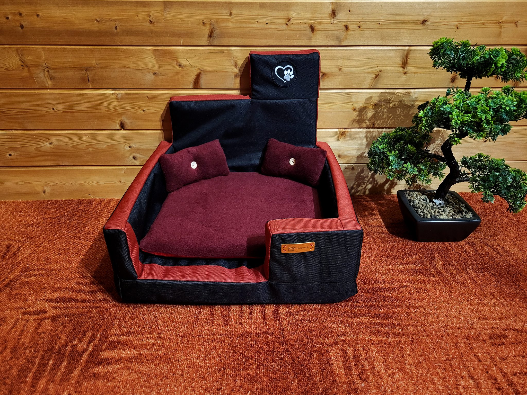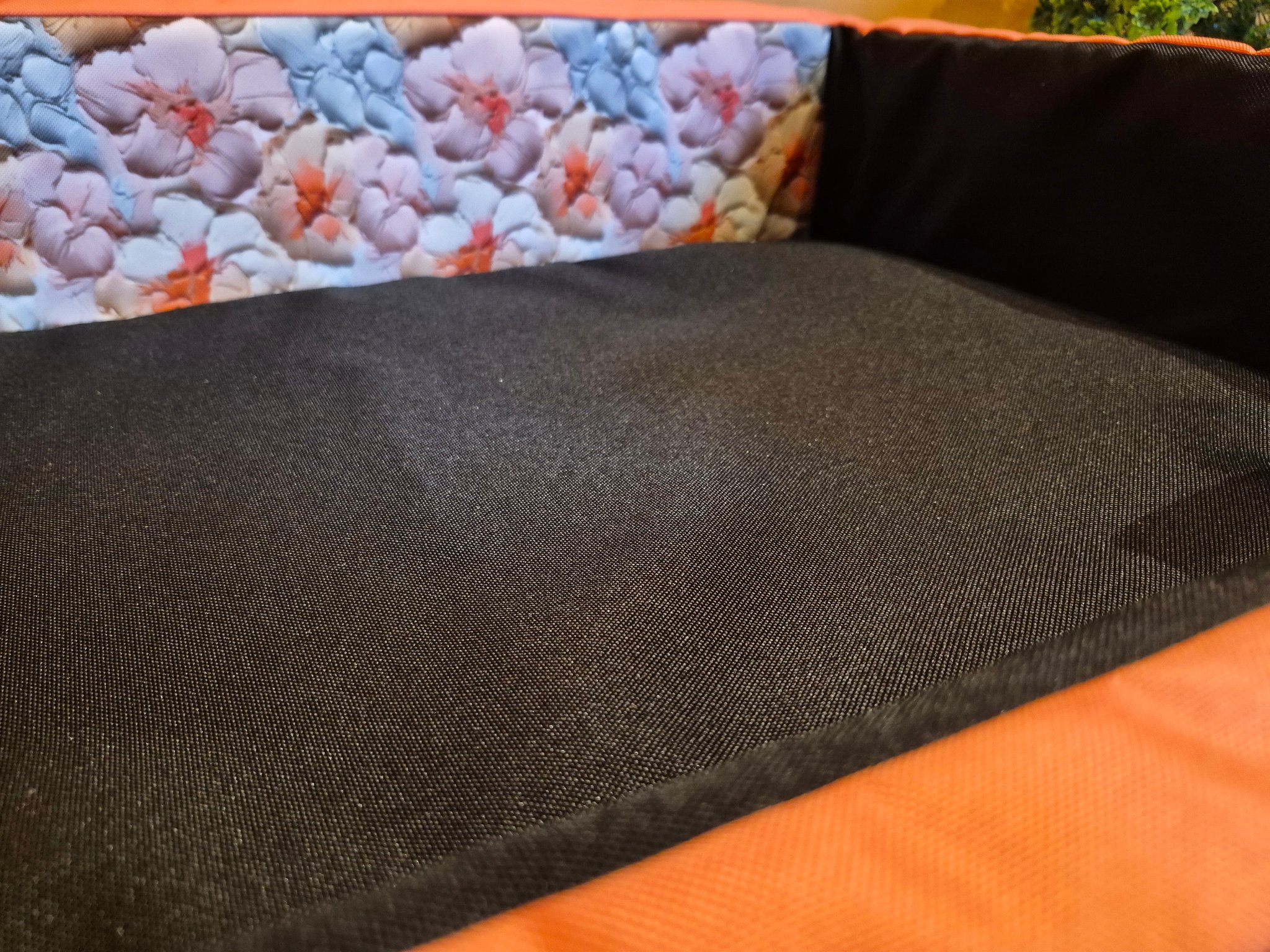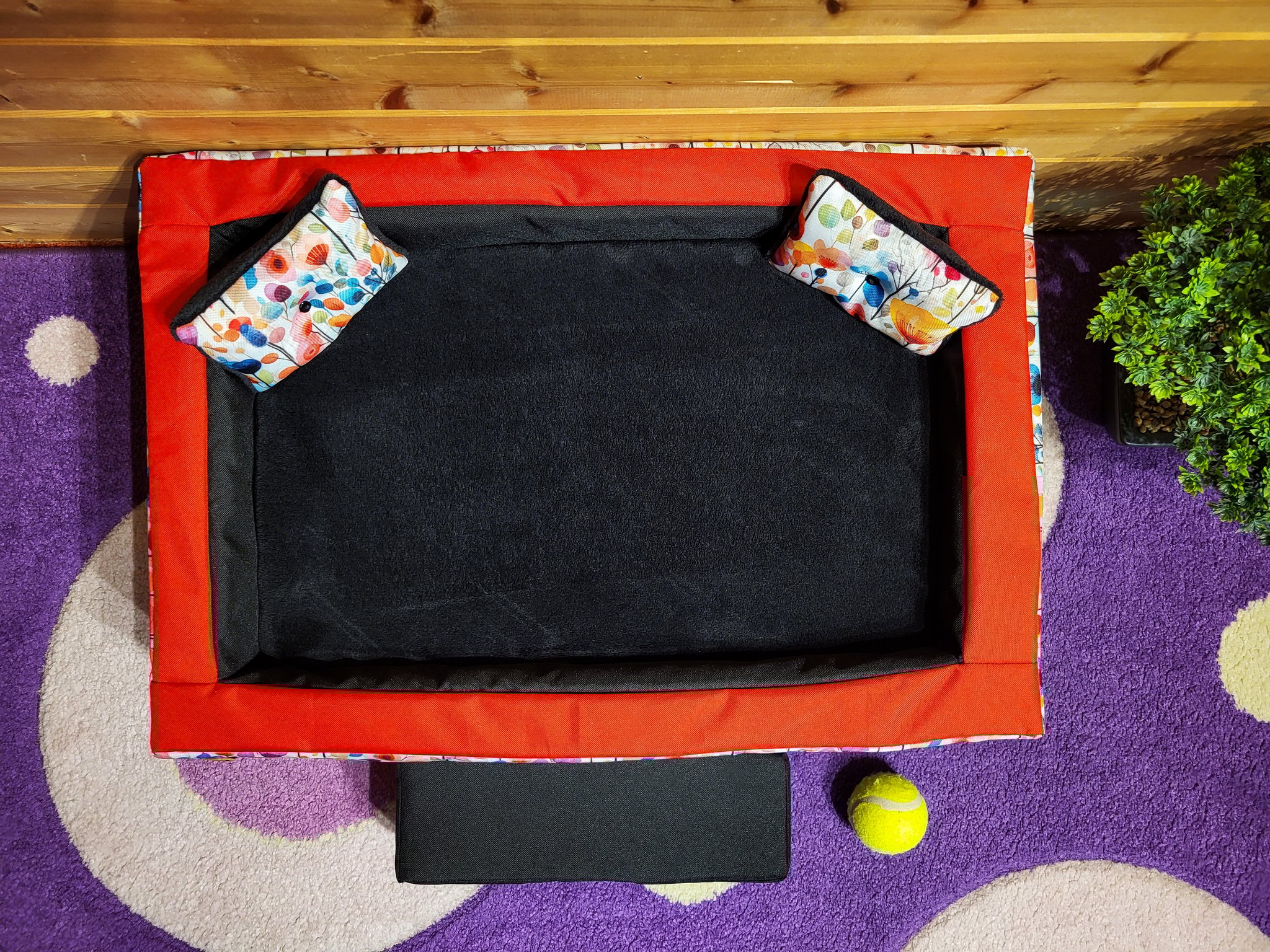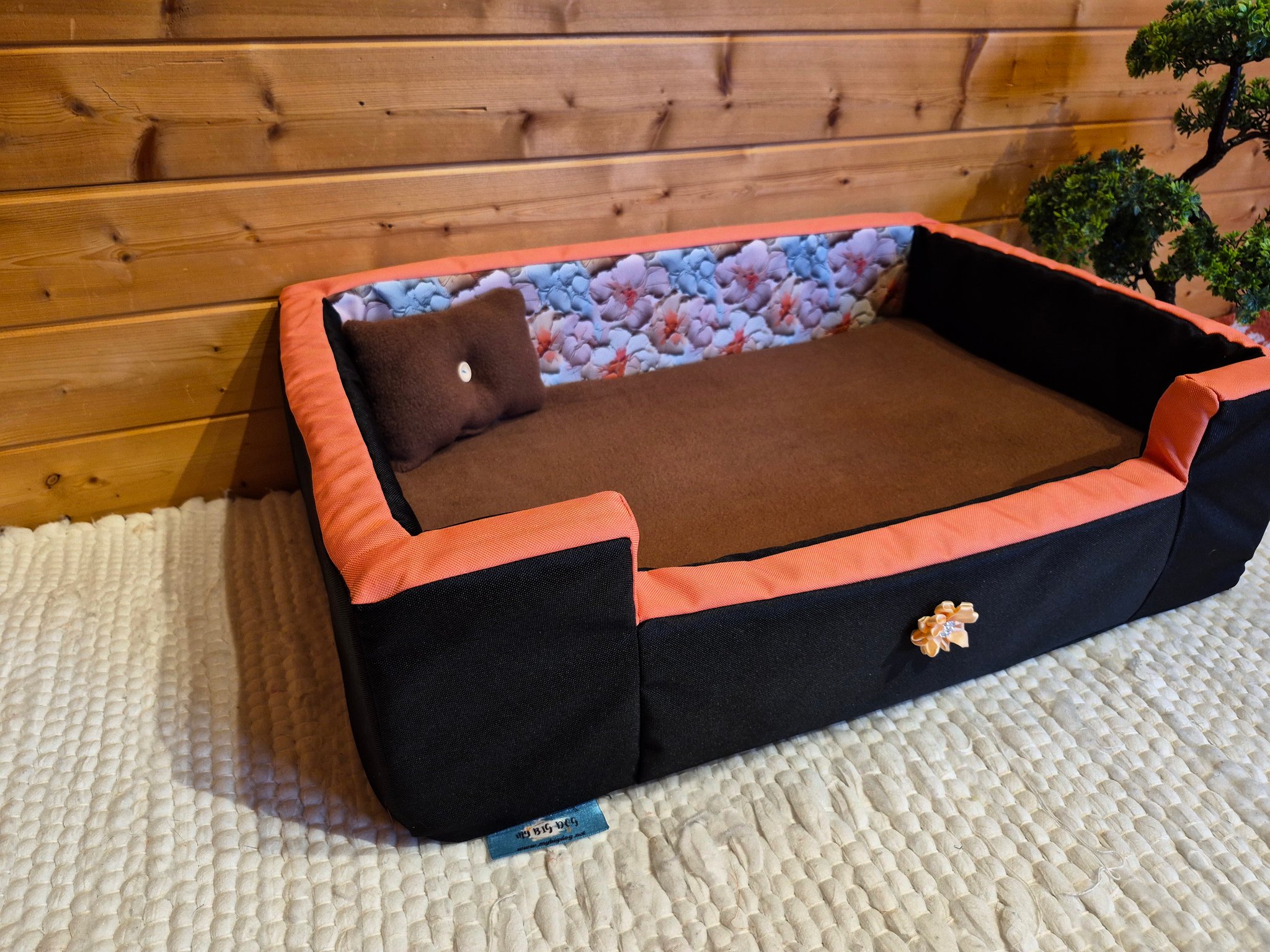 Gyönyörű mintázatú háttámlás fekhely, kényelmes peremmel és puha belső matraccal.
