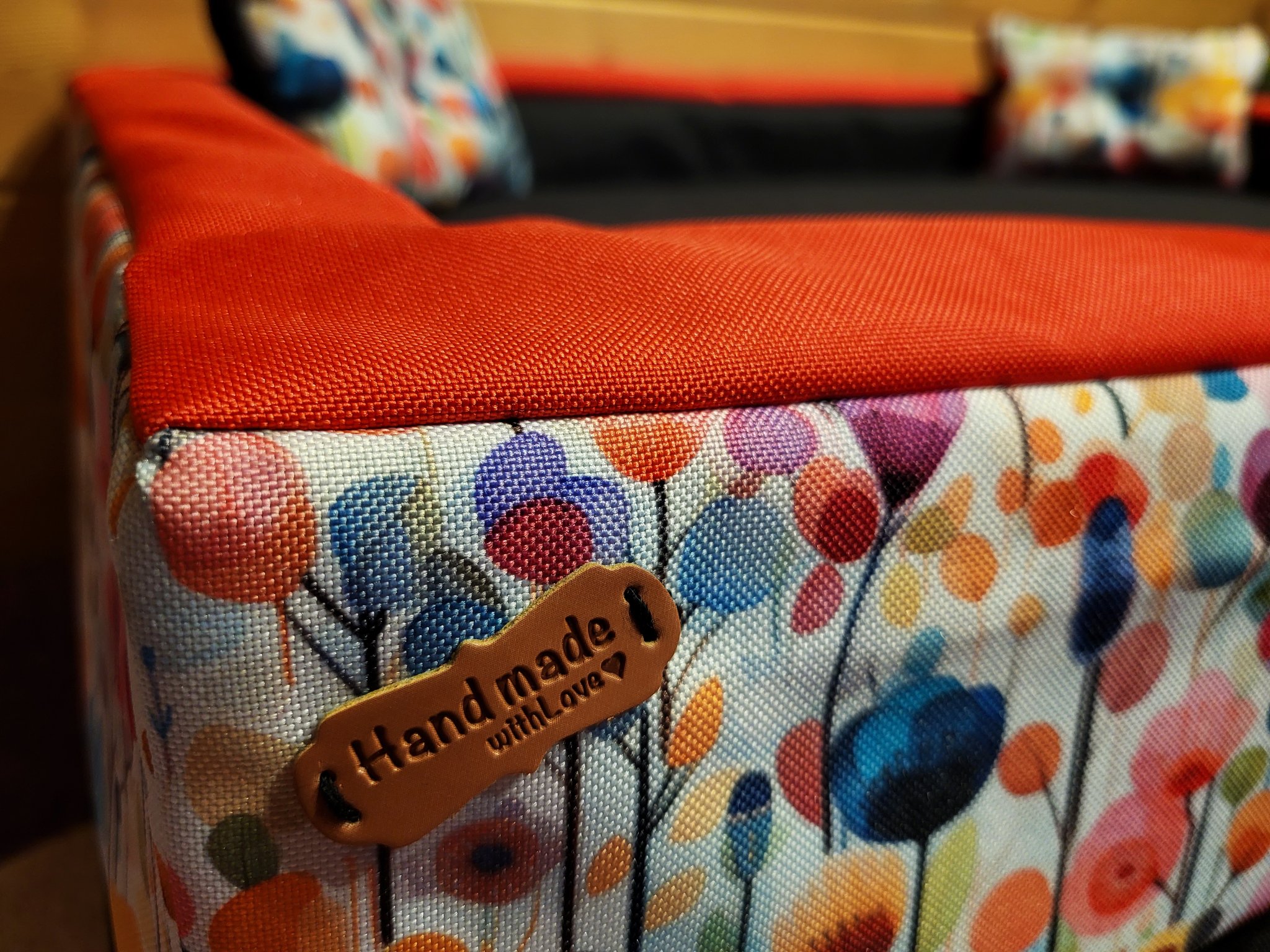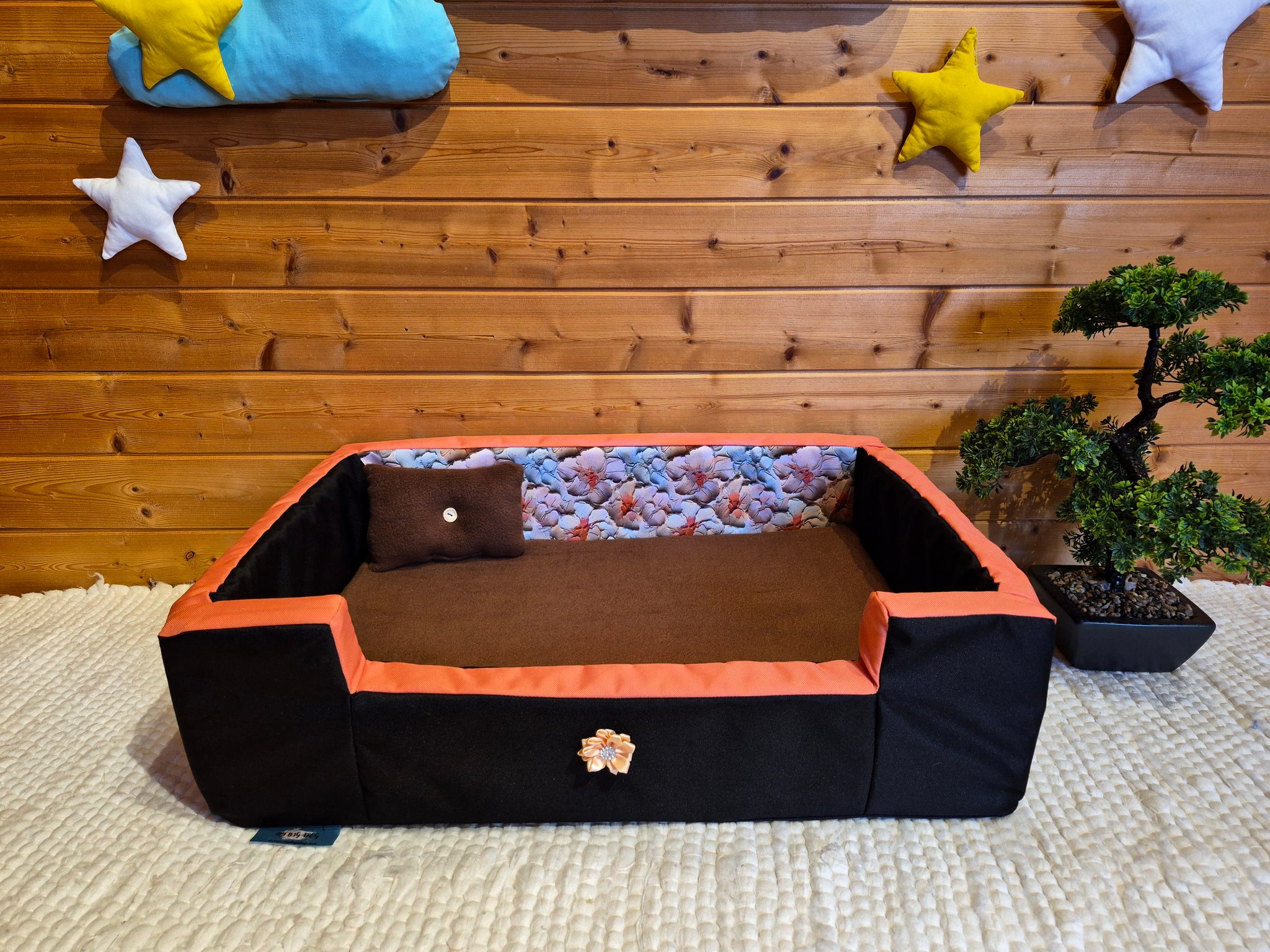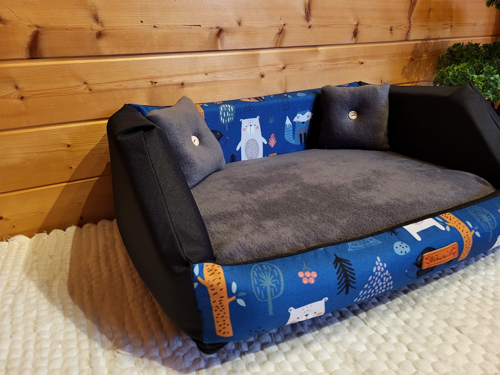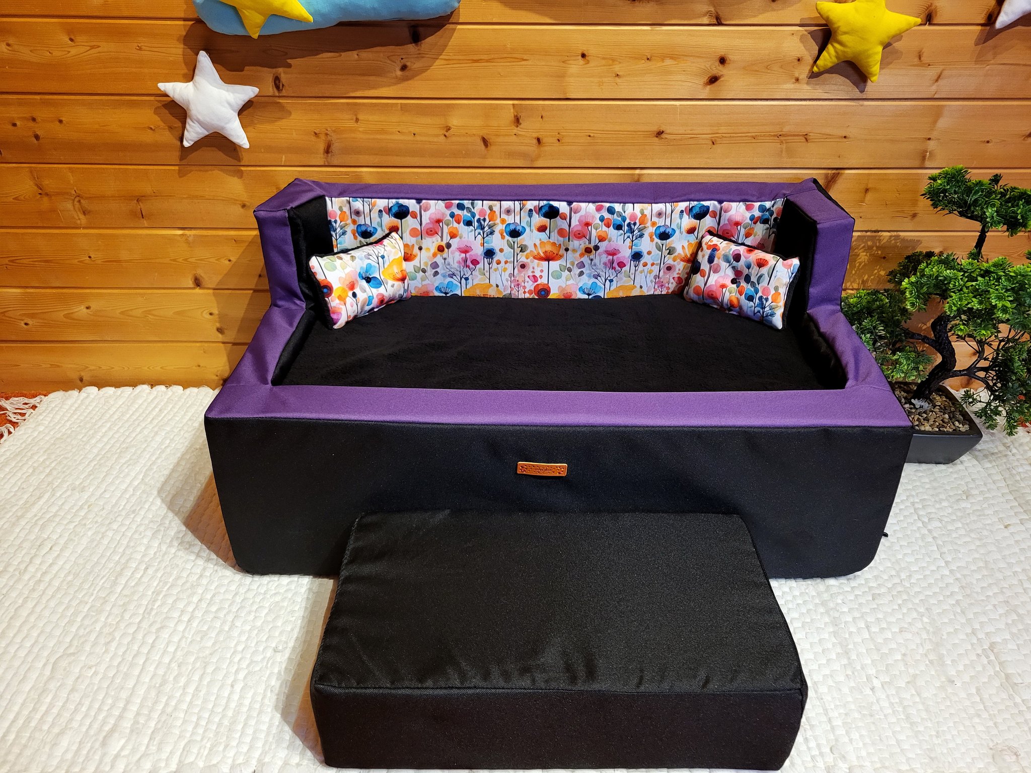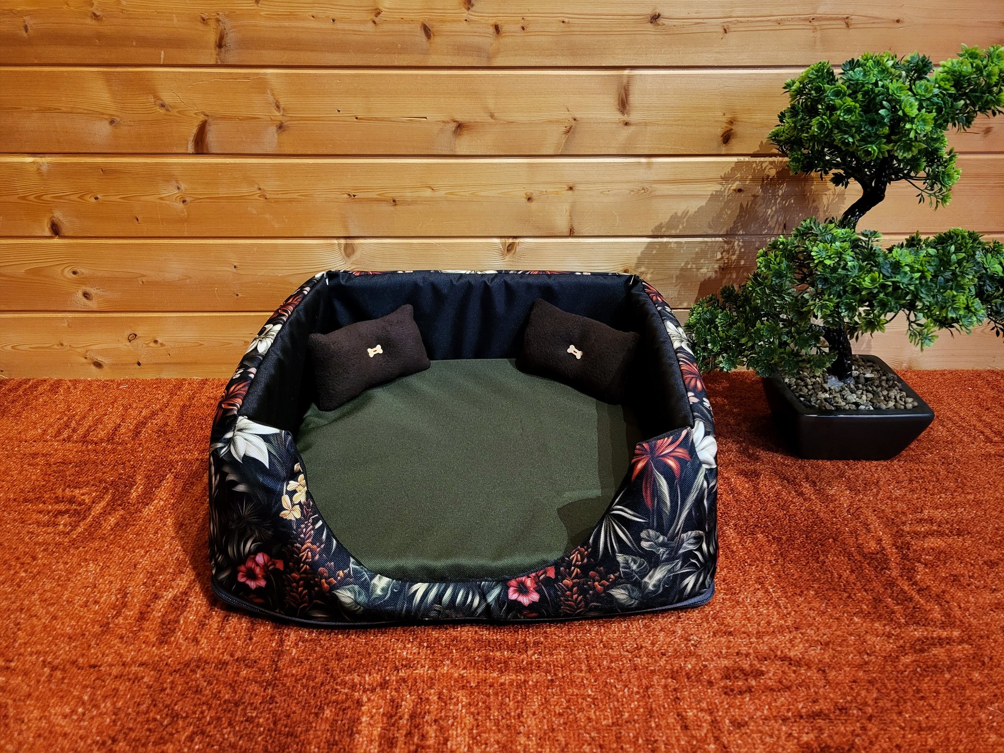 Gyönyörű mintázatú háttámlás fekhely, kényelmes peremmel és puha belső matraccal.