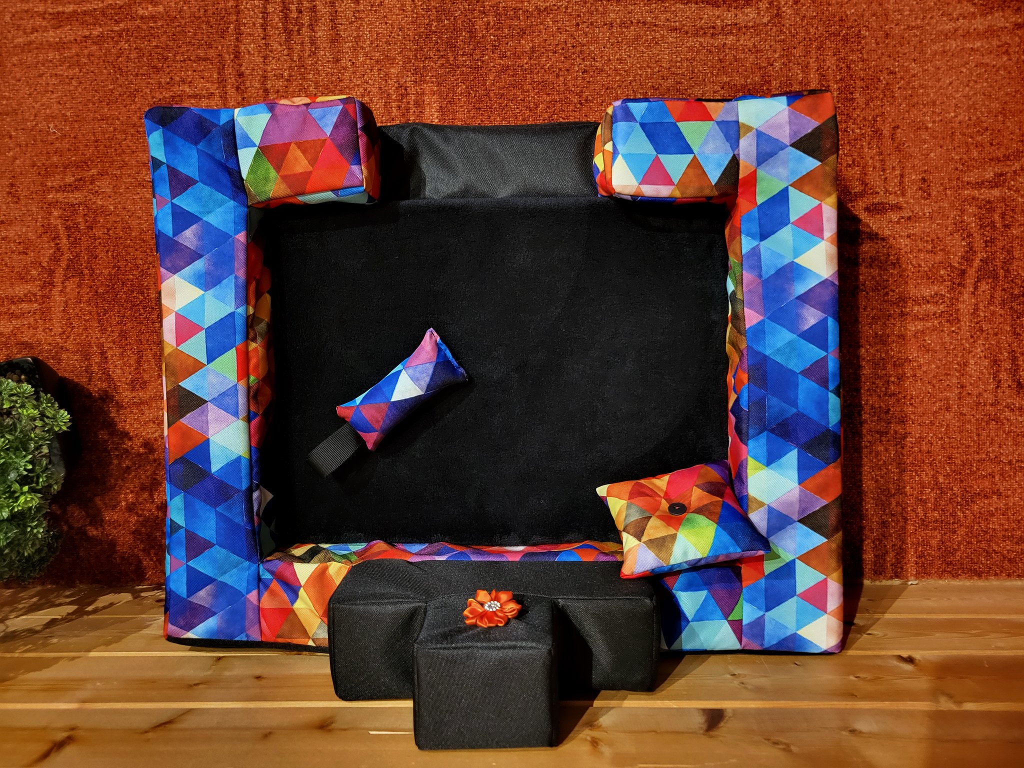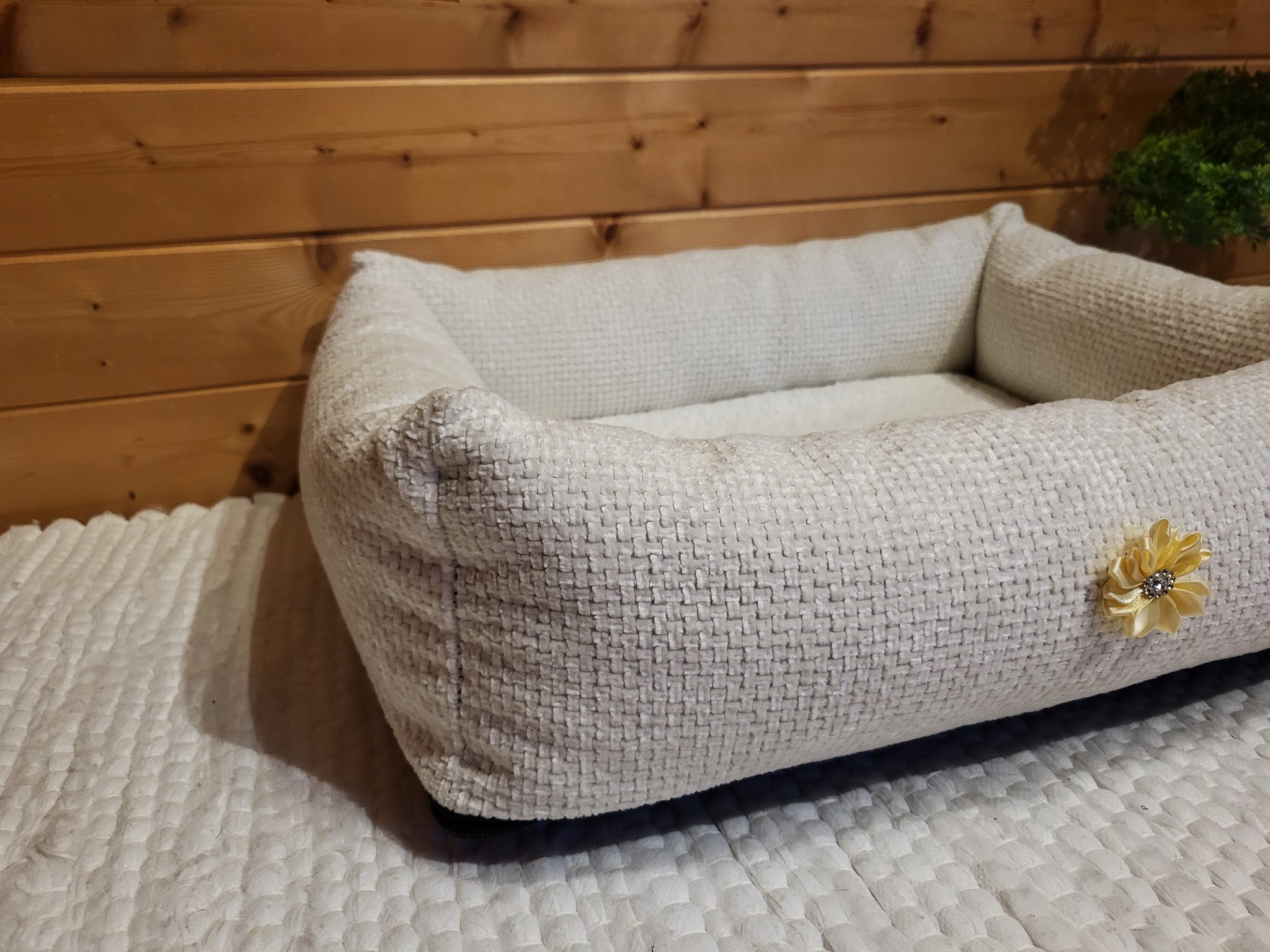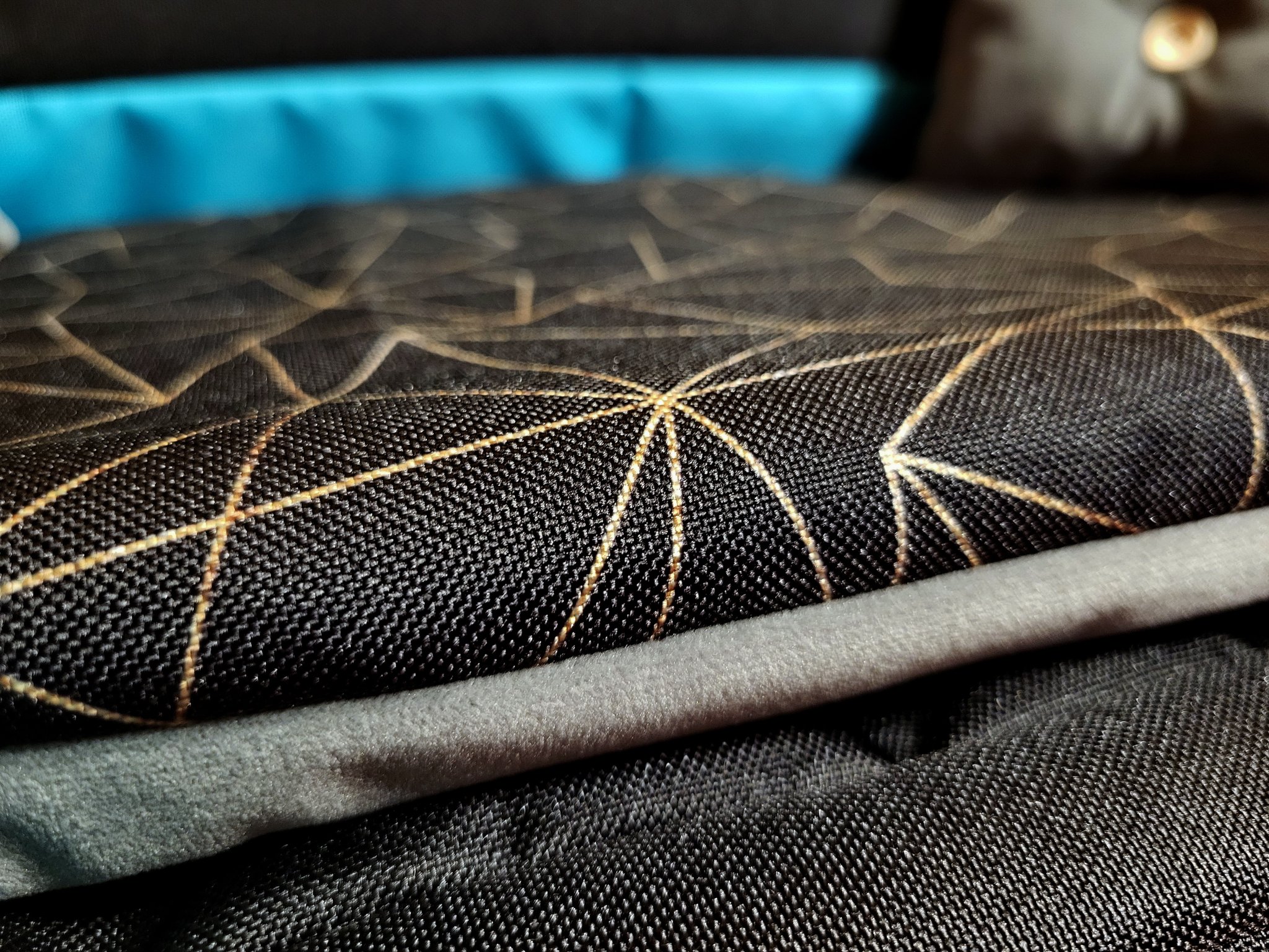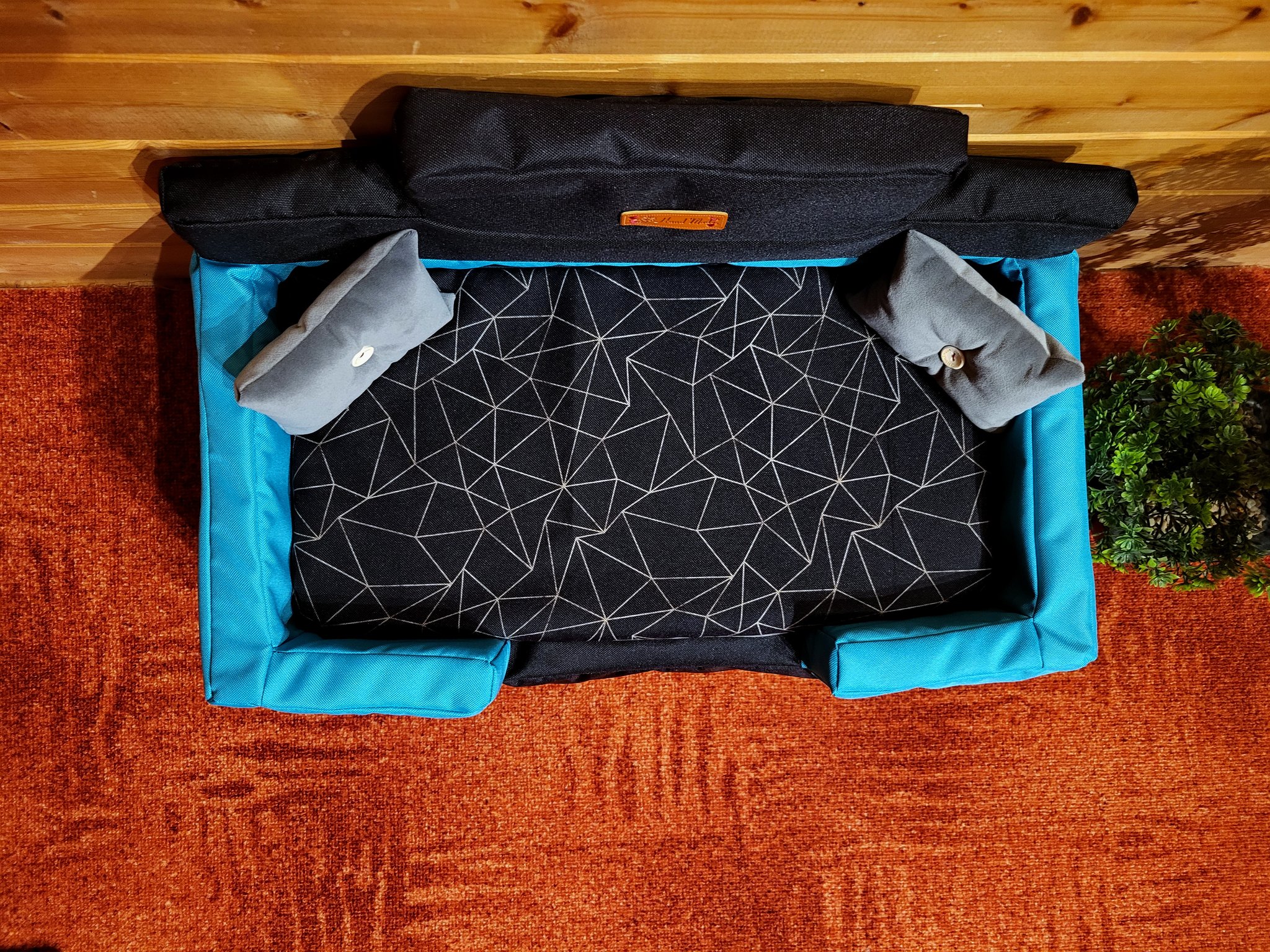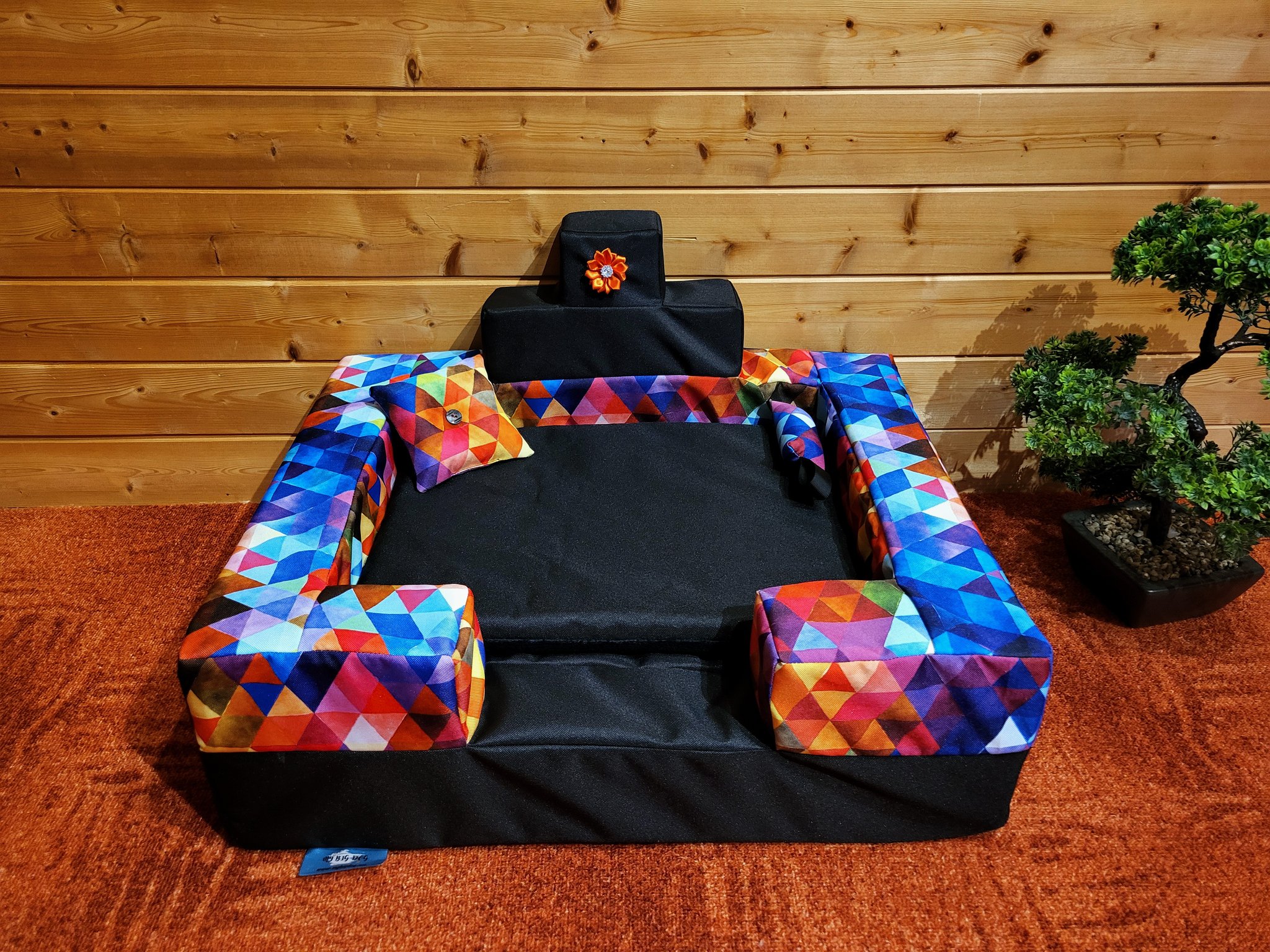 Gyönyörű mintázatú háttámlás fekhely, kényelmes peremmel és puha belső matraccal.