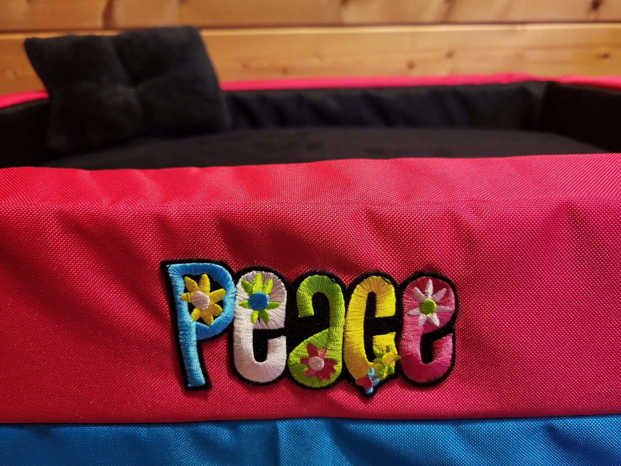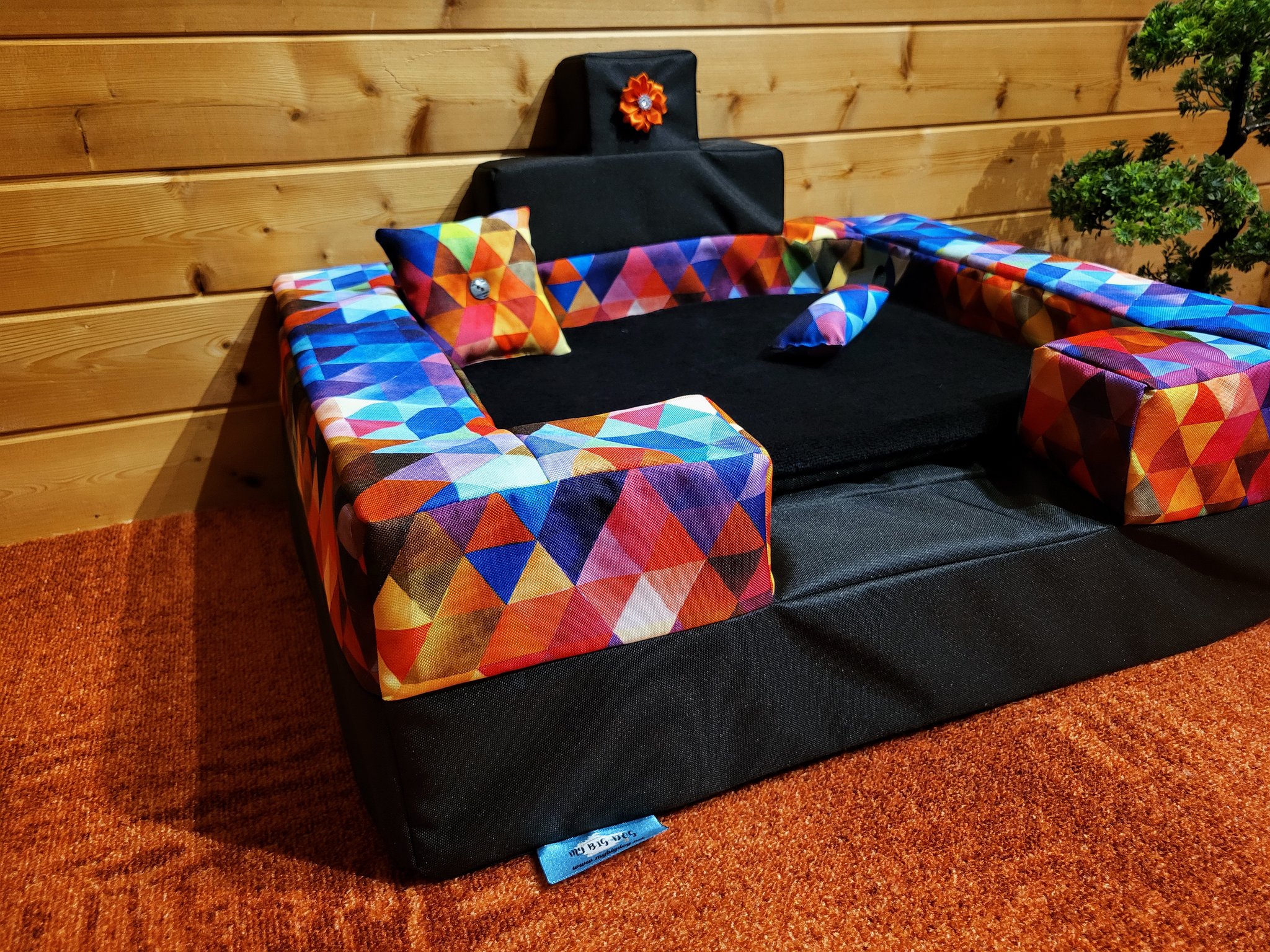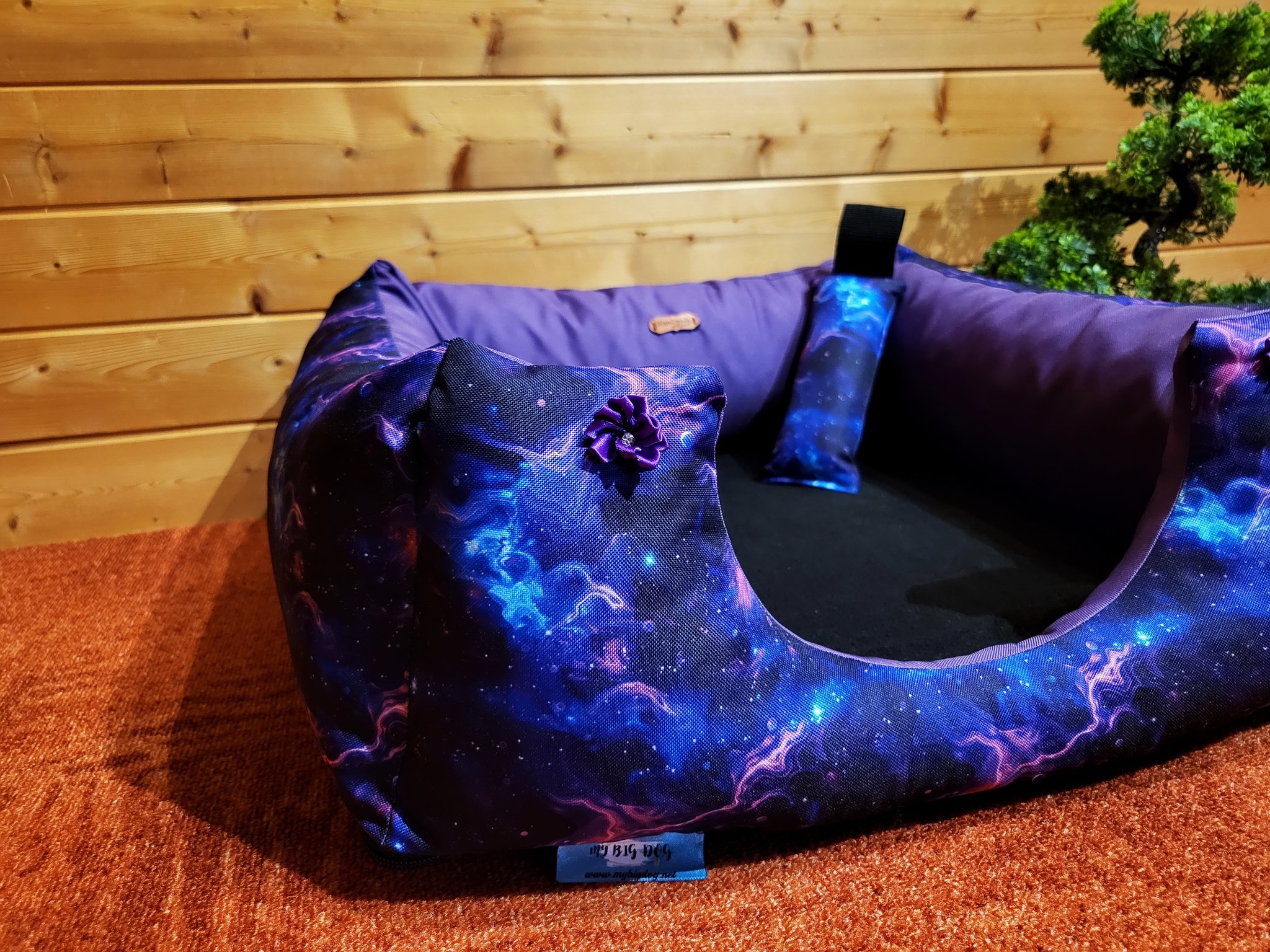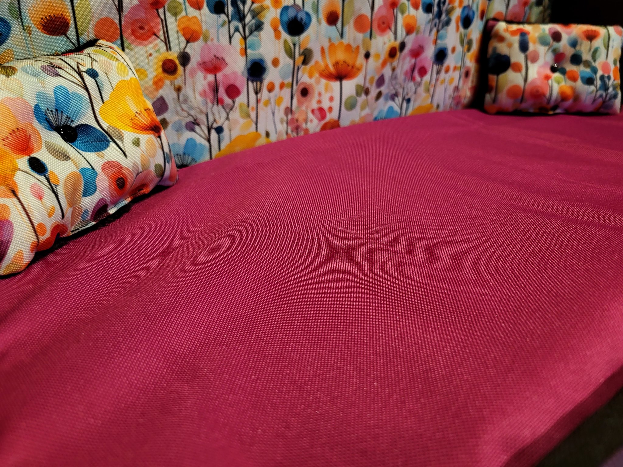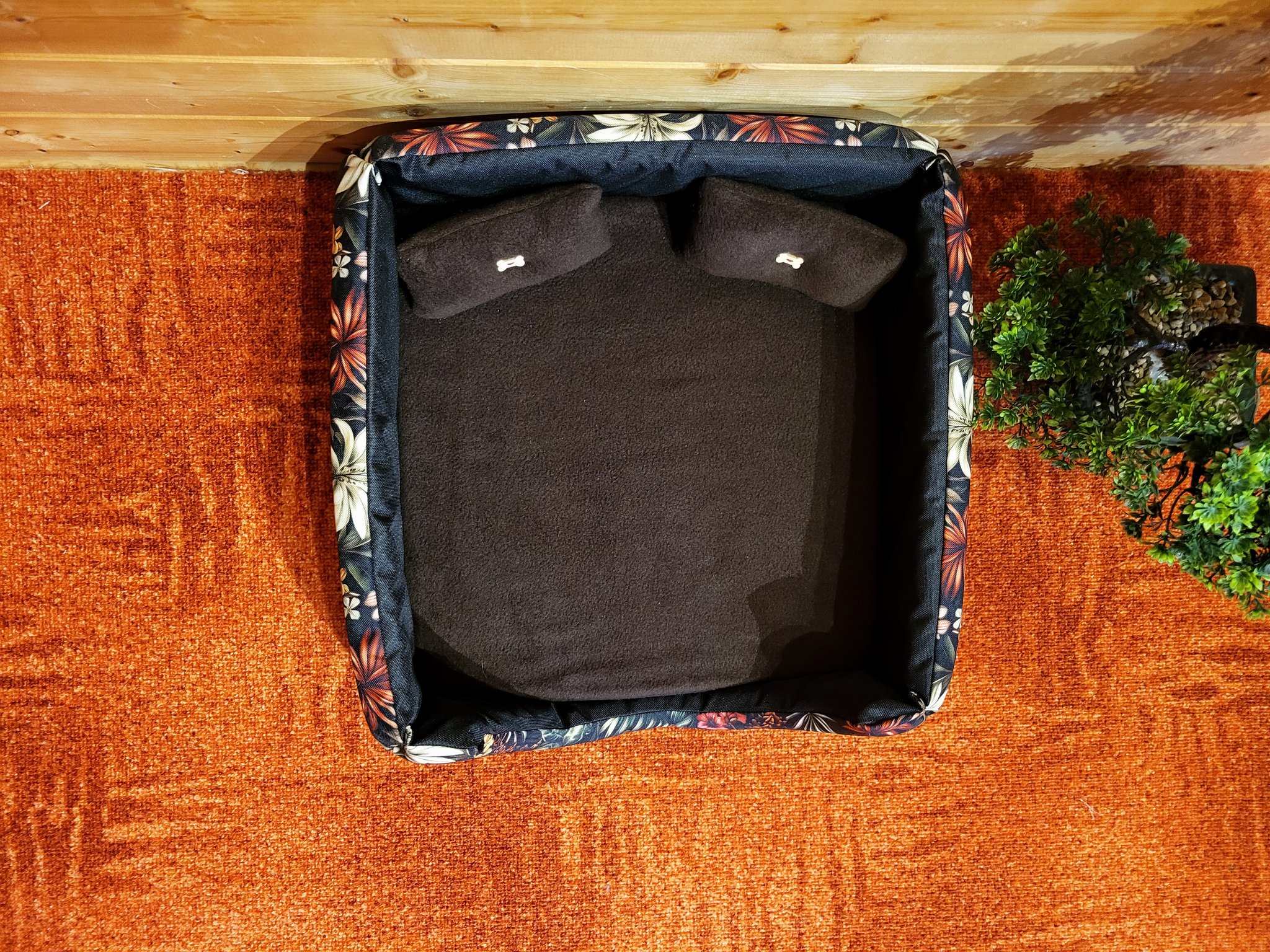 Gyönyörű mintázatú háttámlás fekhely, kényelmes peremmel és puha belső matraccal.