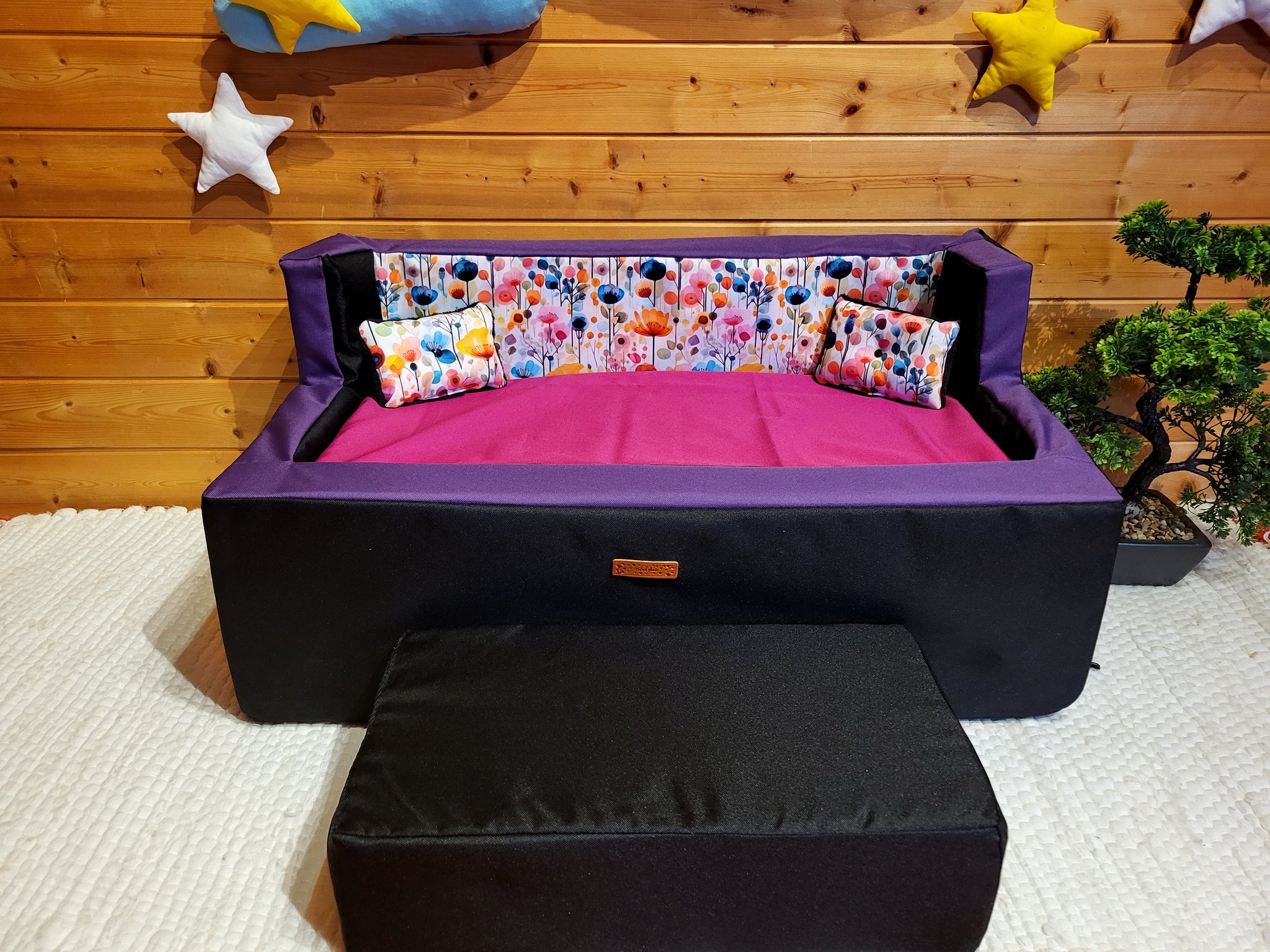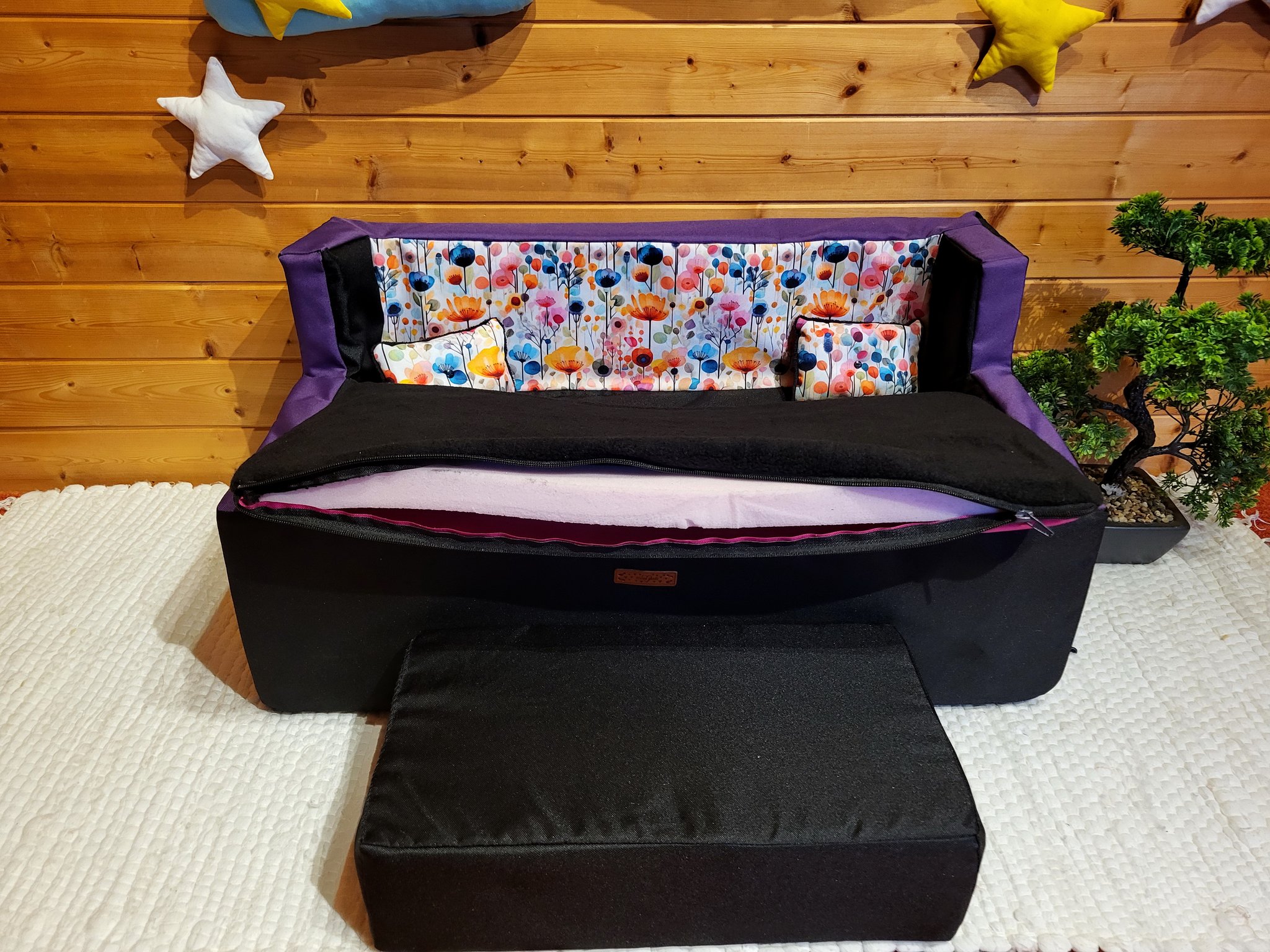 A kis lépcső vastag, erős tépőzárral erősíthető a fekhelyhez