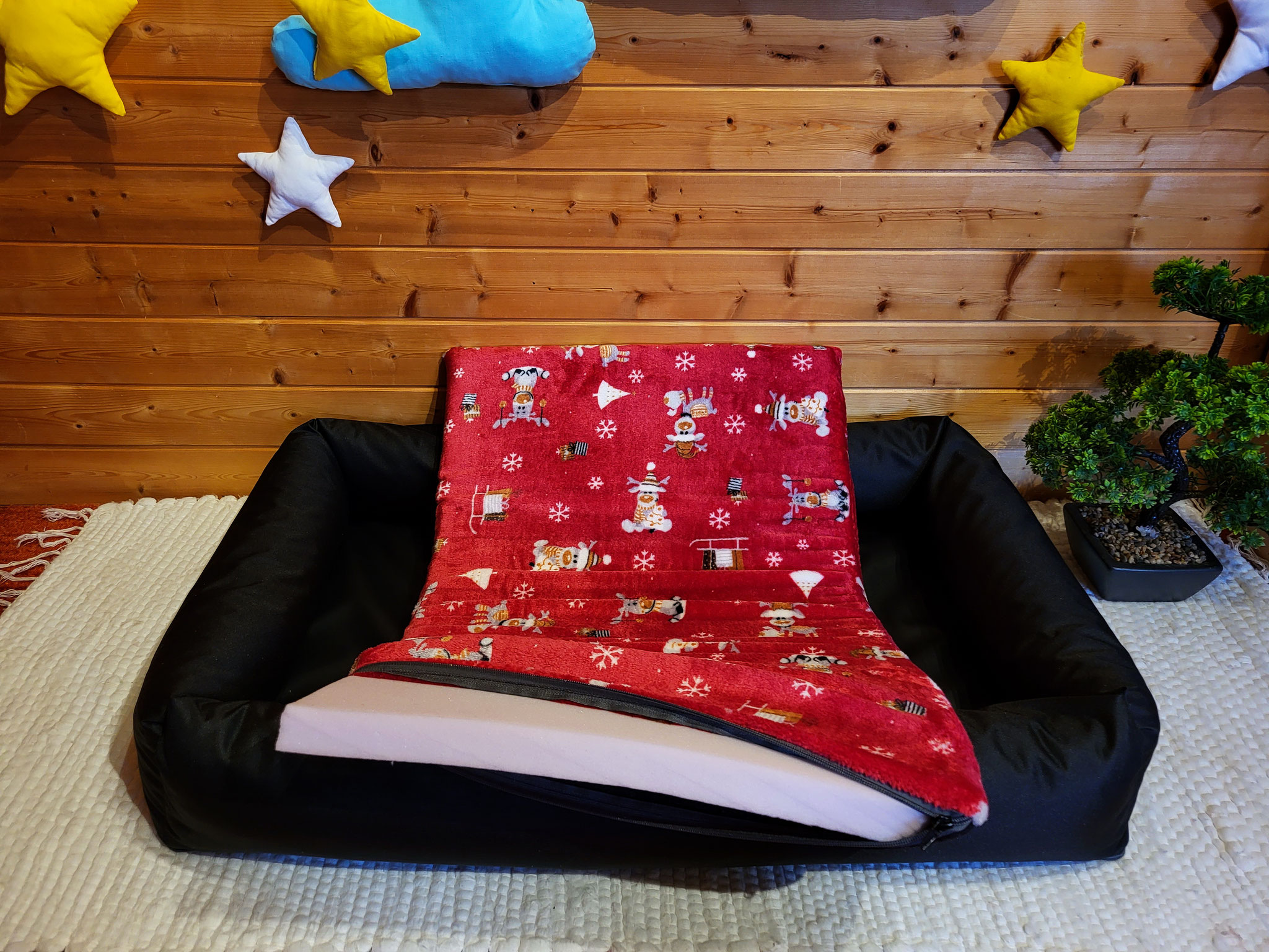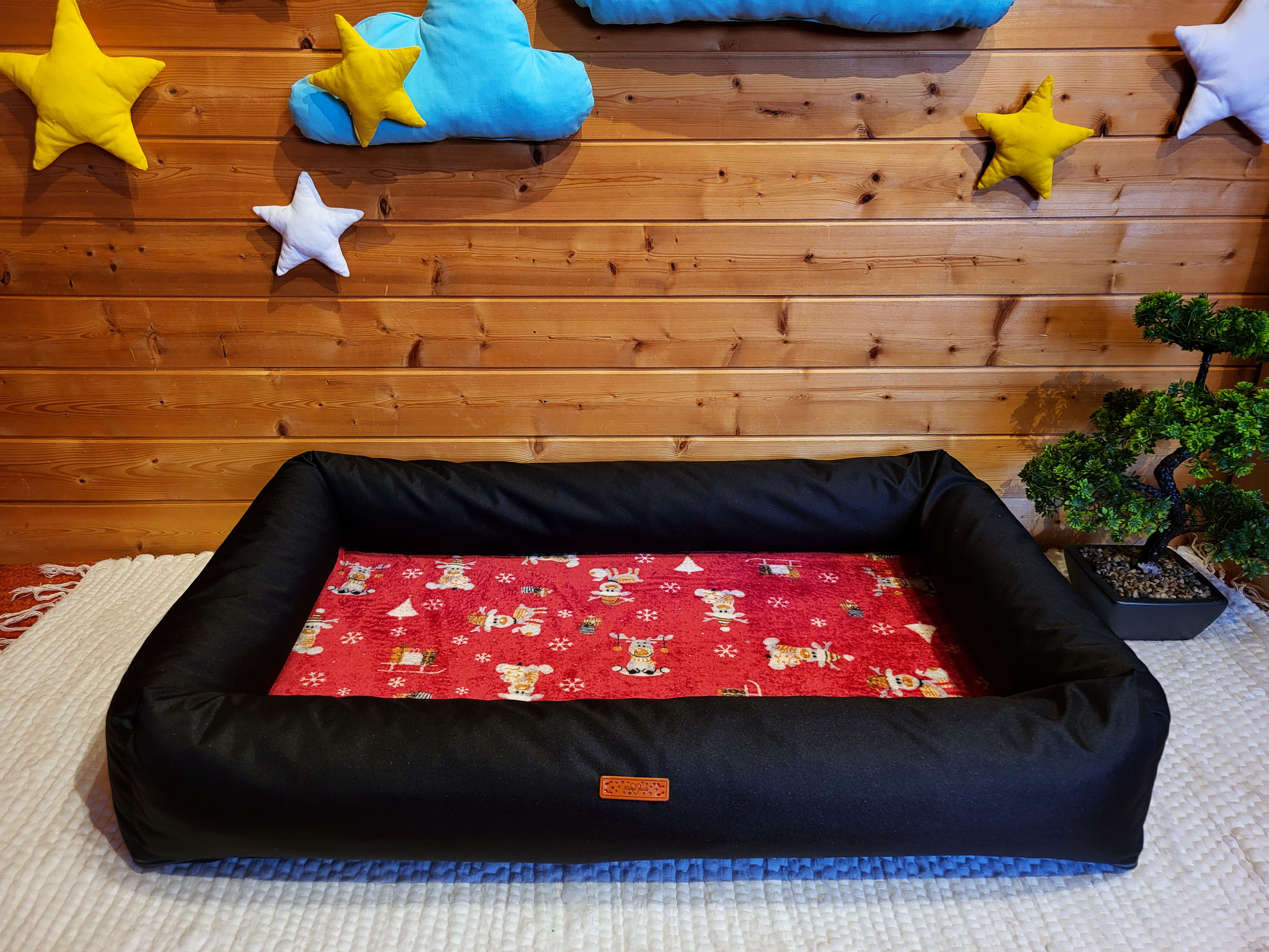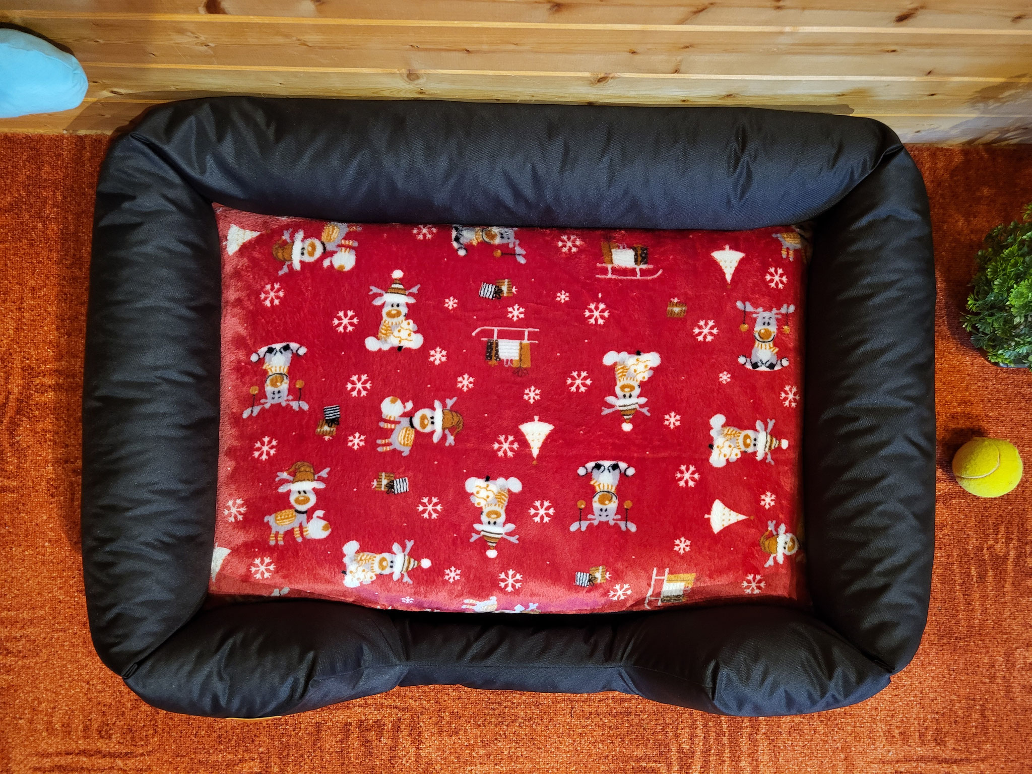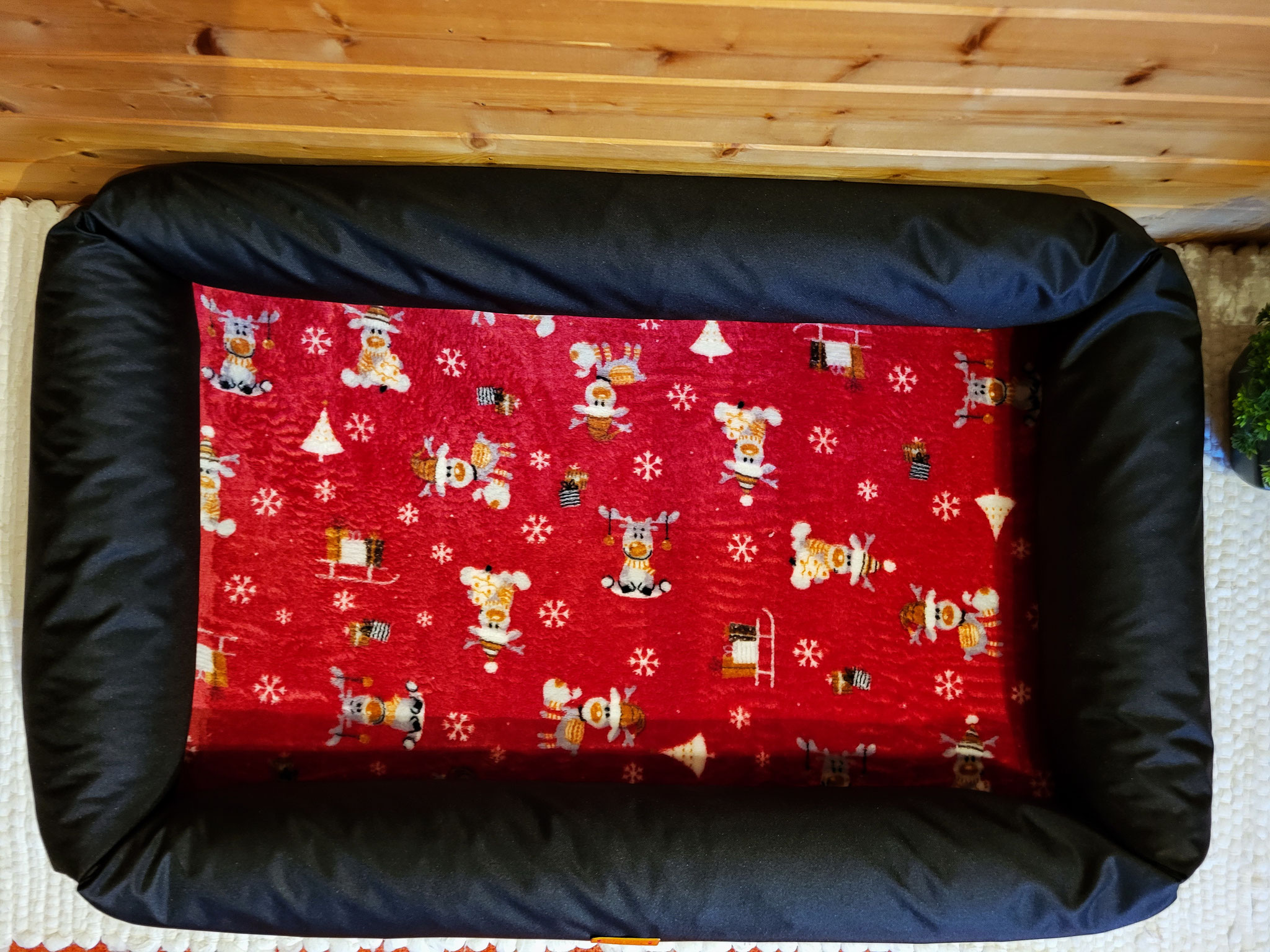 Karácsonyi mintázatú fekhely, egyszerű, de praktikus kialakítással, masszív, letörölhető peremmel.