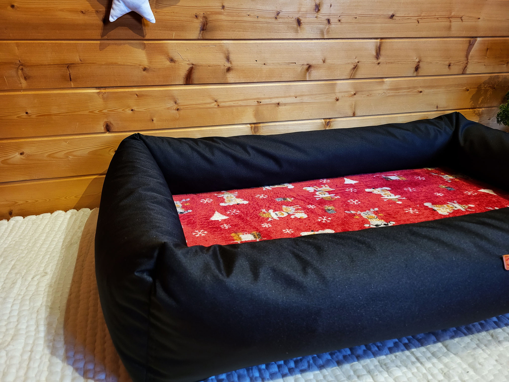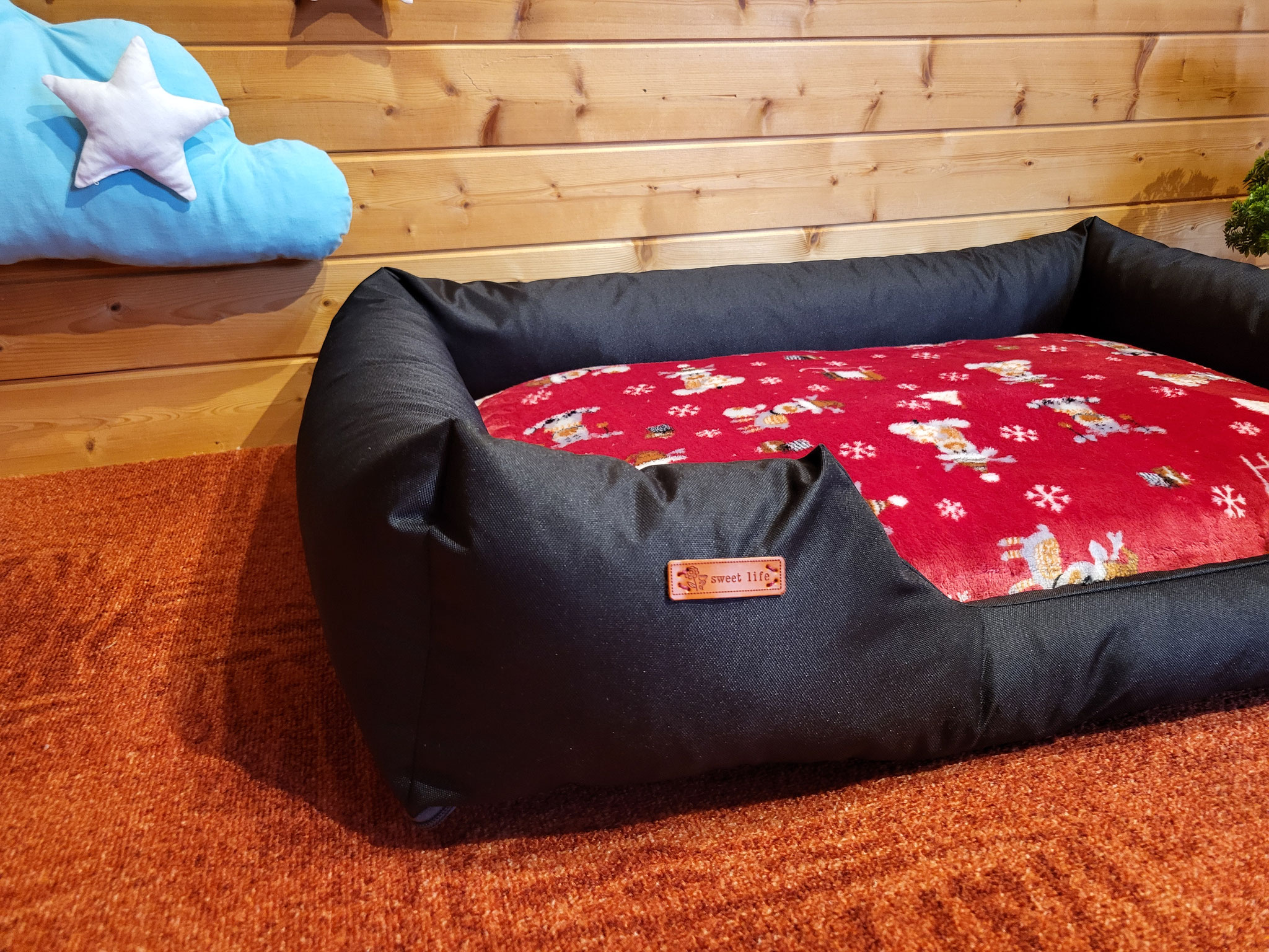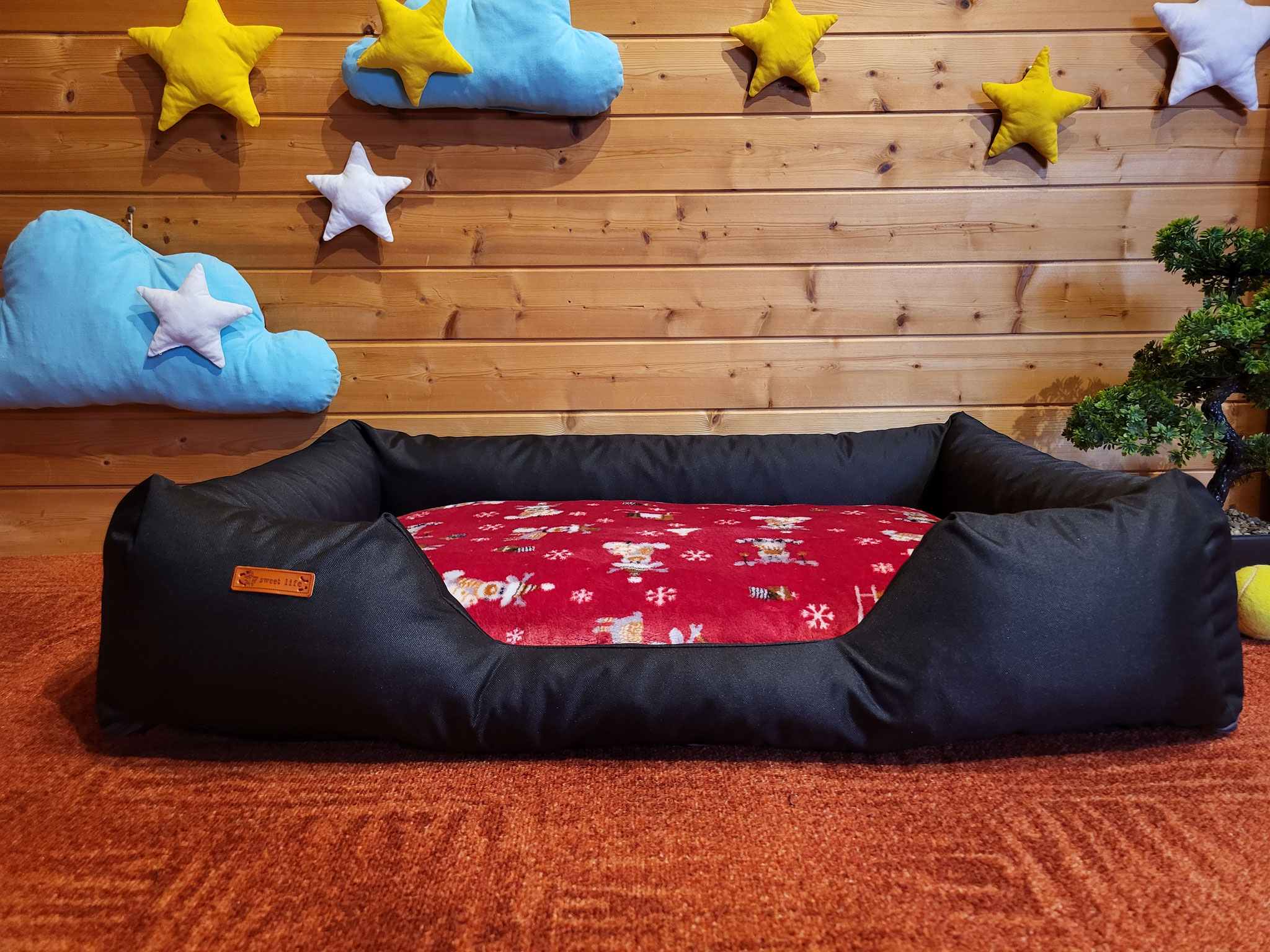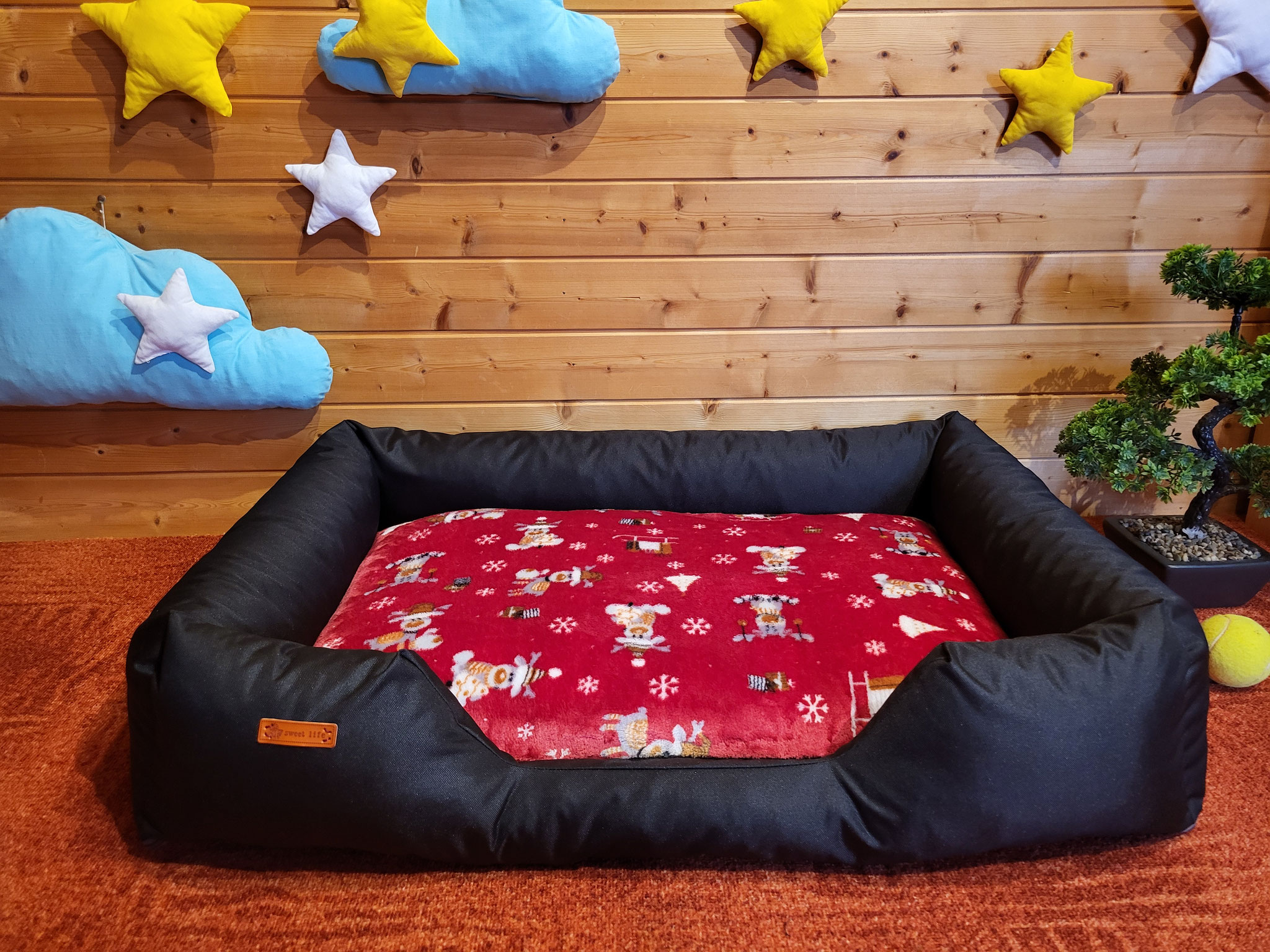 Karácsonyi mintázatú fekhely, egyszerű, de praktikus kialakítással, masszív, letörölhető peremmel.