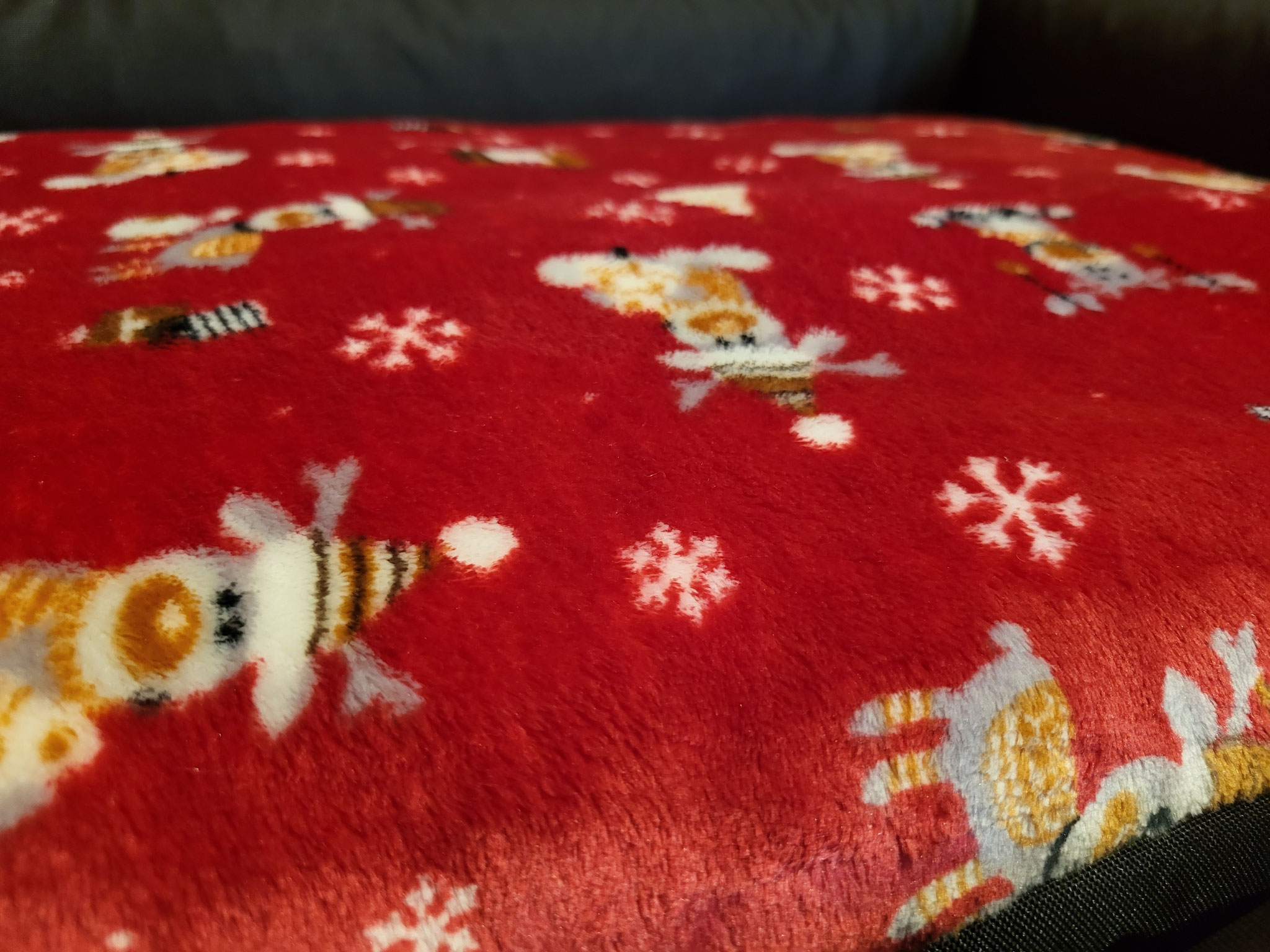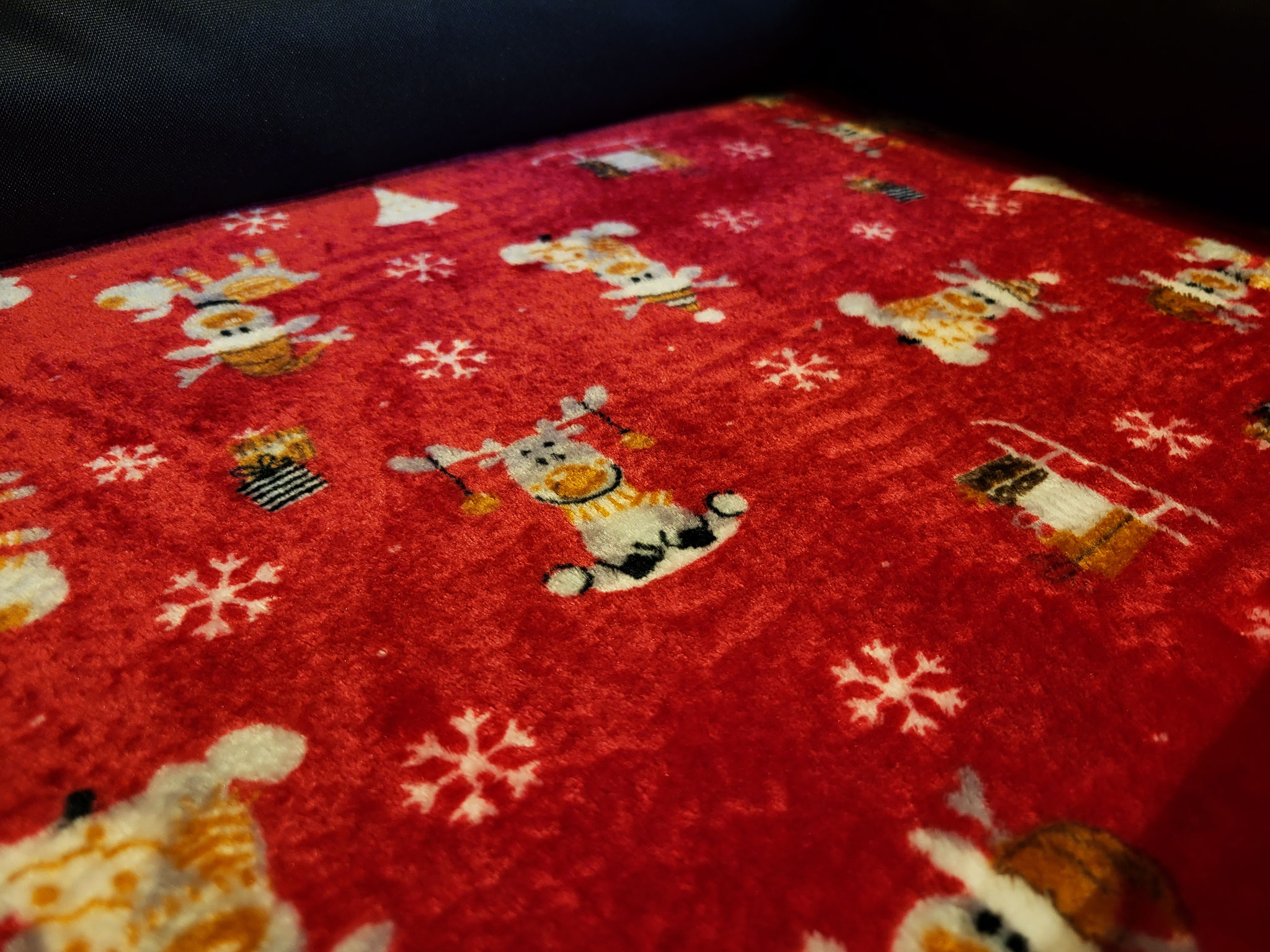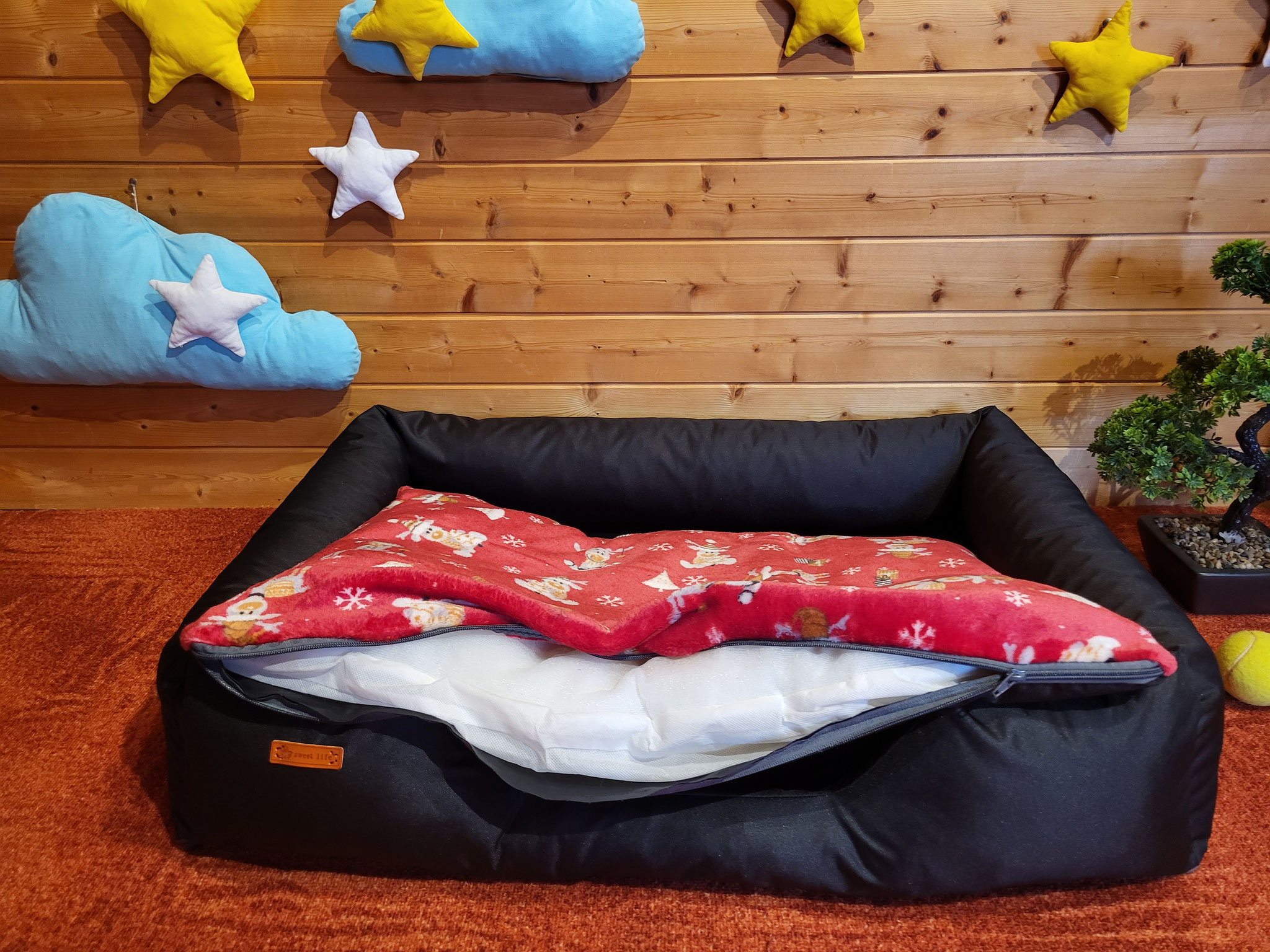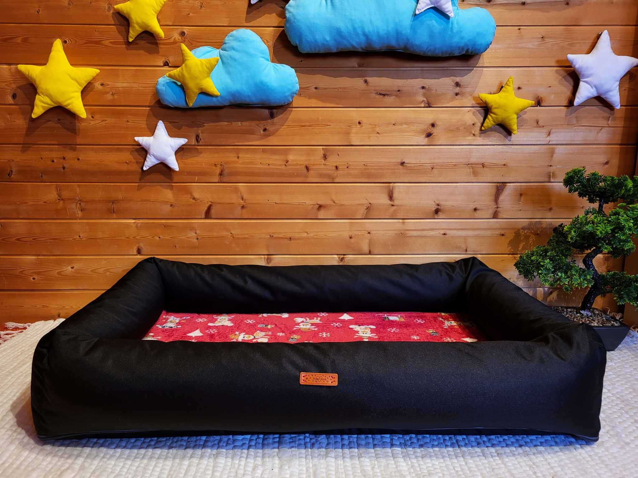 Karácsonyi mintázatú fekhely, egyszerű, de praktikus kialakítással, masszív, letörölhető peremmel.
